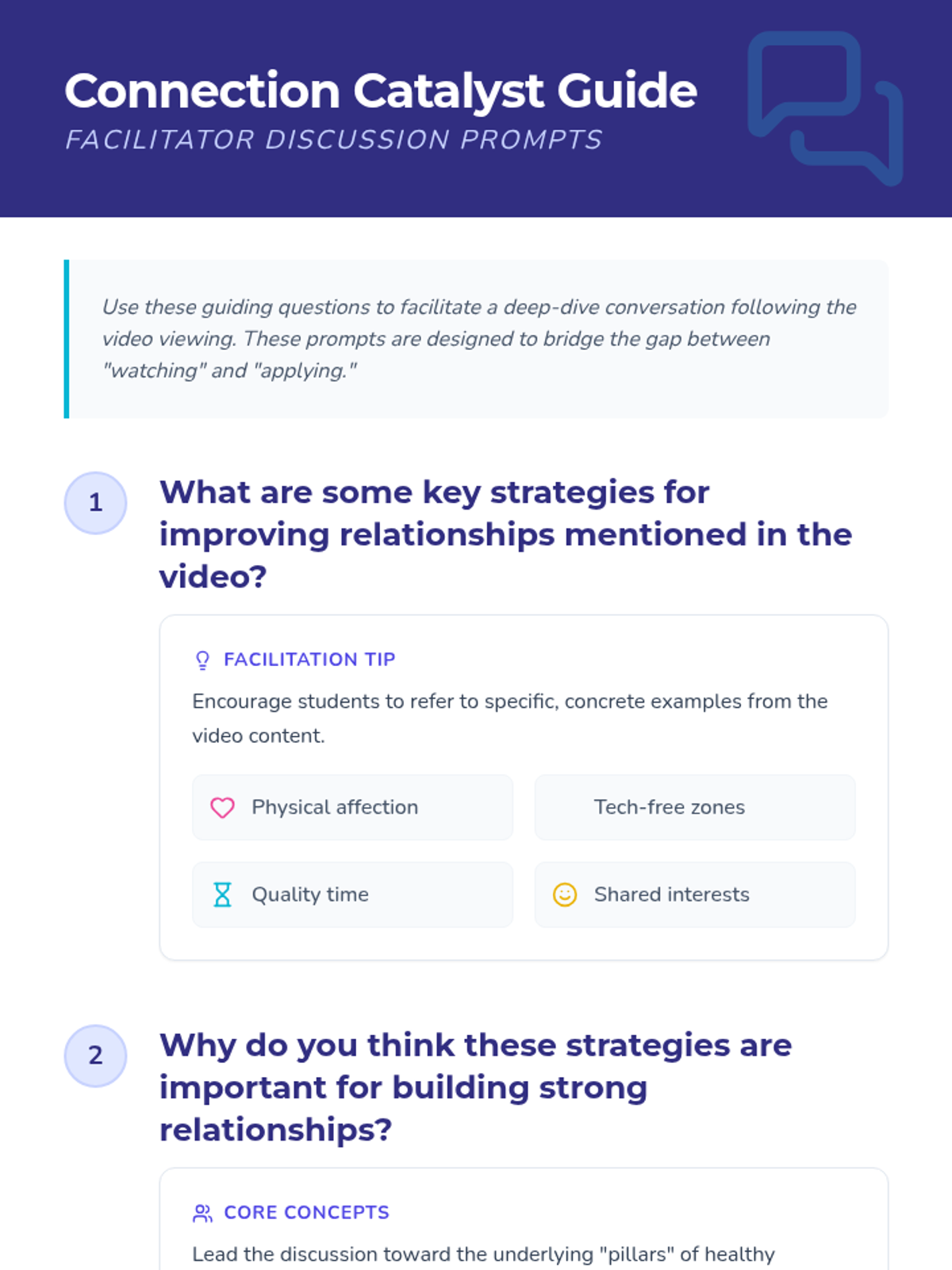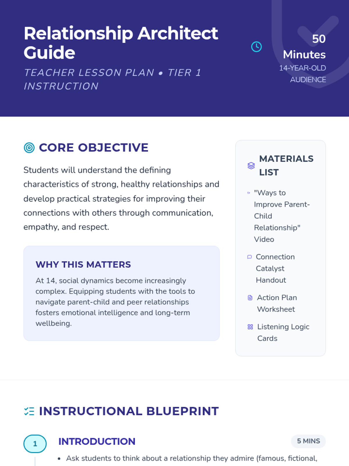 A lesson designed for 14-year-olds to explore the characteristics of healthy relationships, watch a video on improving parent-child connections, and develop actionable plans to strengthen their own social bonds.