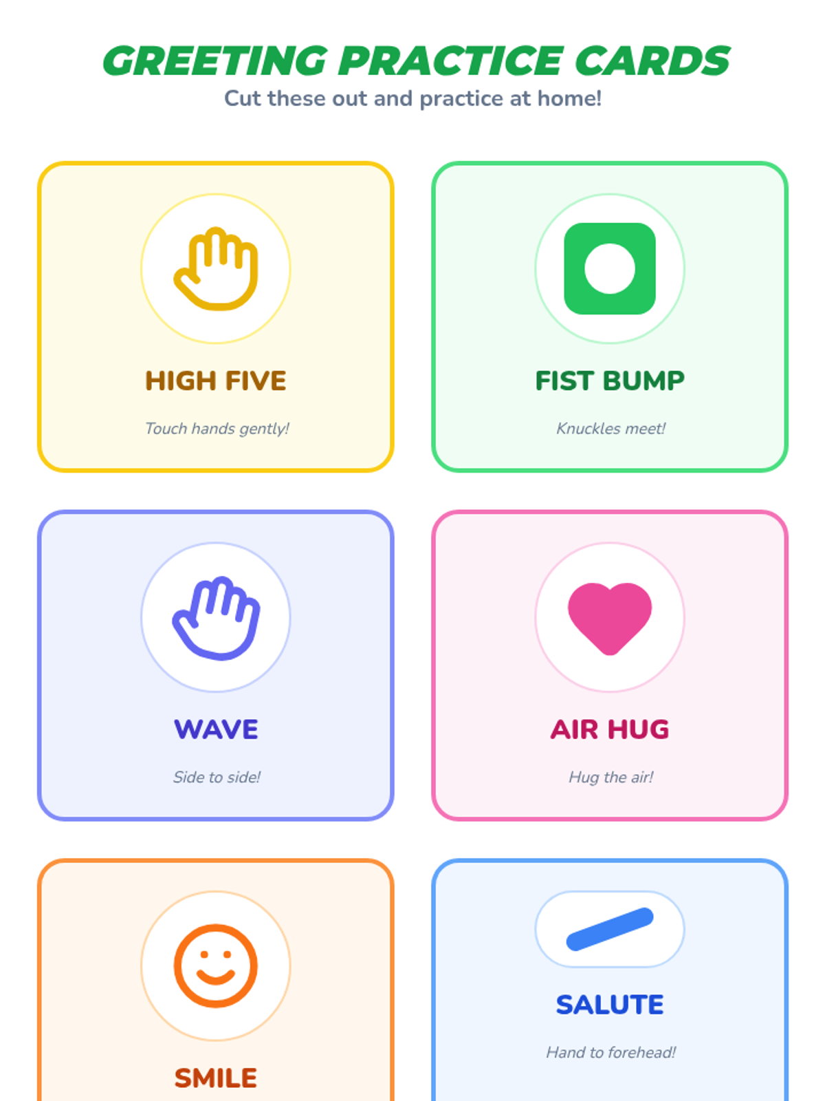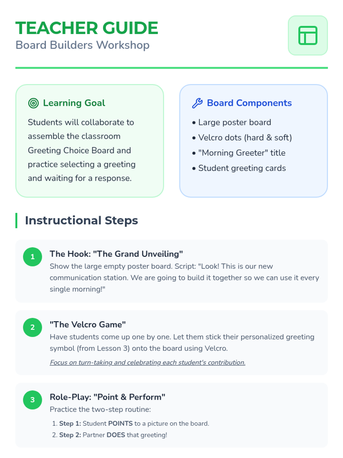 The class assembles the greeting board and practices the routine of choosing and responding to a greeting choice.