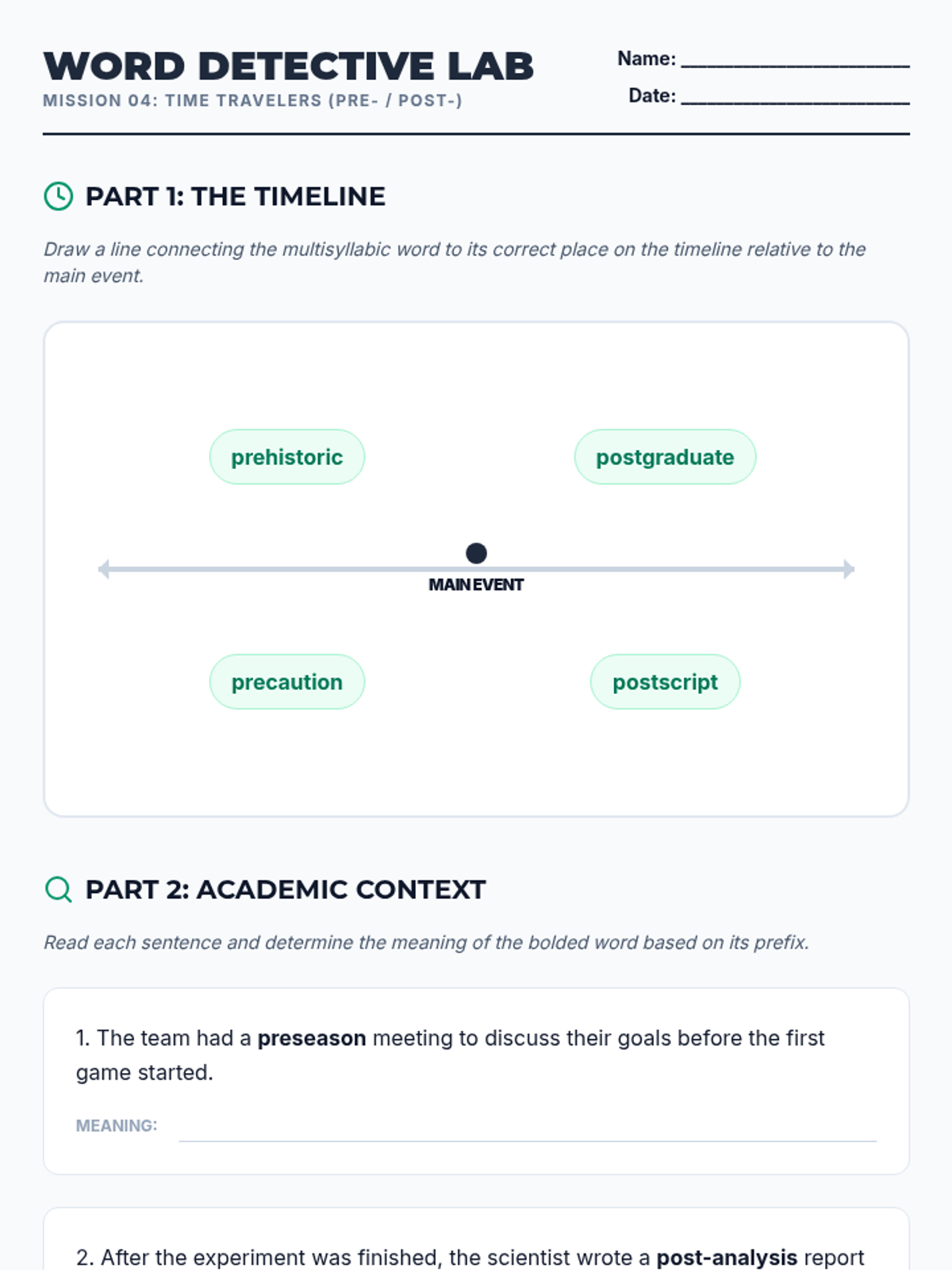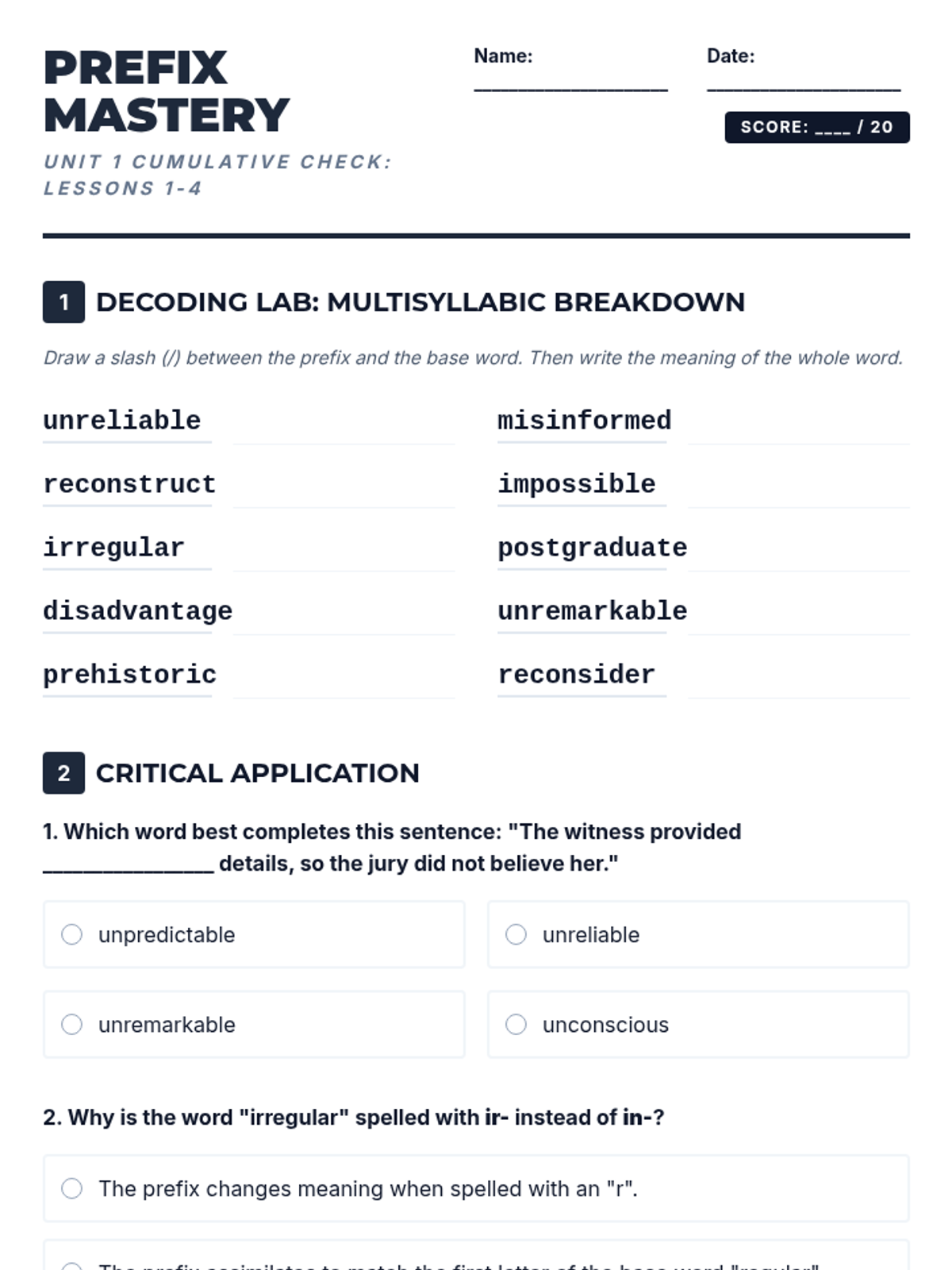 Focuses on identifying and using common prefixes like un- and re- to decode and understand multisyllabic words. Includes word building and sentence application.