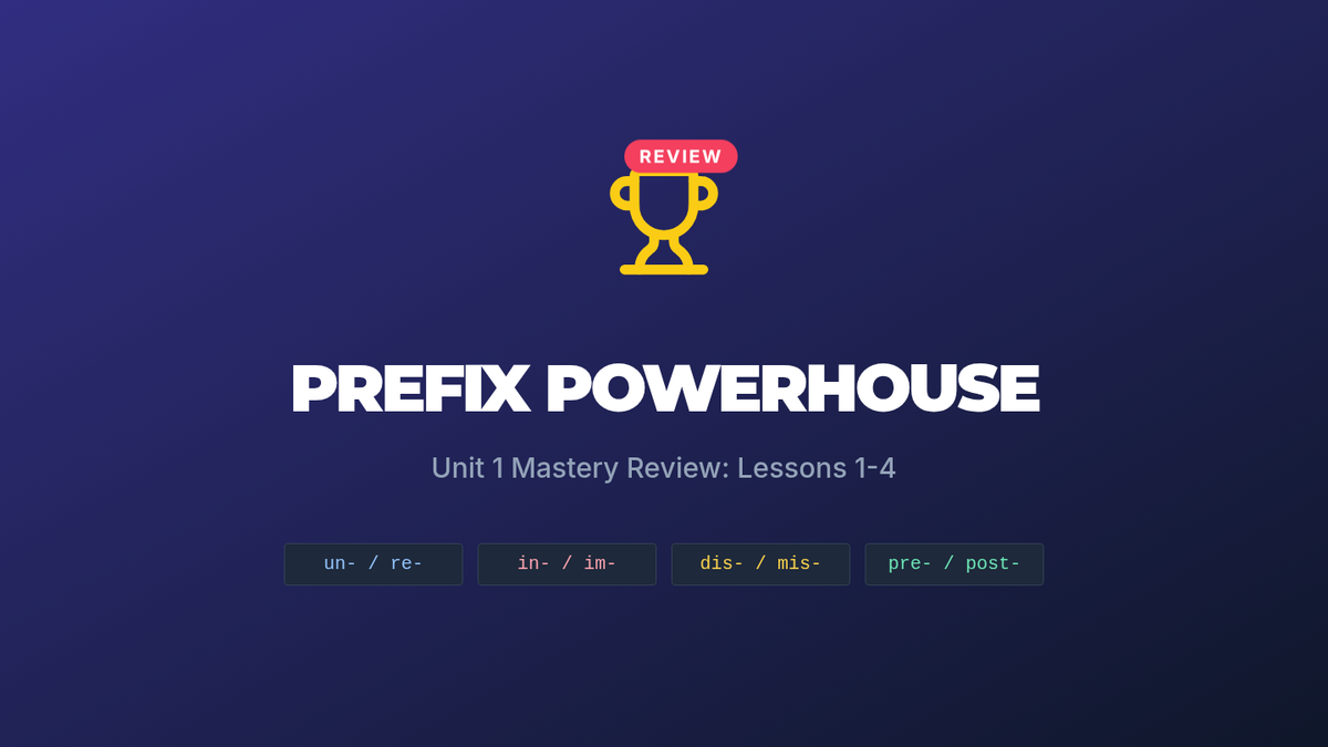A review lesson of all prefixes covered in the first four lessons, including a quick progress monitoring assessment.