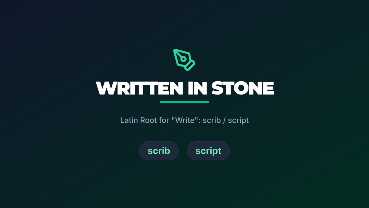 Explores the Latin root 'script' or 'scrib' (to write), identifying it in words like describe, manuscript, and prescription.