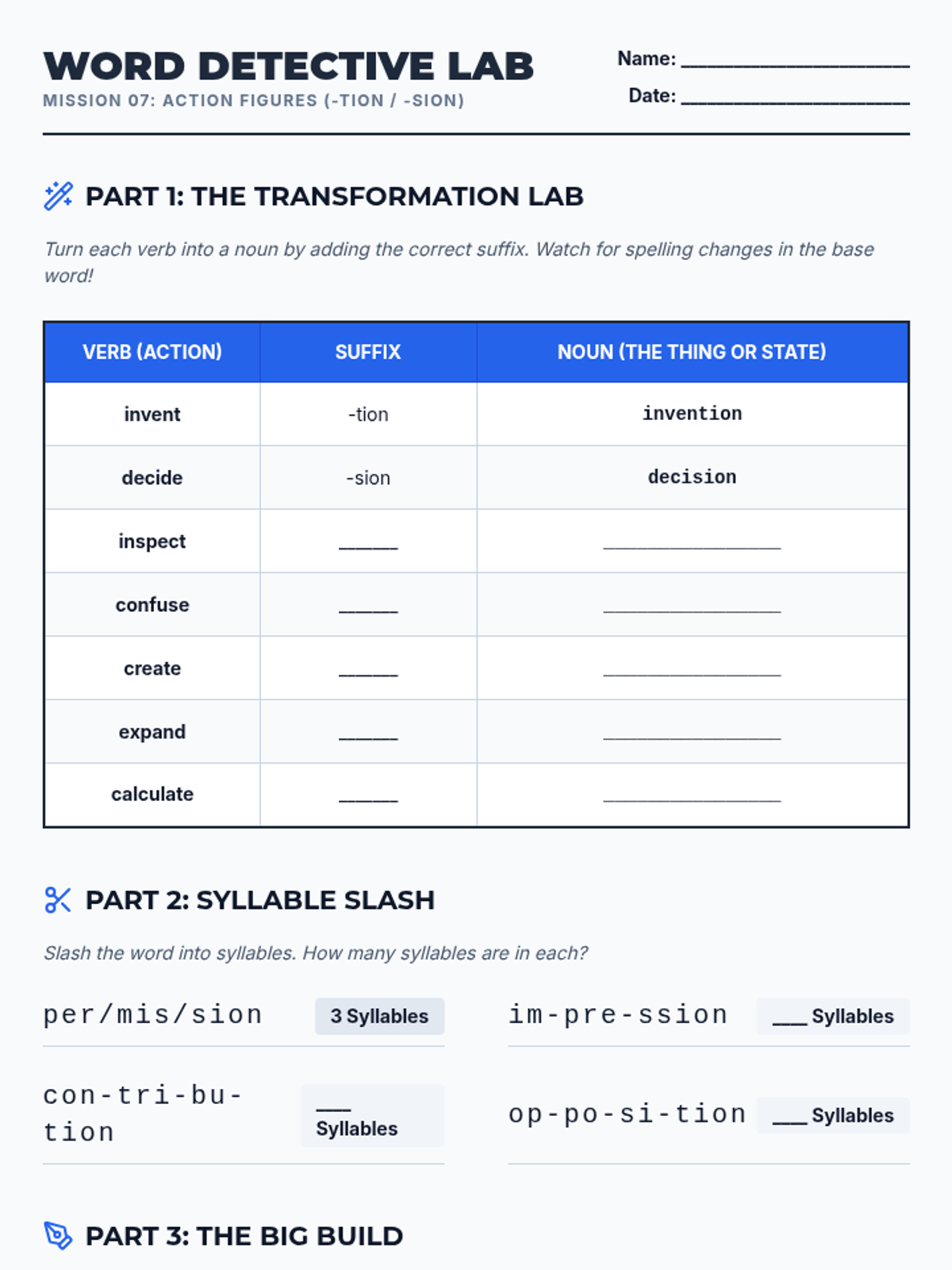 Examines noun-forming suffixes -tion and -sion, focusing on spelling patterns and syllable division.