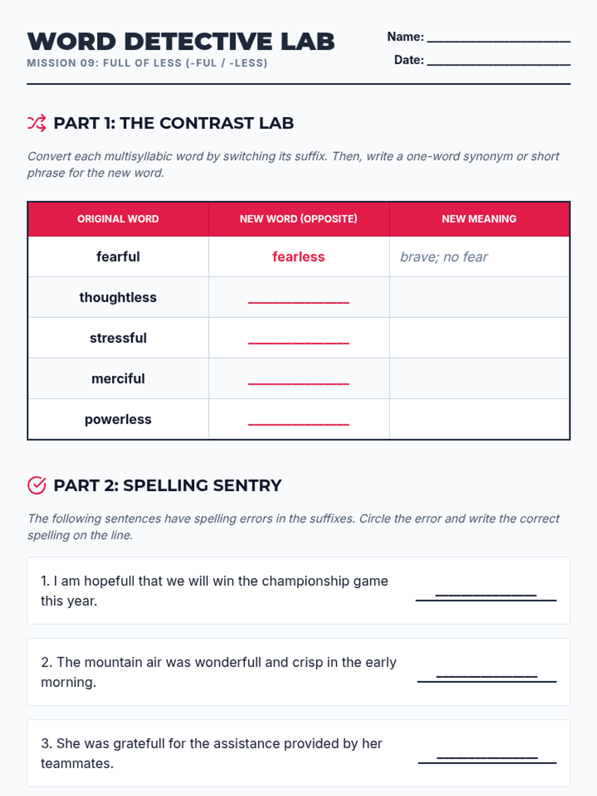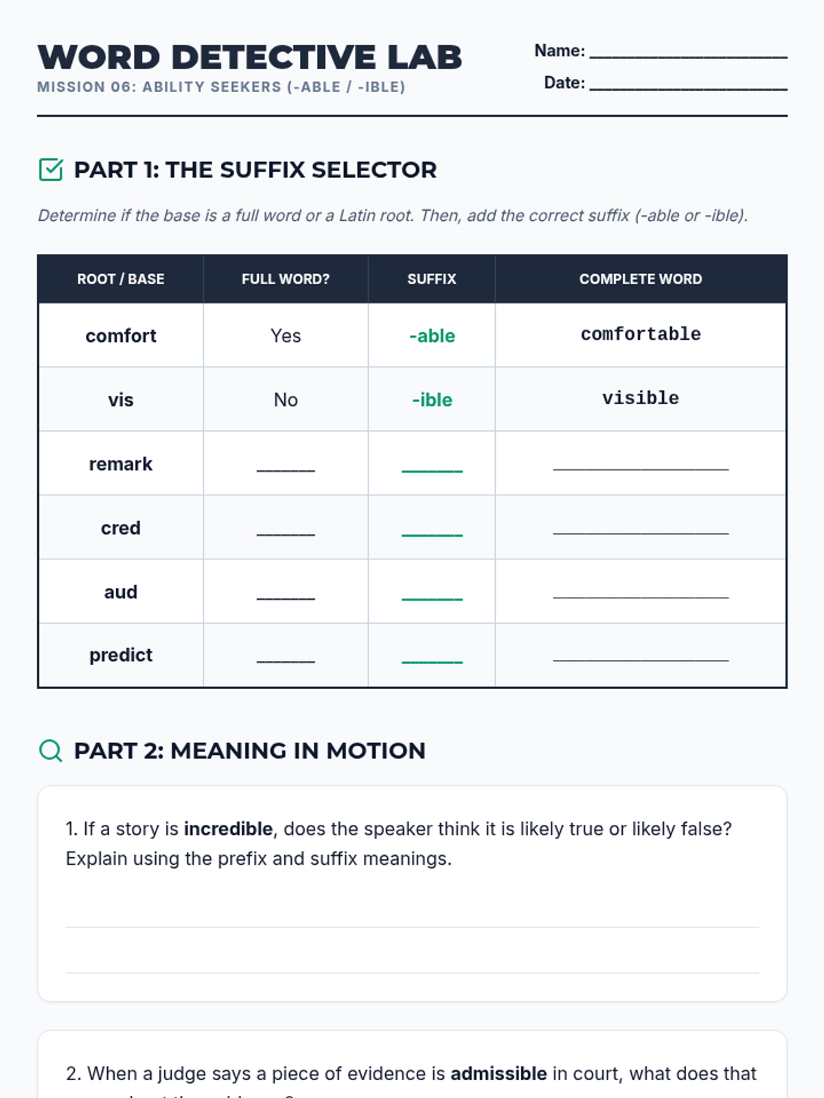Shifts focus to suffixes -able and -ible, helping students determine when to use each based on the root word.