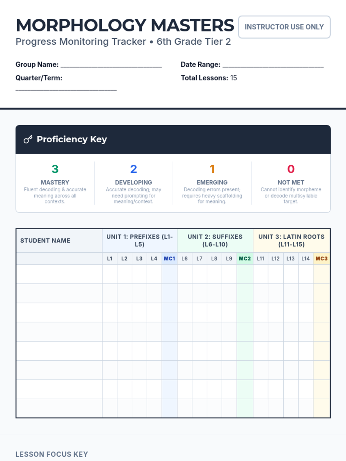 The final lesson of the sequence, reviewing all prefixes, suffixes, and roots with a cumulative assessment.