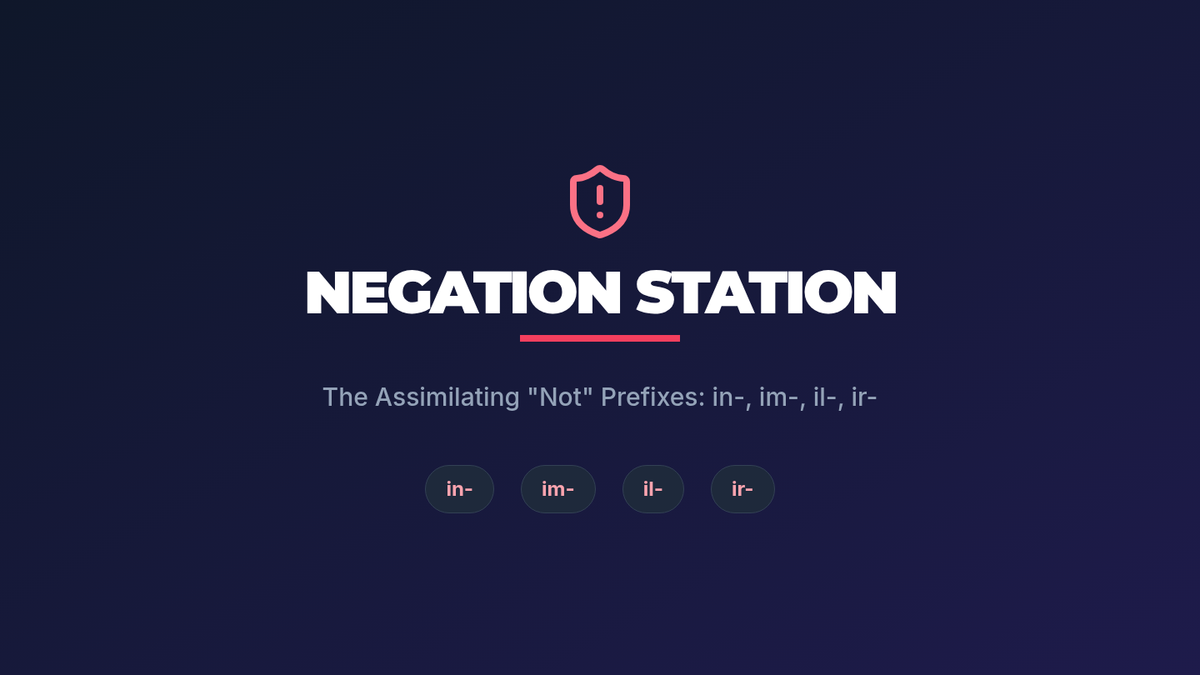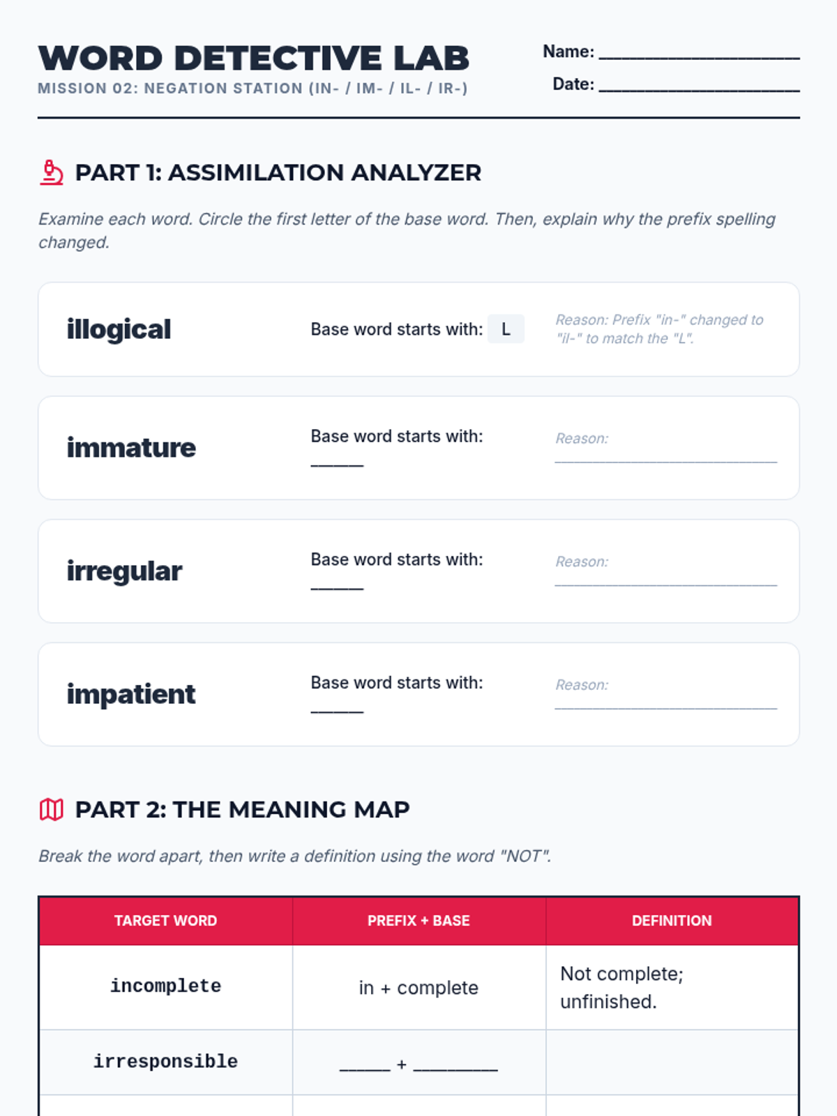 Covers the 'not' prefixes in-, im-, il-, and ir-, exploring how spelling changes based on the root word's initial letter.