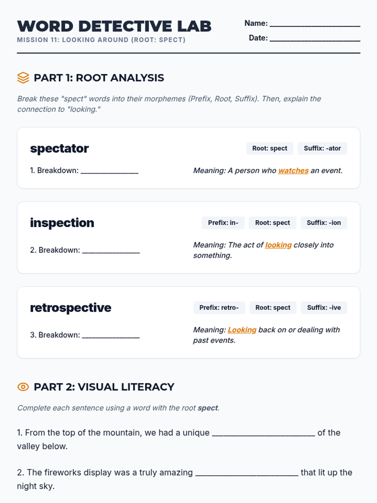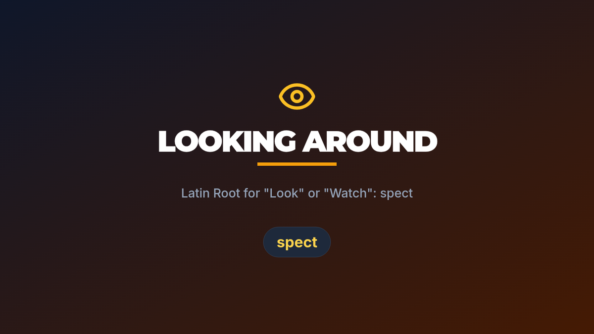 Introduces the Latin root 'spect' (look), identifying it in common multisyllabic academic words.