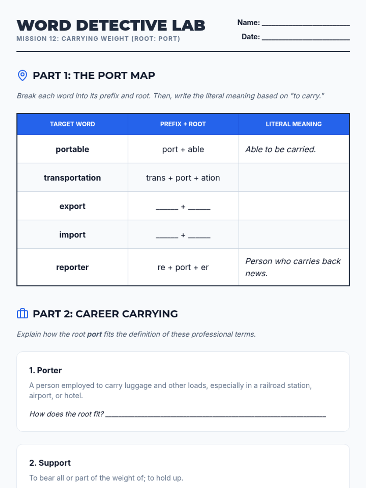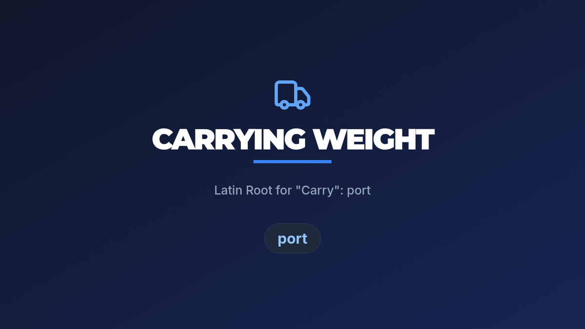 Focuses on the Latin root 'port' (carry), connecting it to familiar words like 'transport' and 'portable'.