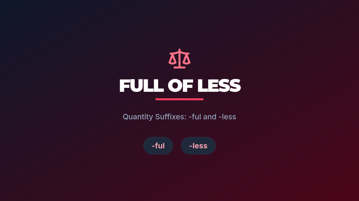 Focuses on the quantity-based suffixes -ful and -less, using contrasting word pairs to build understanding.