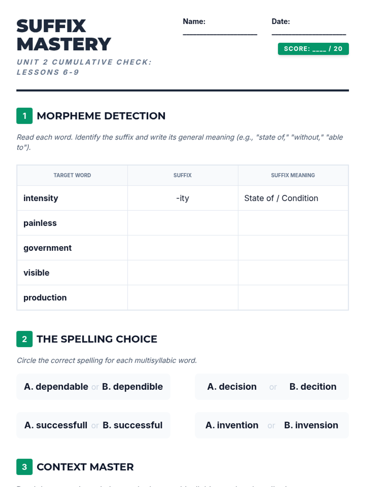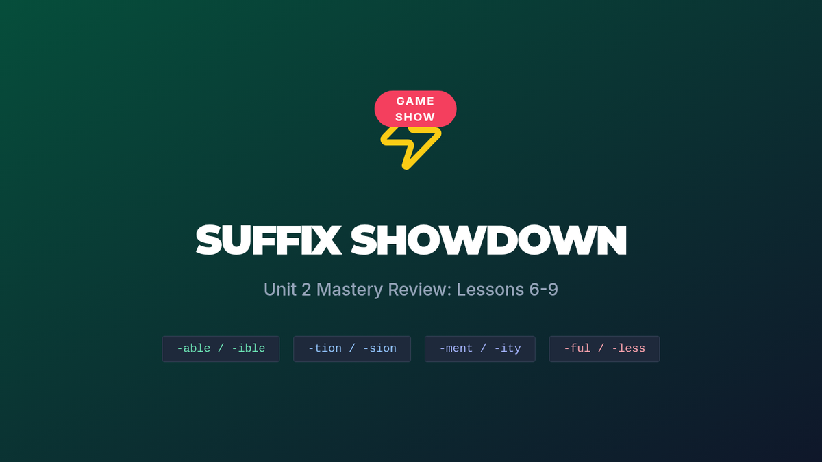 A review of all suffixes covered, featuring a 'Suffix Showdown' game and a progress monitoring check.