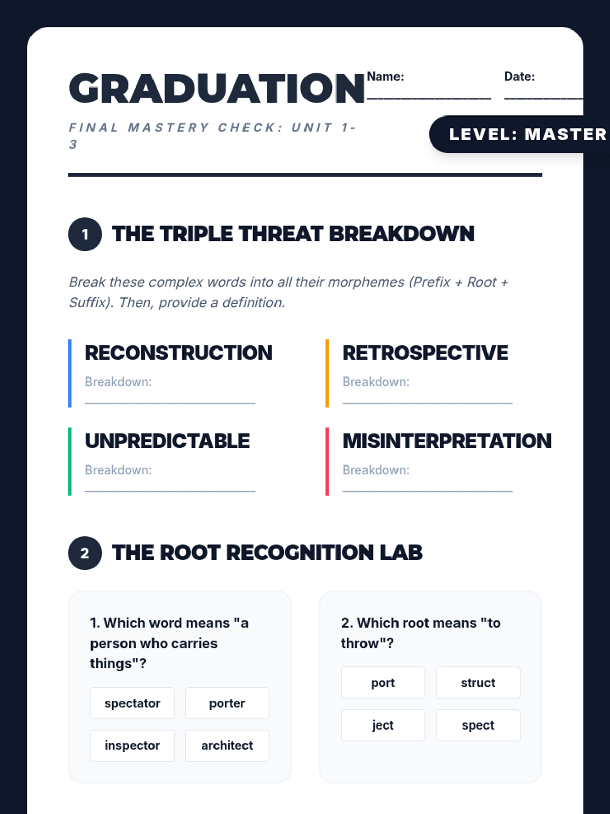 The ultimate cumulative review and graduation for the entire 20-lesson morphology sequence.