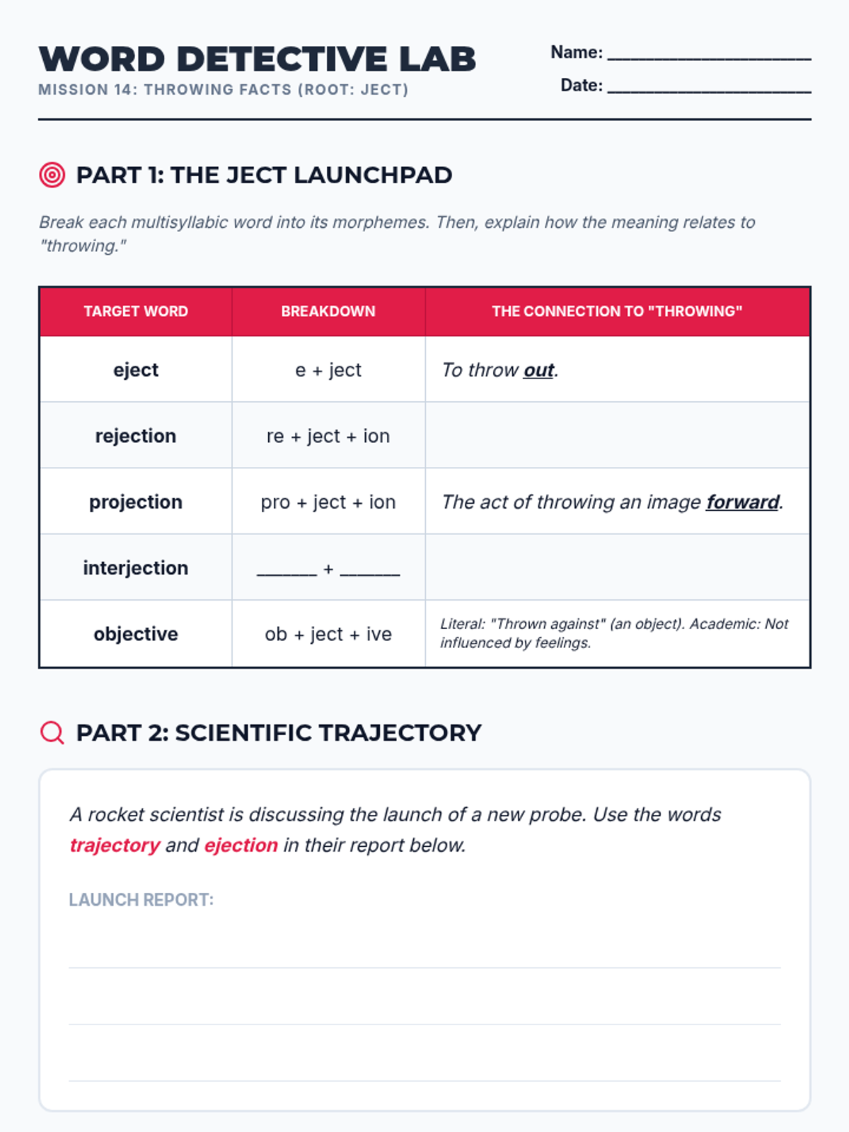 Covers the Latin root 'ject' (throw), emphasizing the physical meanings behind abstract academic terms.