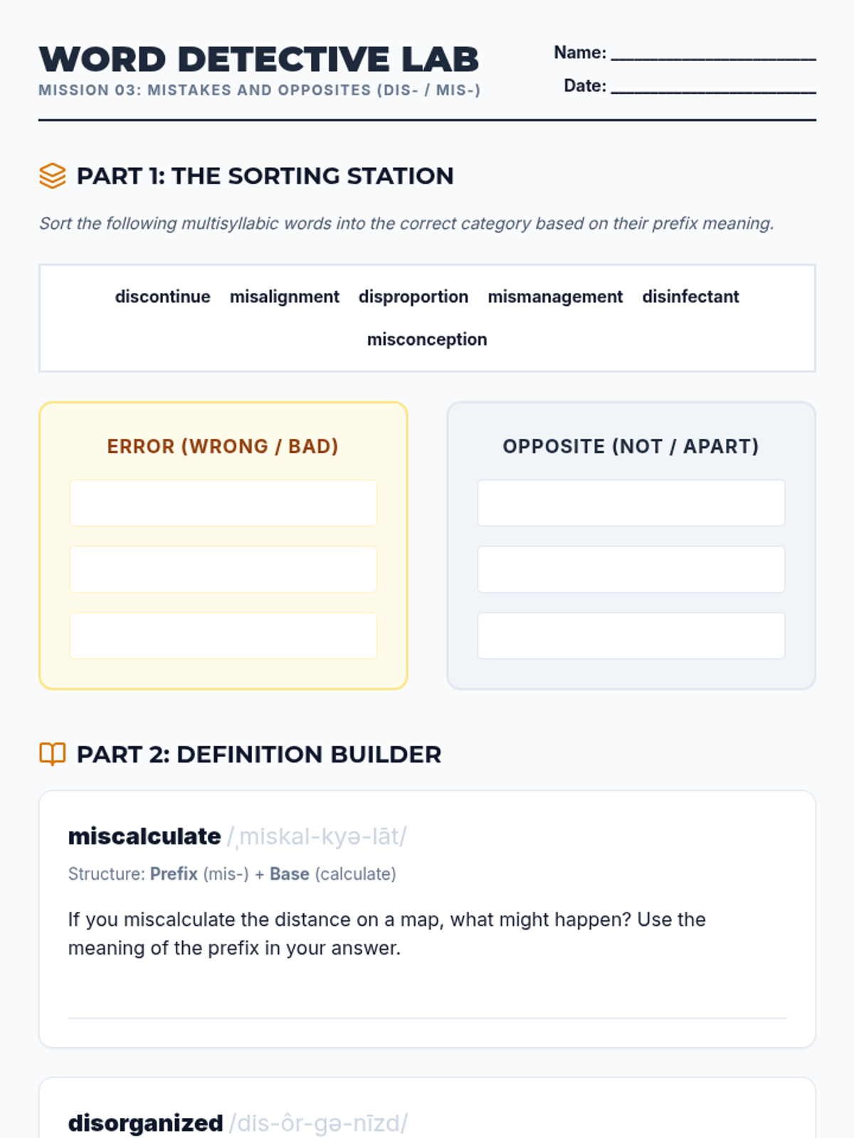 Investigates prefixes dis- and mis- to understand words related to opposites and errors, featuring word-sorting activities.