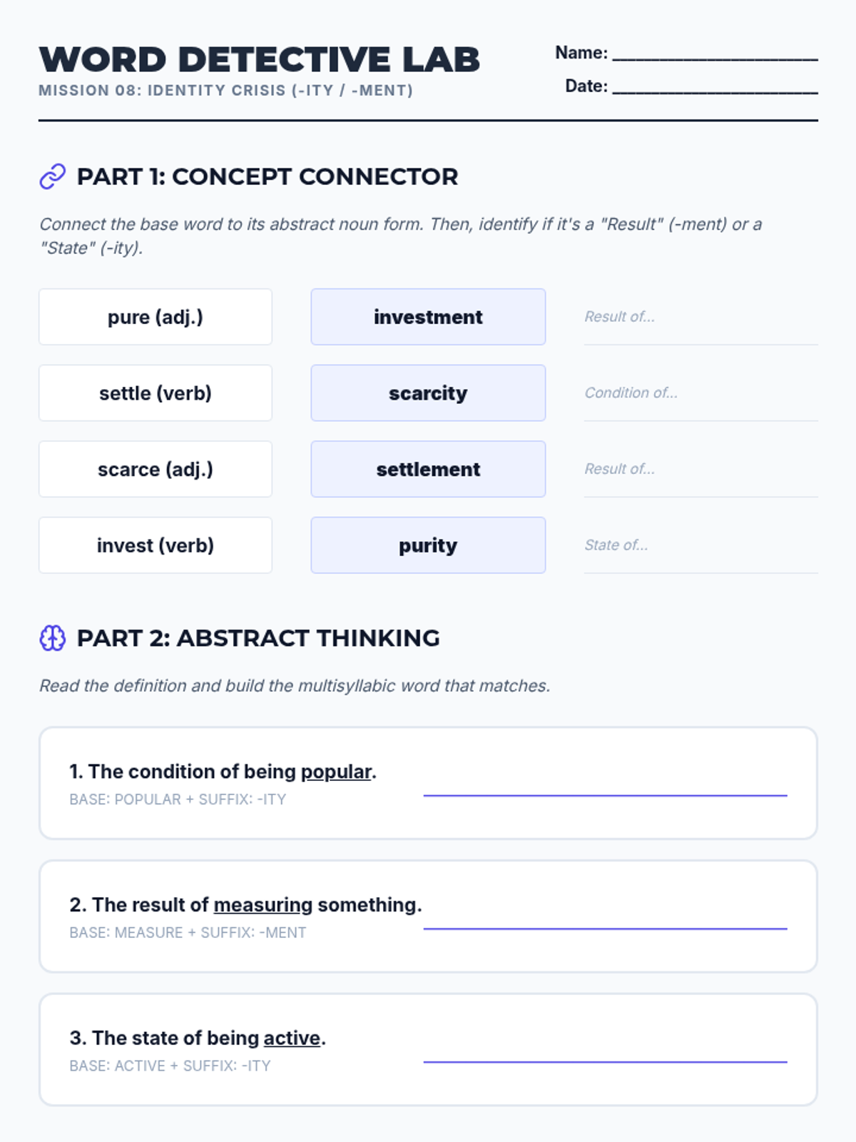Explores suffixes -ment and -ity, emphasizing how they transform verbs and adjectives into abstract nouns.