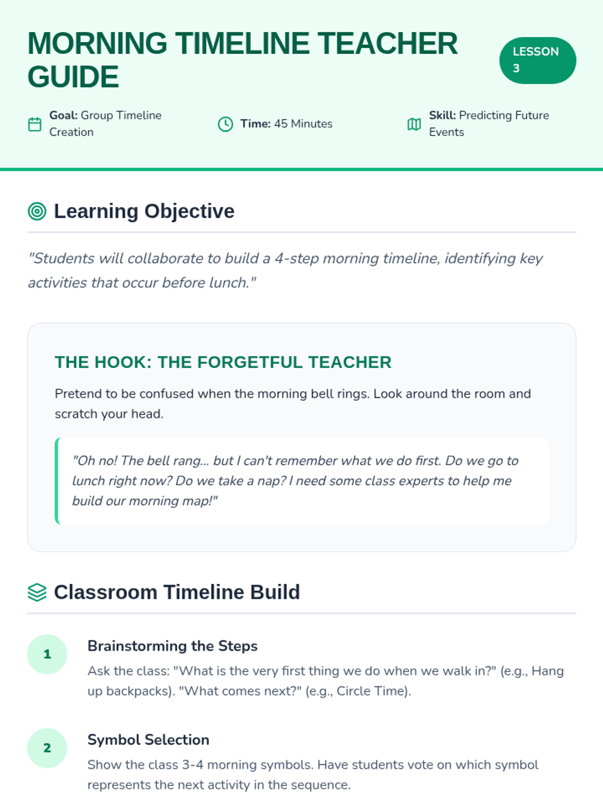 As a group, students construct a class morning schedule, identifying and ordering major events that occur before lunch.