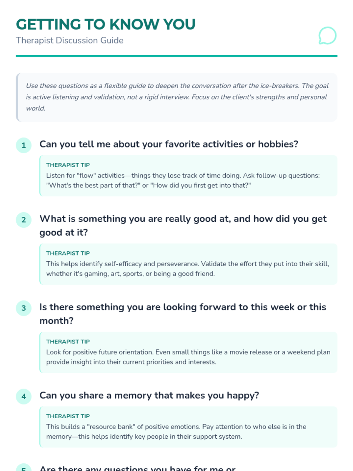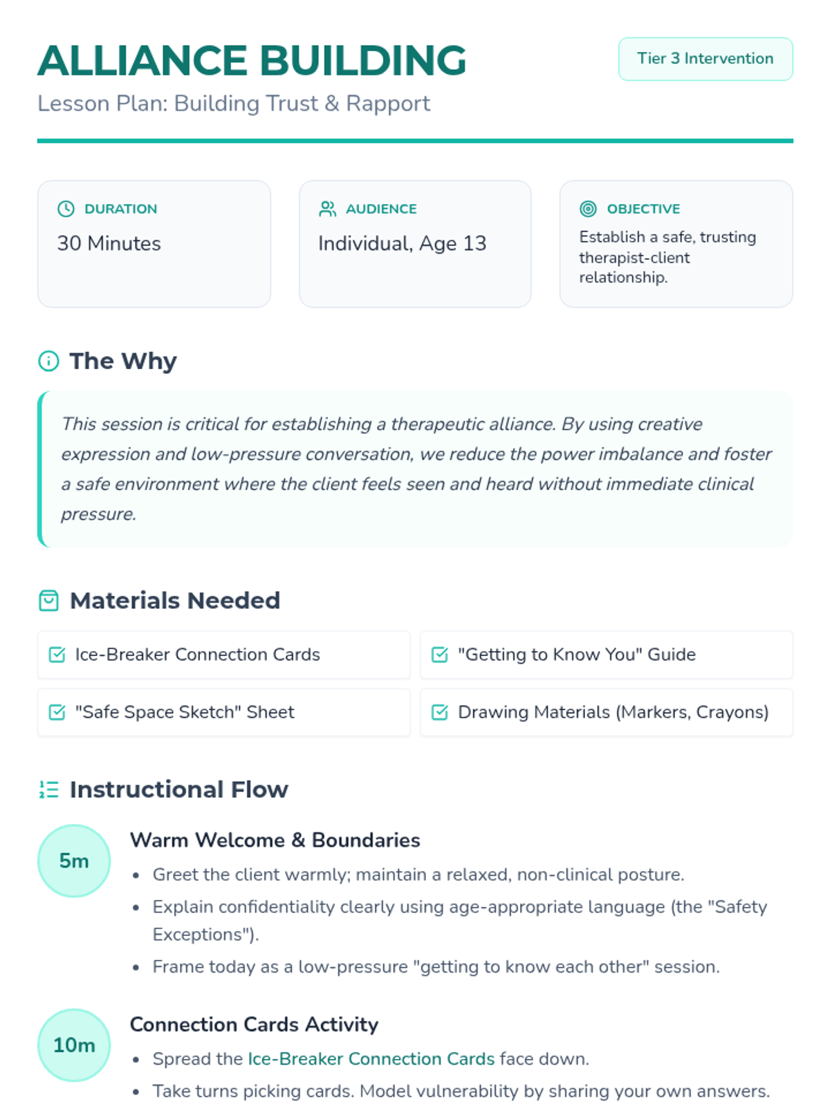 This lesson is designed for a therapist working individually with a 13-year-old client to establish a strong therapeutic alliance through ice-breakers, creative expression, and empathetic discussion.