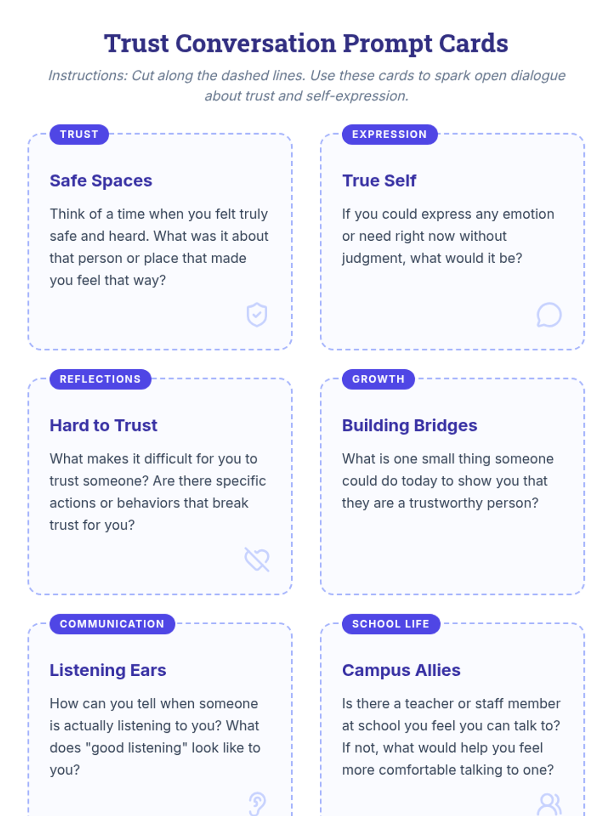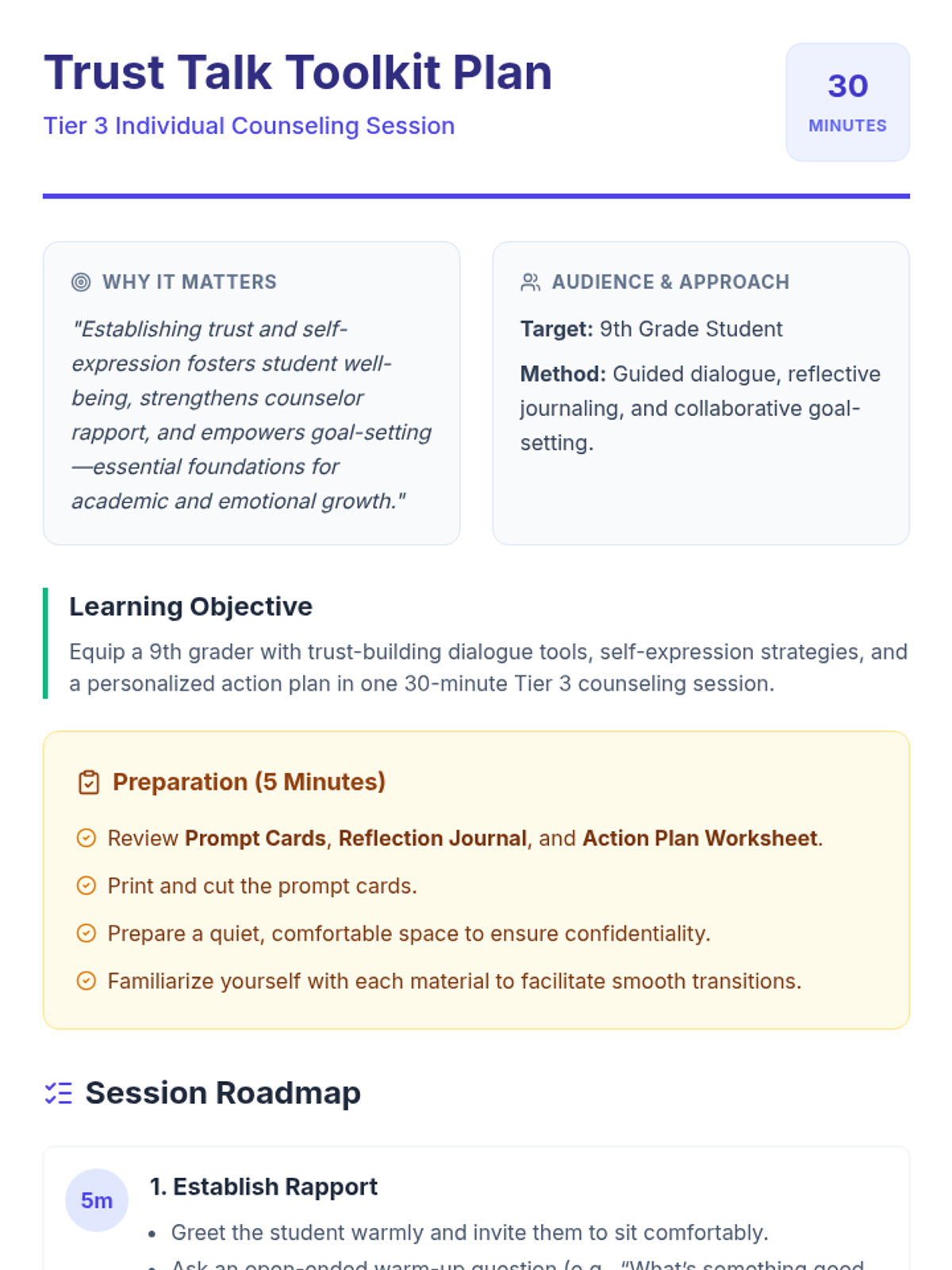 Focuses on establishing a secure therapeutic alliance, defining confidentiality, and encouraging open self-expression through guided dialogue and reflection.