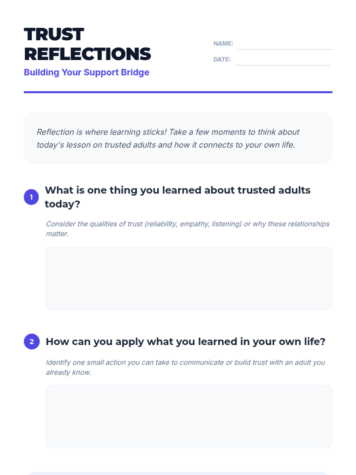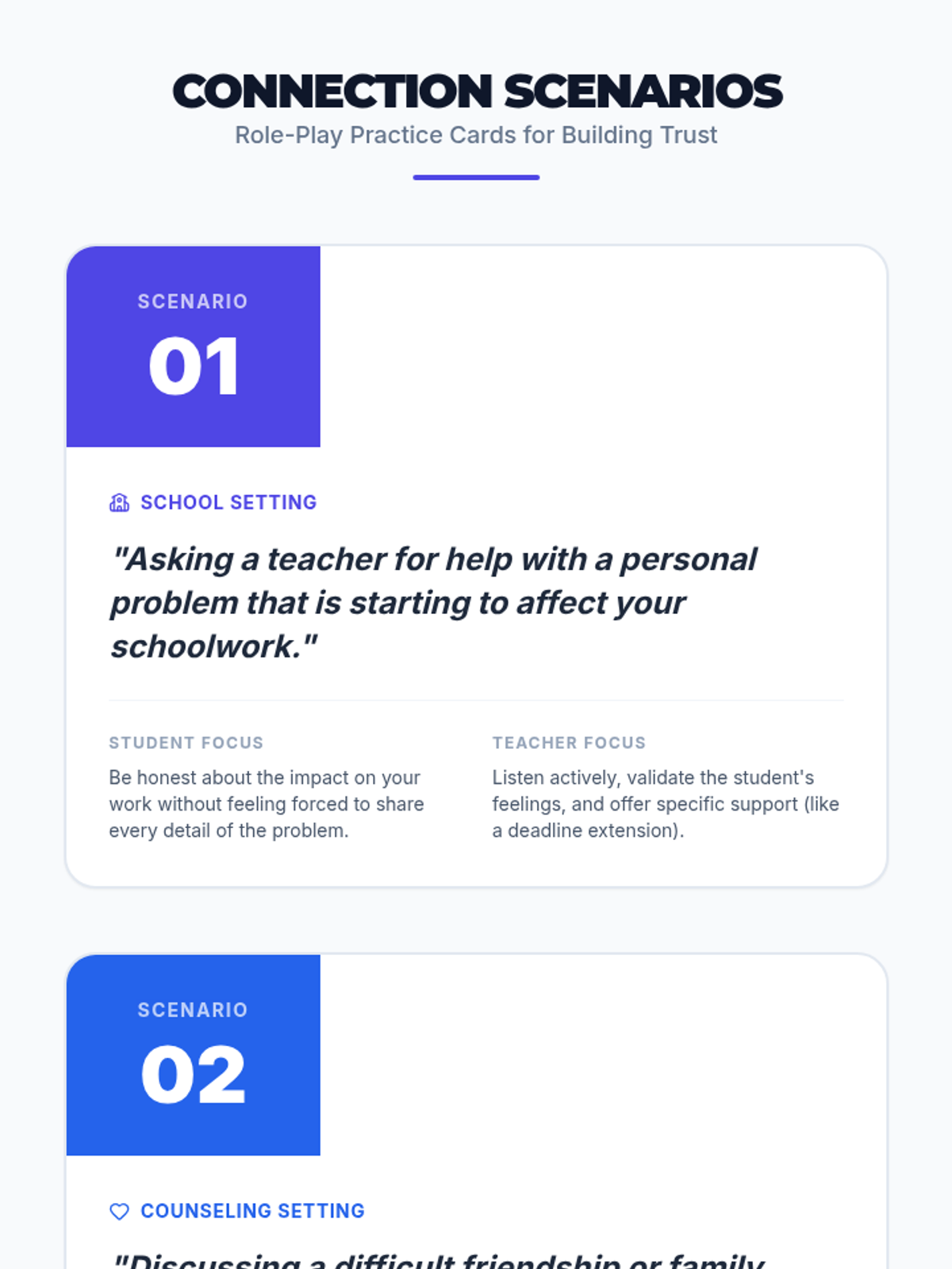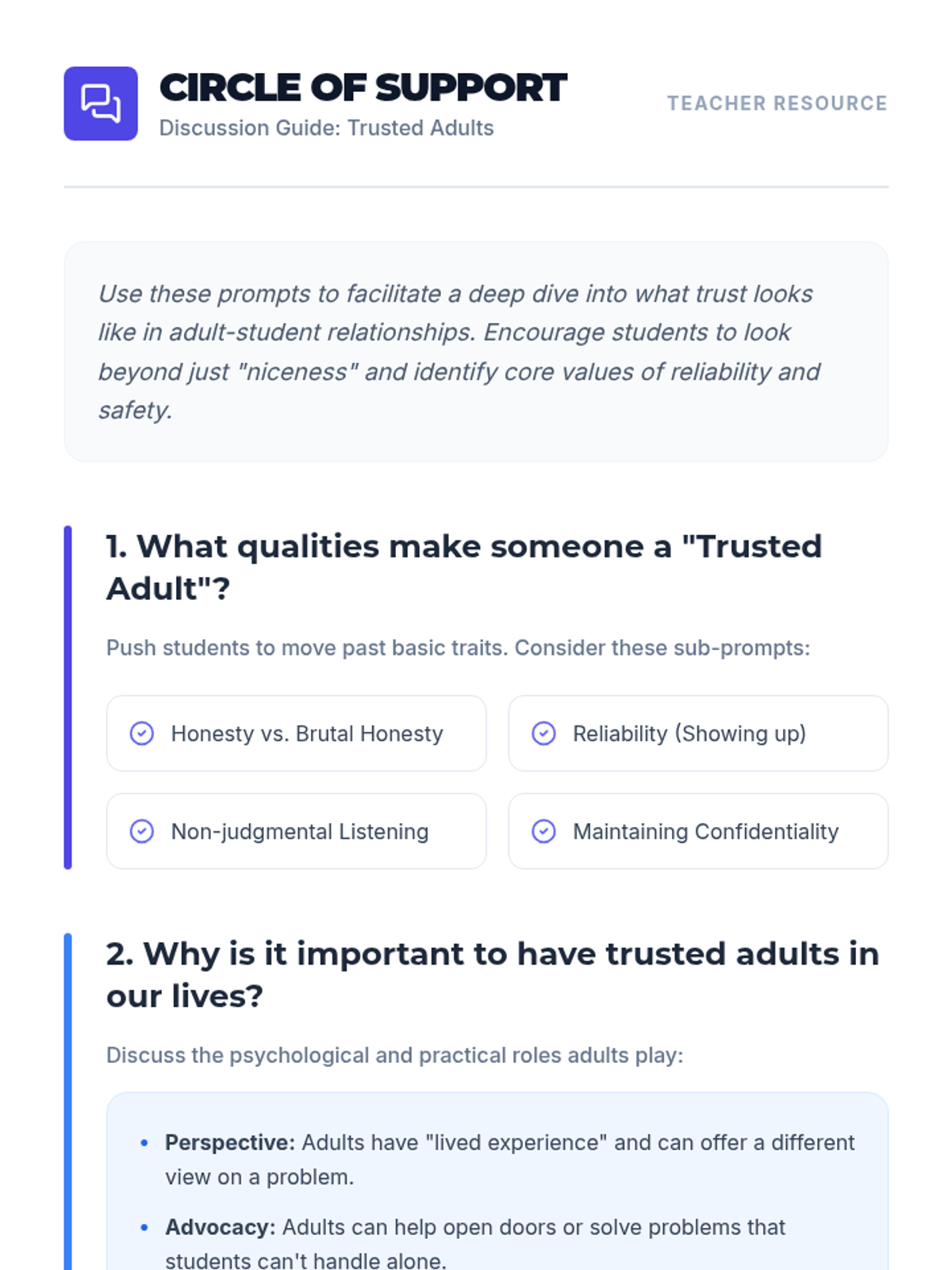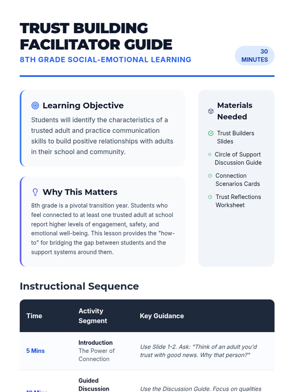 This lesson focuses on helping 8th-grade students understand the importance of building positive relationships with trusted adults through discussion, role-playing, and reflection.