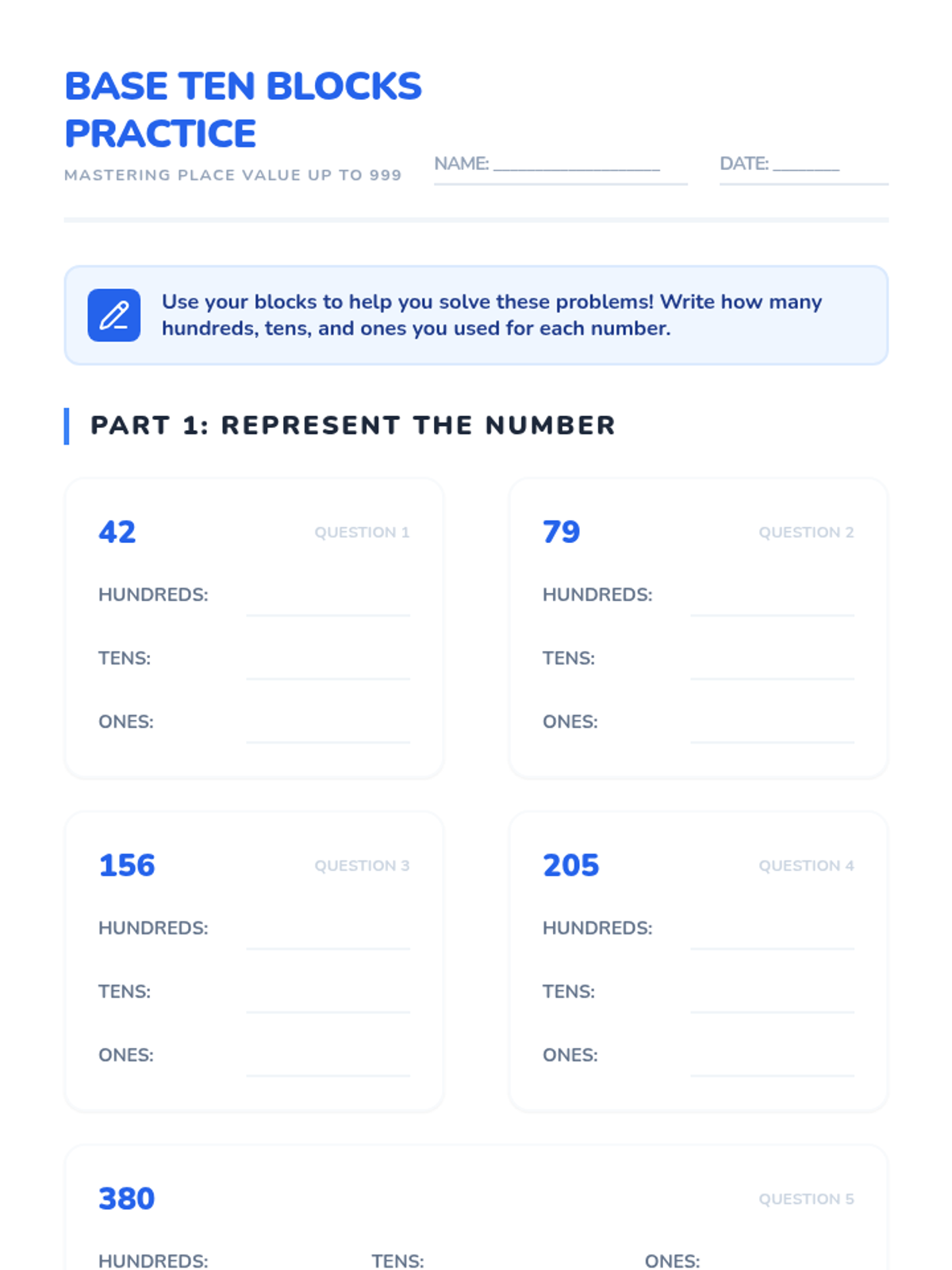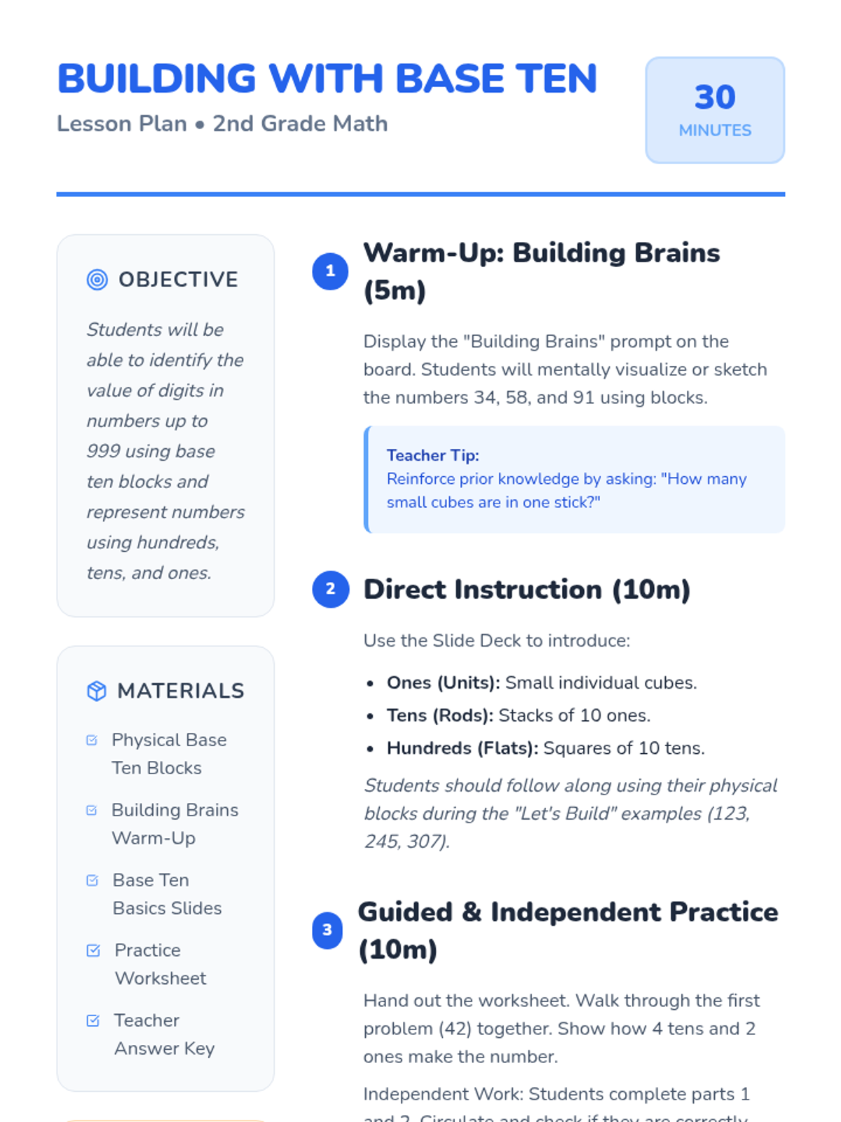 This lesson introduces 2nd-grade students to base ten blocks, helping them visualize numbers up to 999 through hands-on building and guided practice.
