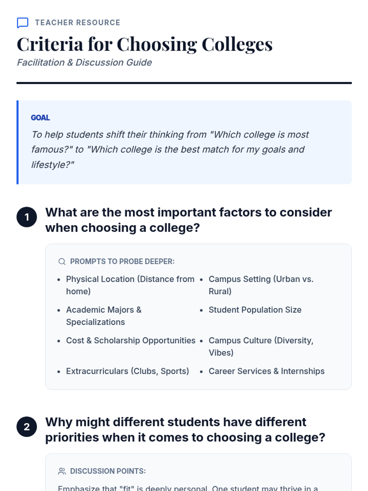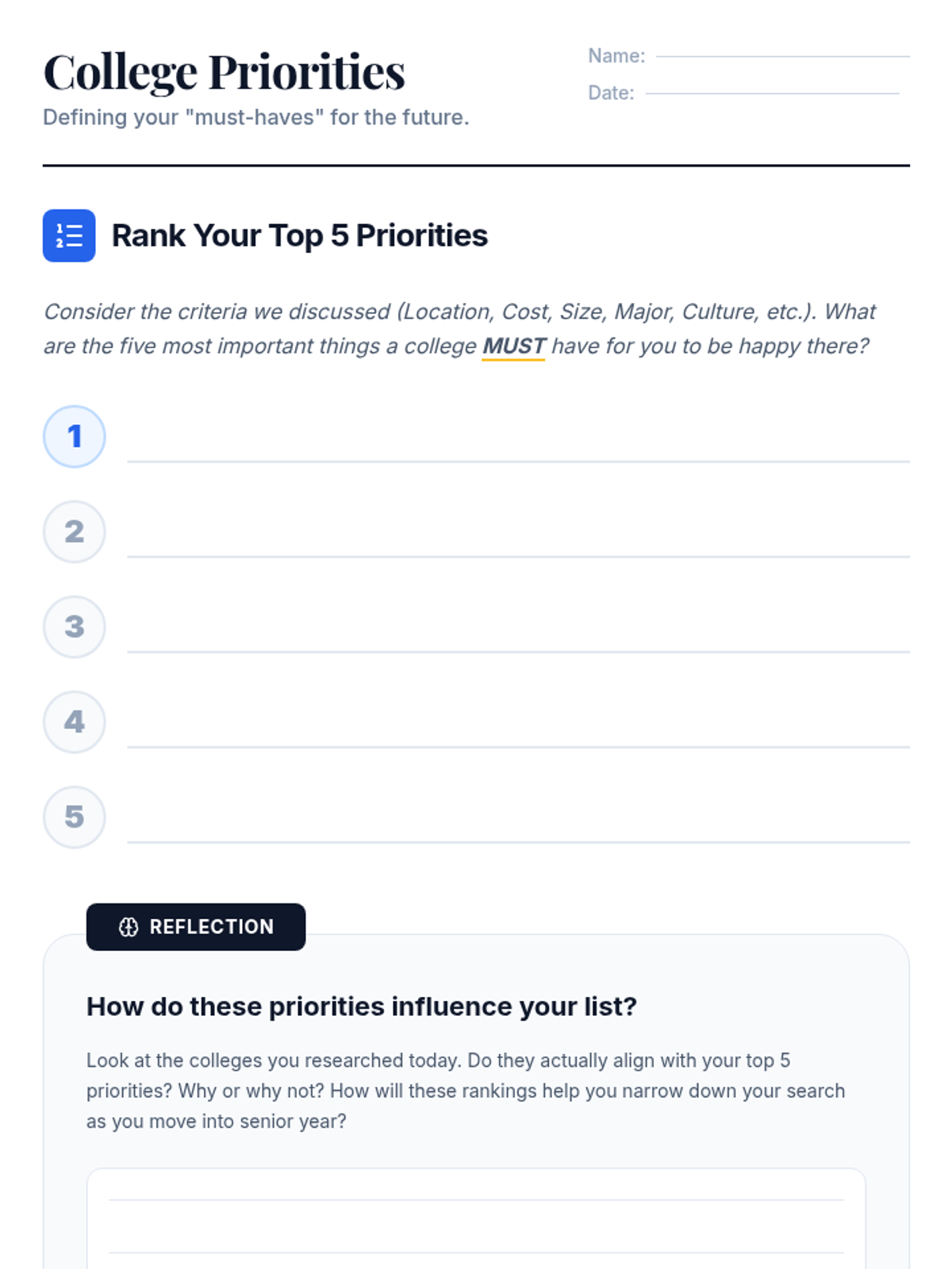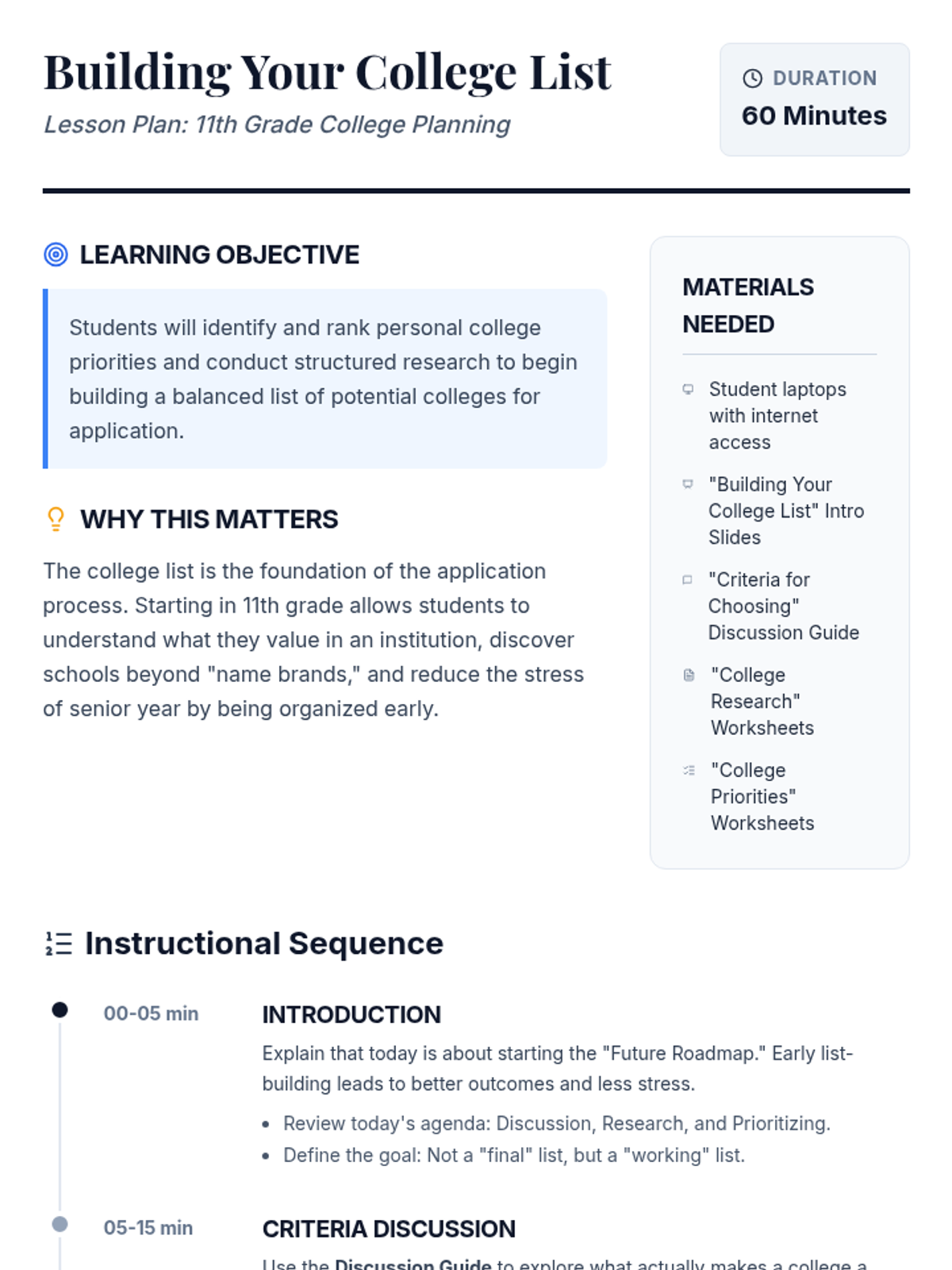 This lesson helps 11th-grade students create a list of colleges they want to apply to. Students will research potential schools, identify their personal priorities, and understand key criteria for selection.