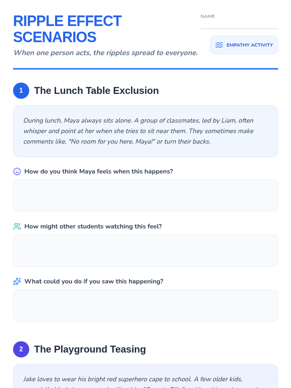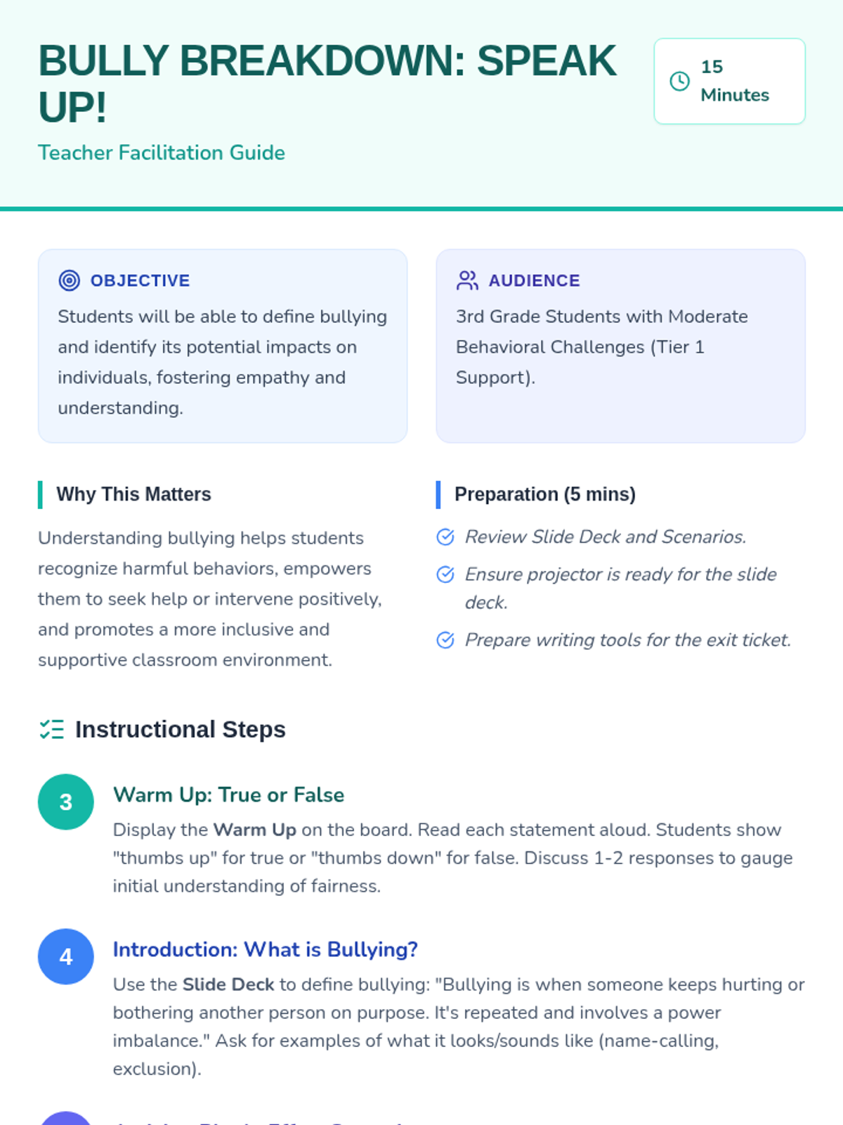 A 15-minute lesson for 3rd-grade students with moderate behavioral challenges to help them understand bullying, its impact (the 'ripple effect'), and how to speak up.