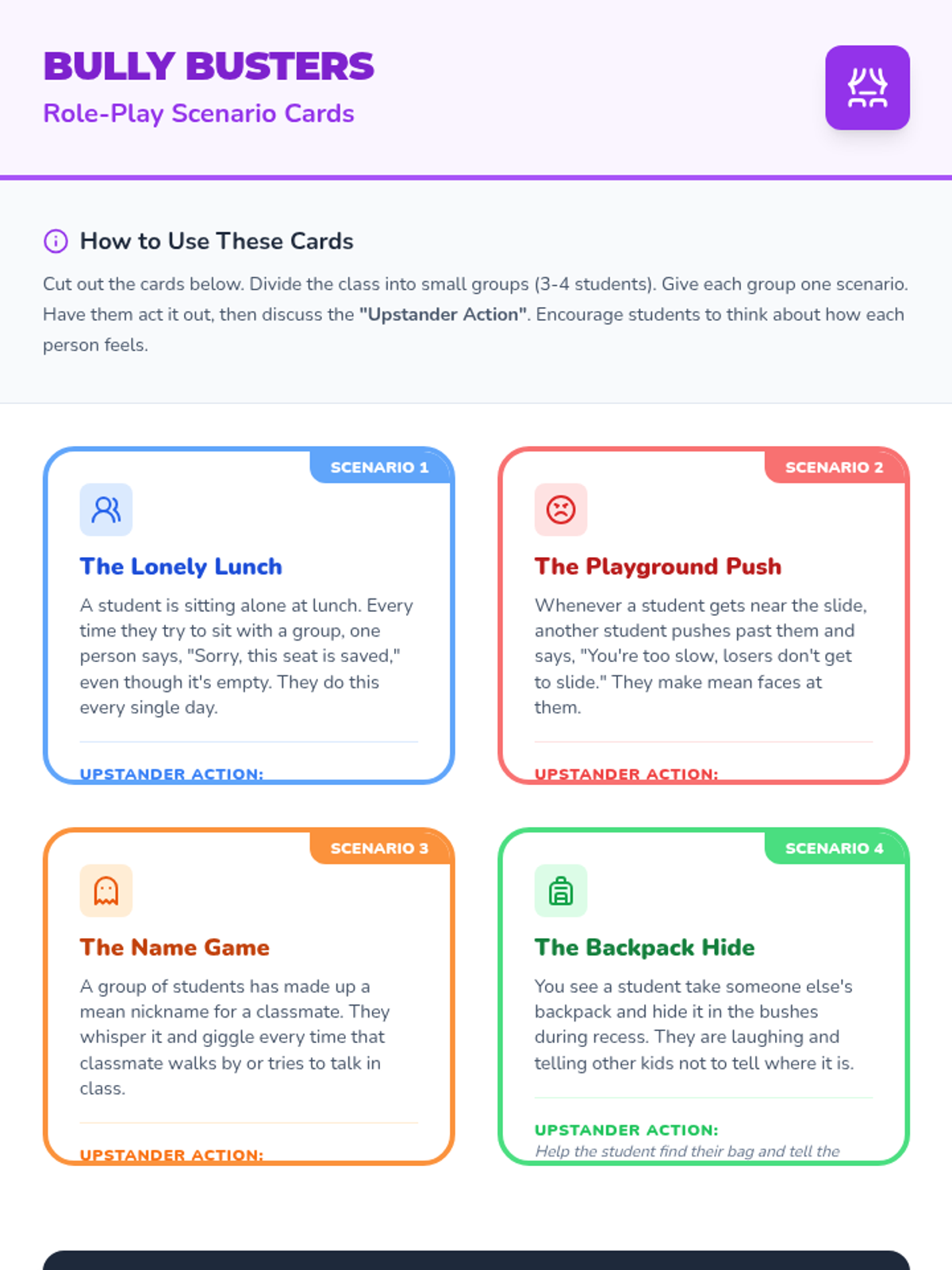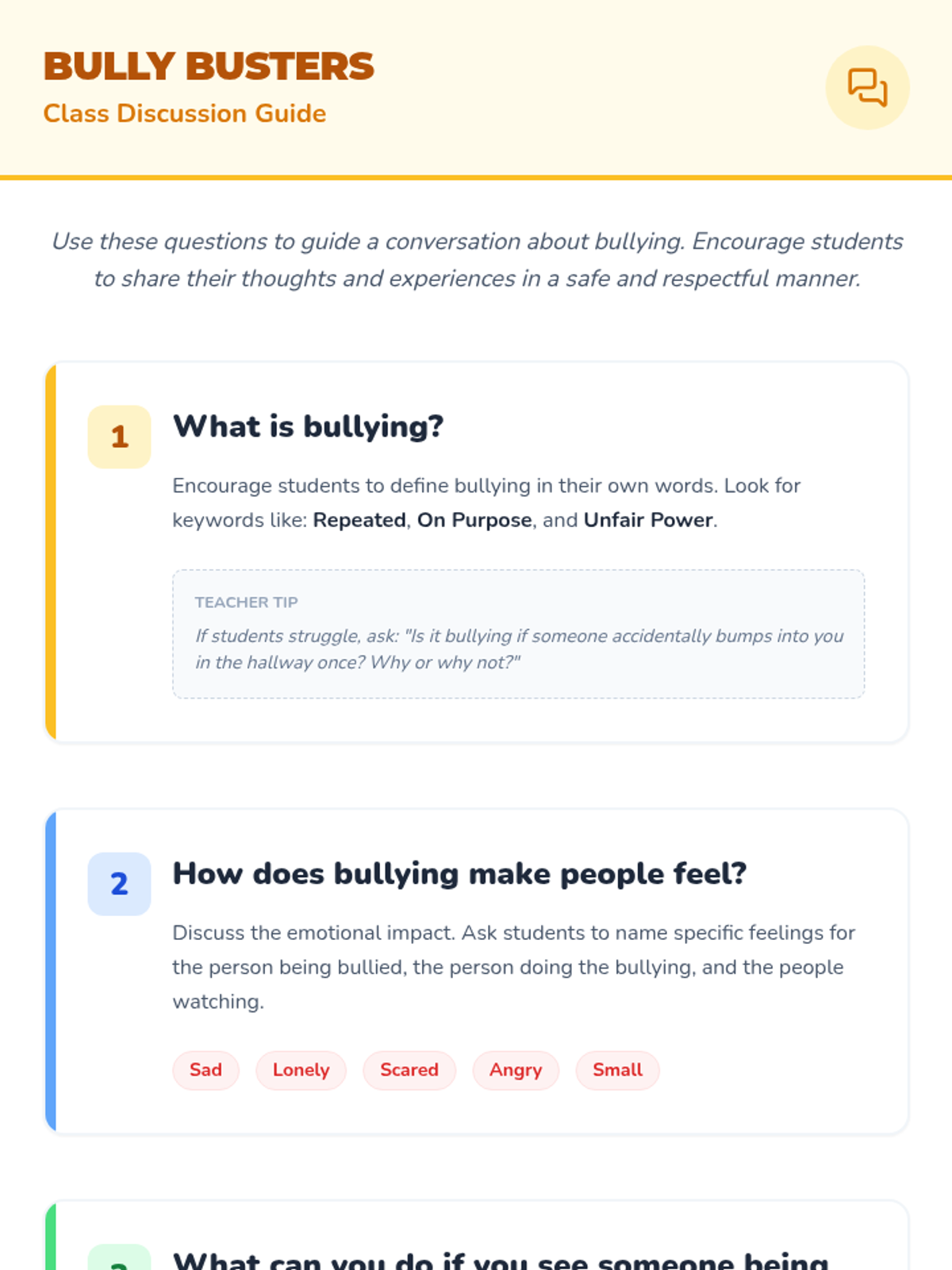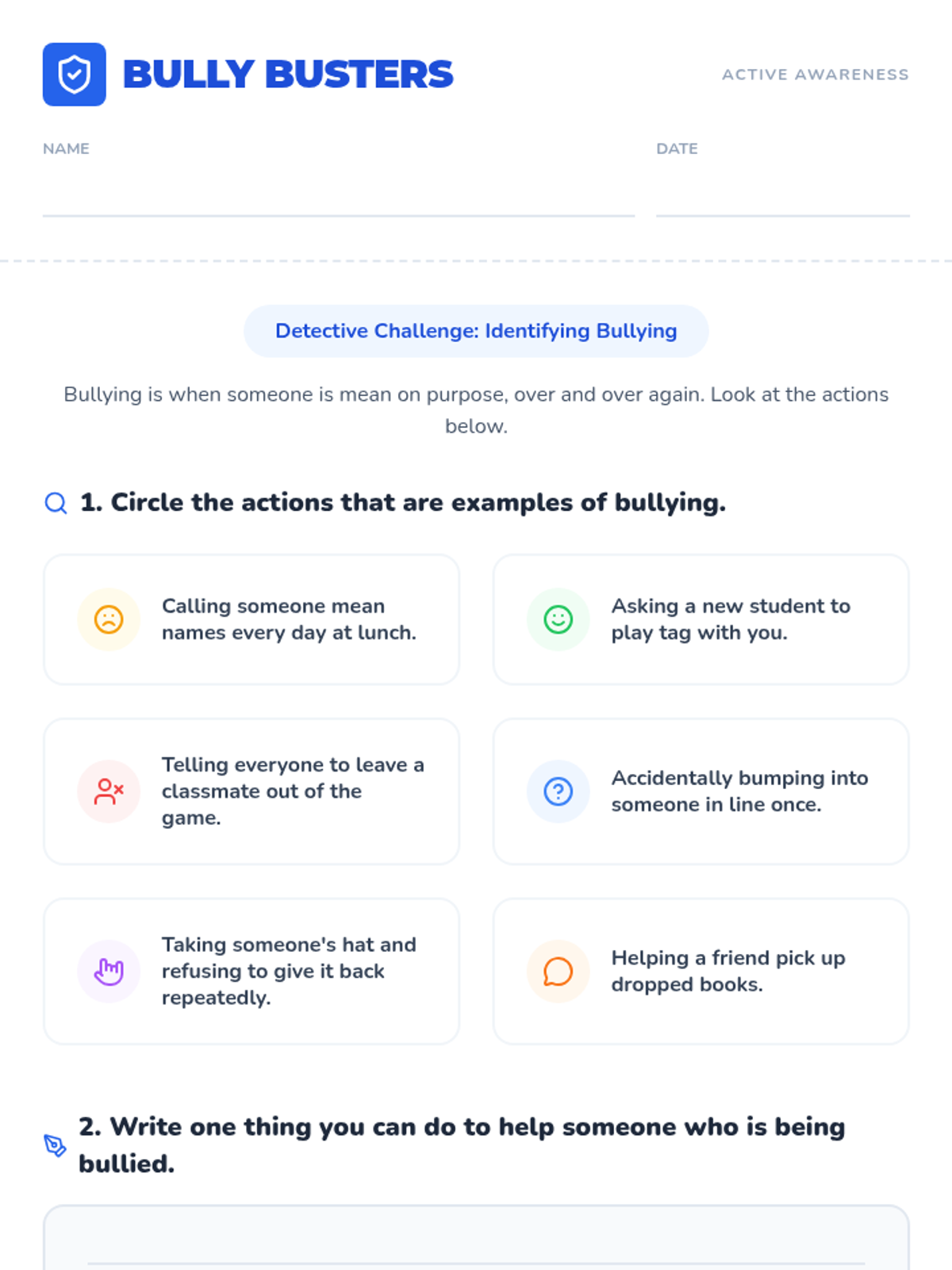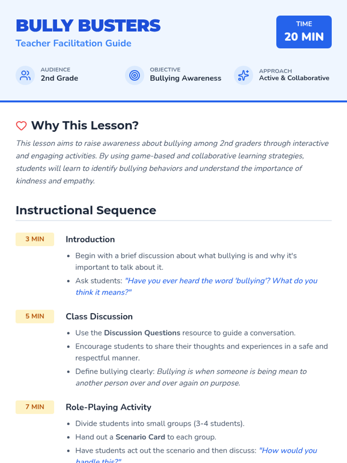 A 20-minute interactive lesson for 2nd graders to identify bullying behaviors and practice empathy through role-playing and collaborative activities.