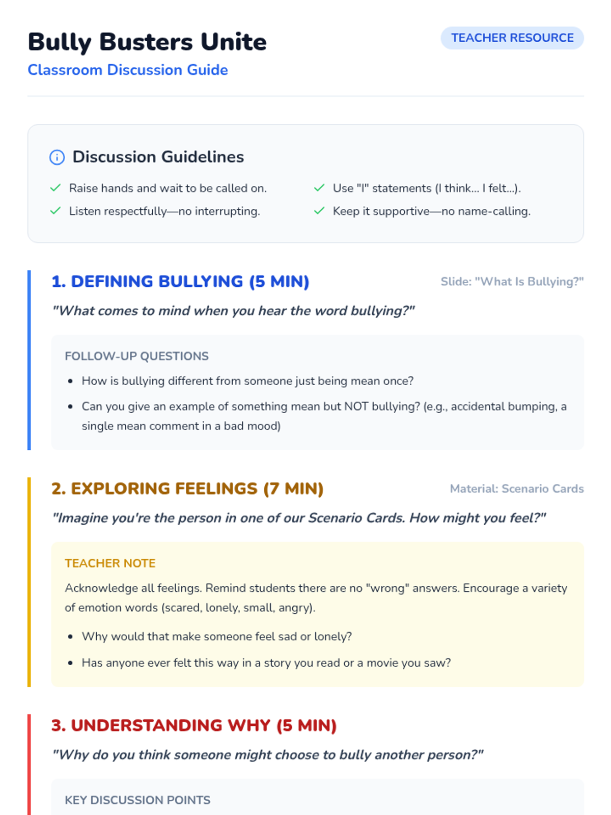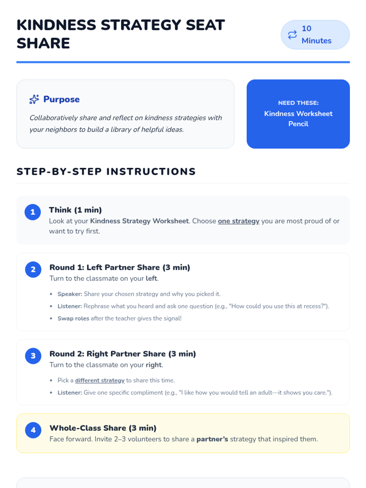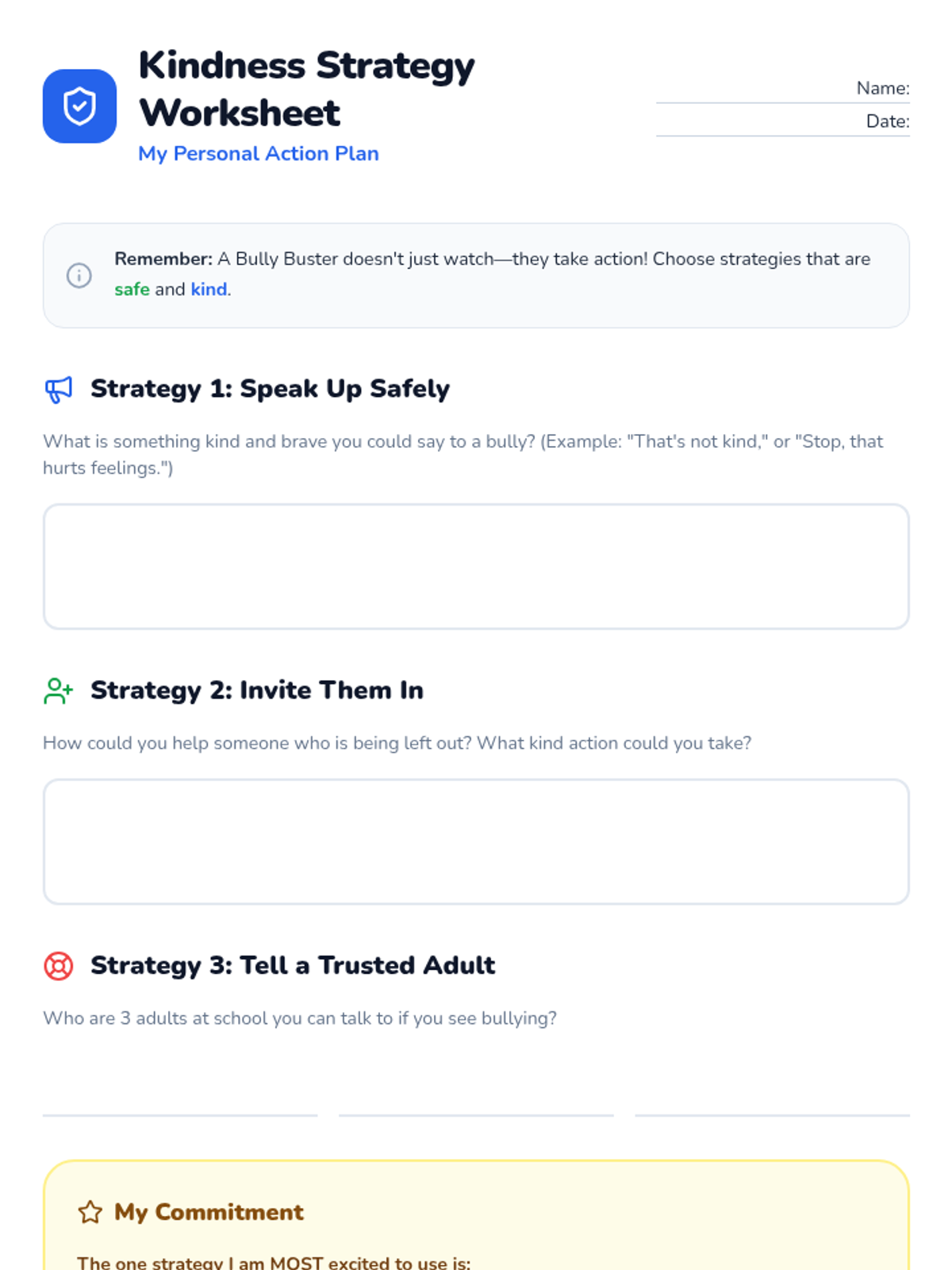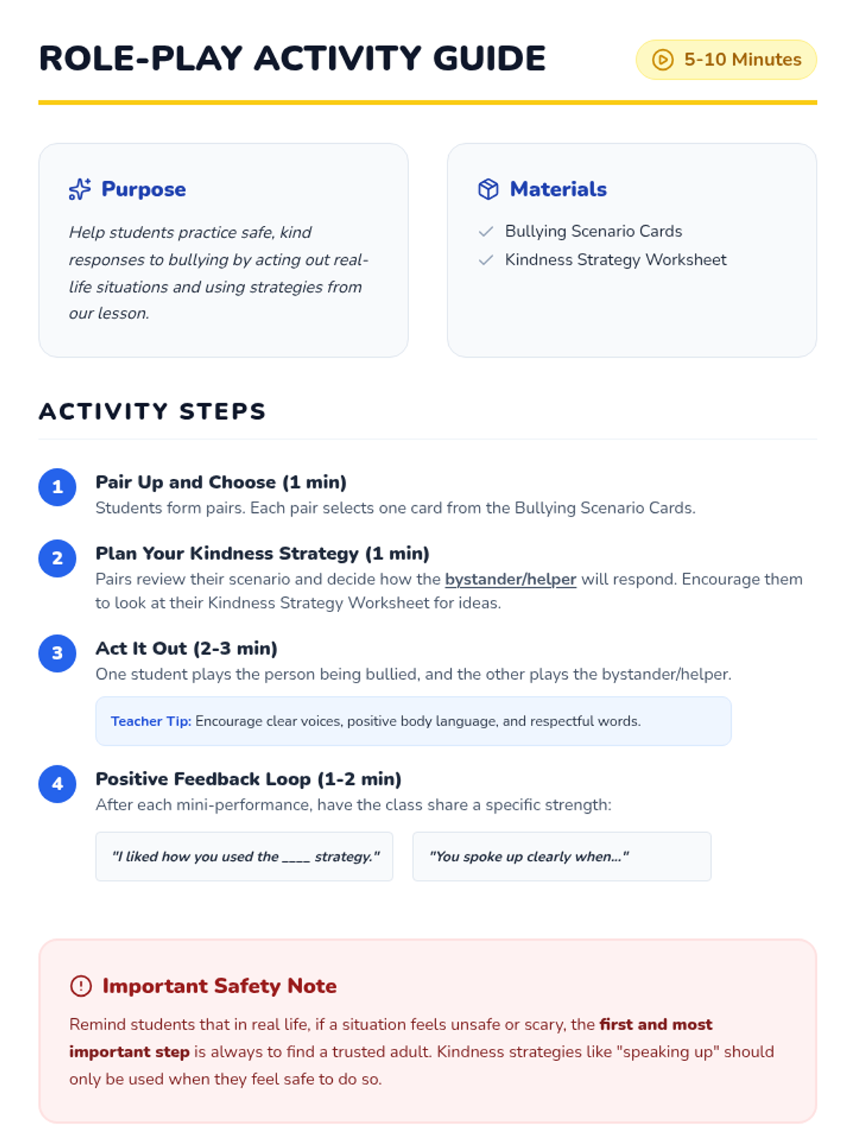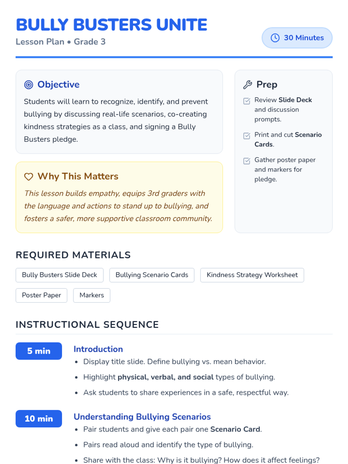 A 30-minute lesson for 3rd graders focused on recognizing bullying, practicing empathy, and developing actionable kindness strategies to create a safe classroom community.