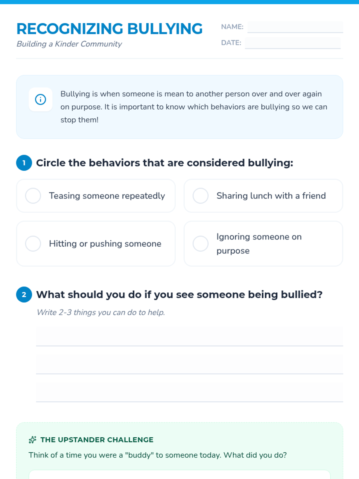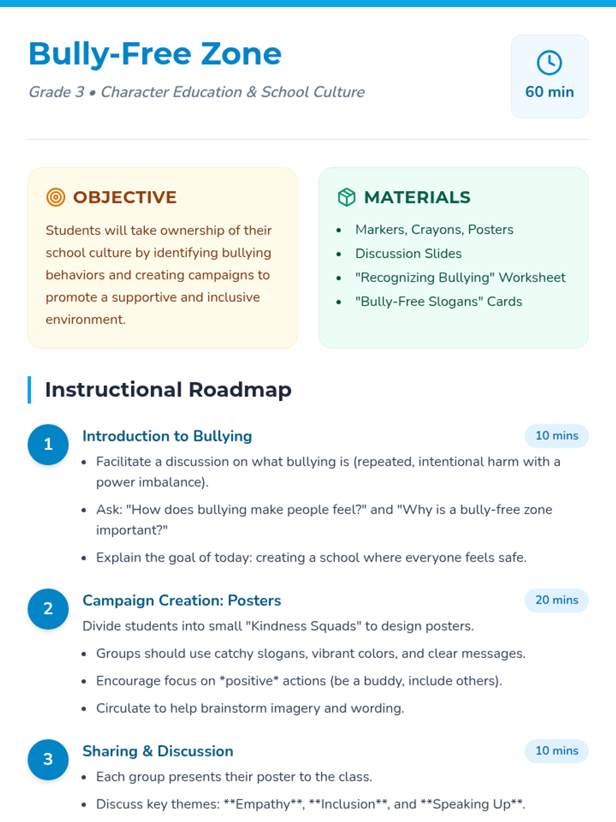 Students will explore what bullying is, how to identify it, and work together to promote a supportive, inclusive school culture through discussion and campaign creation.