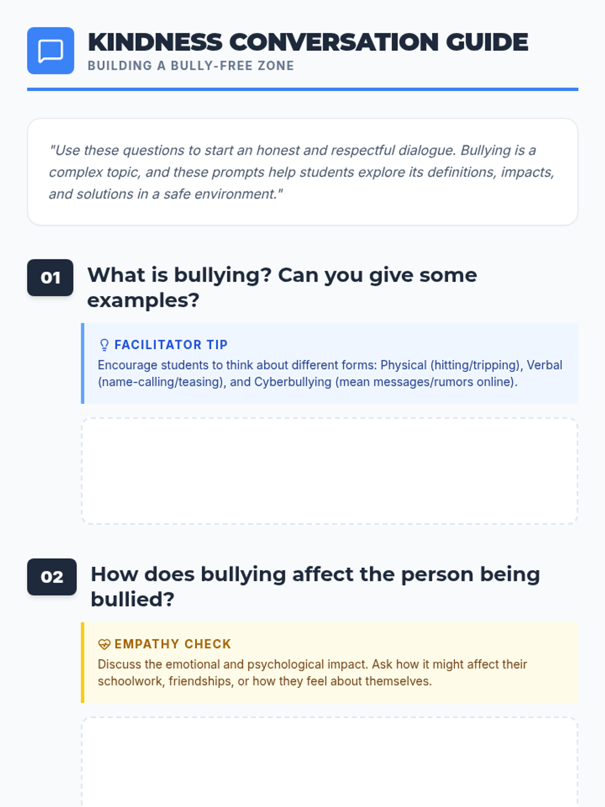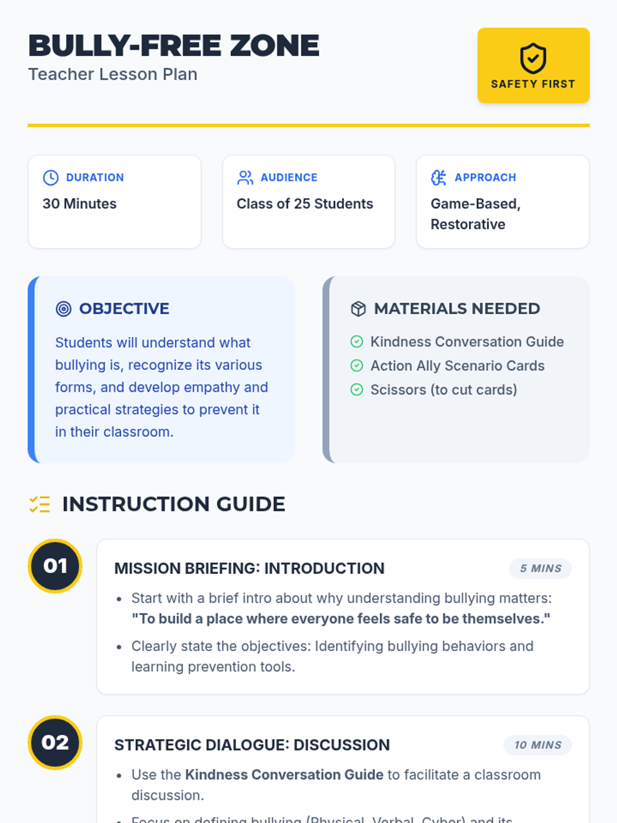 This lesson helps students identify bullying behaviors, understand their impact, and develop empathy through role-playing and collaborative discussion to create a safe, supportive classroom environment.