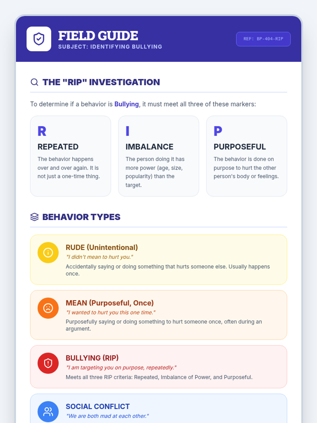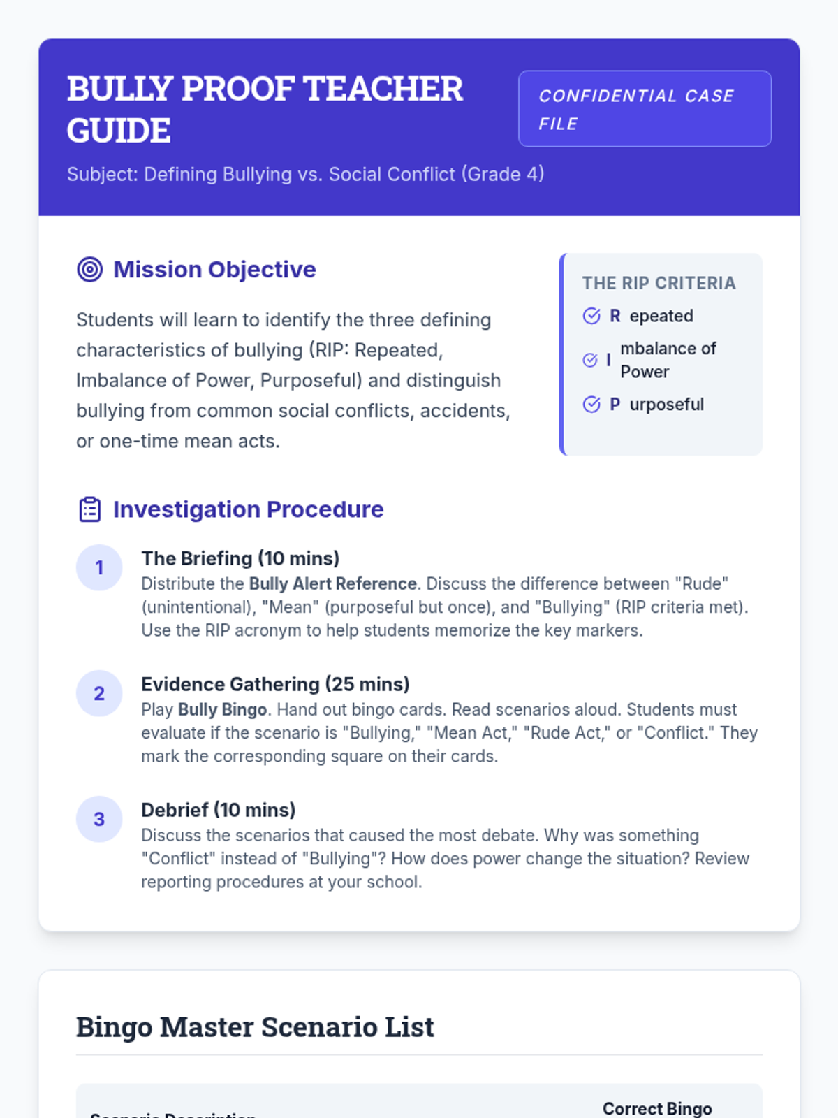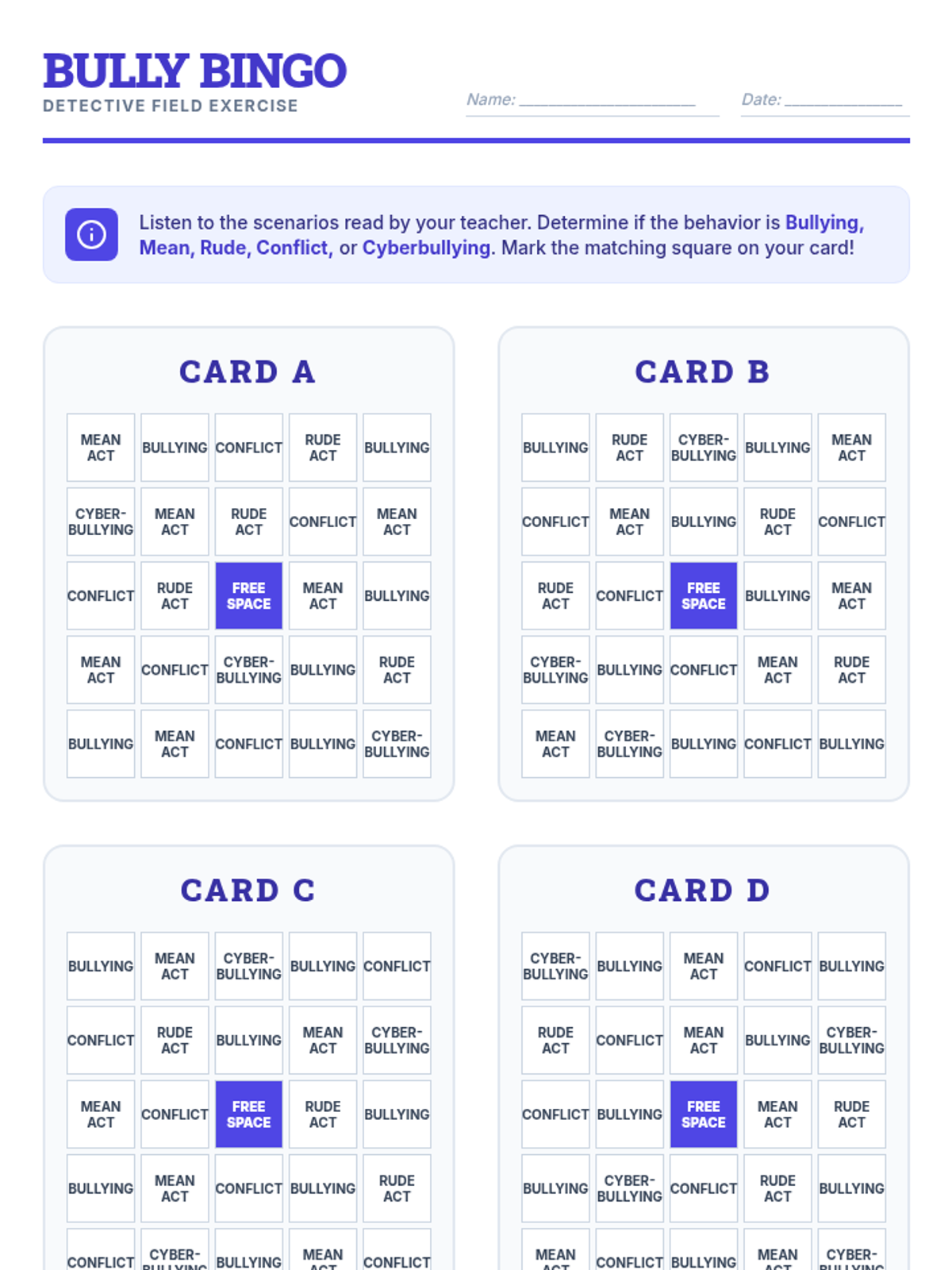 An investigation-themed lesson for 4th graders to distinguish between rude behavior, mean behavior, and bullying using the RIP criteria (Repeated, Imbalance of Power, Purposeful). Students apply these definitions through a scenario-based bingo game.