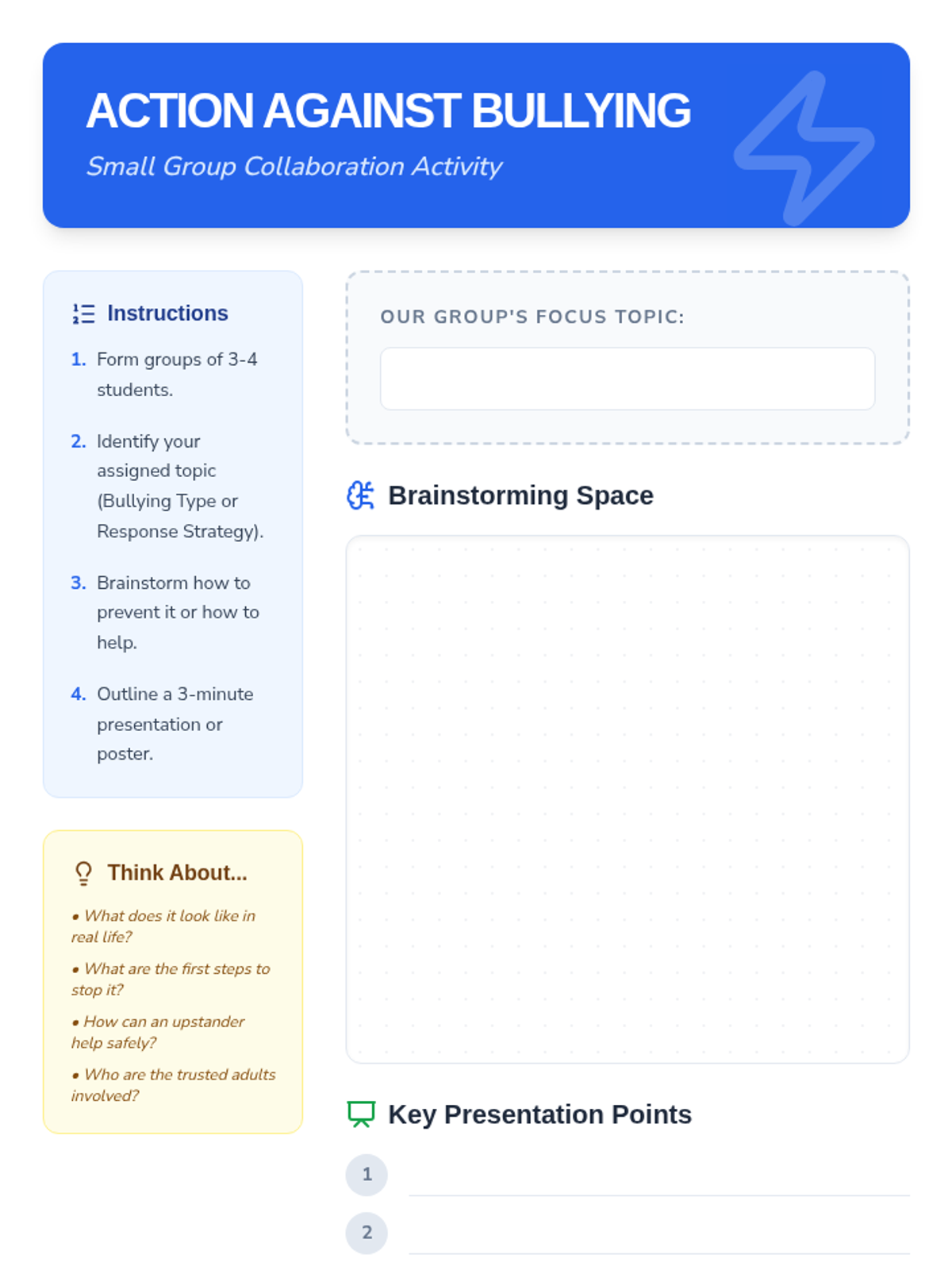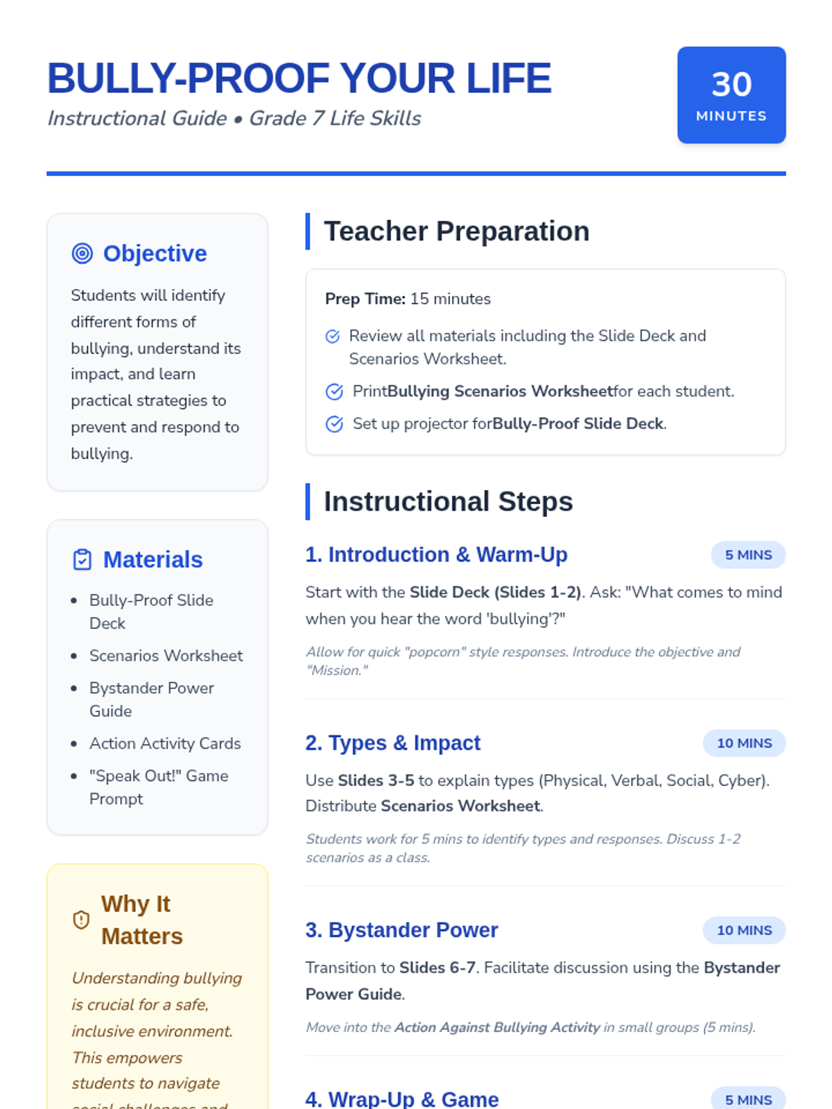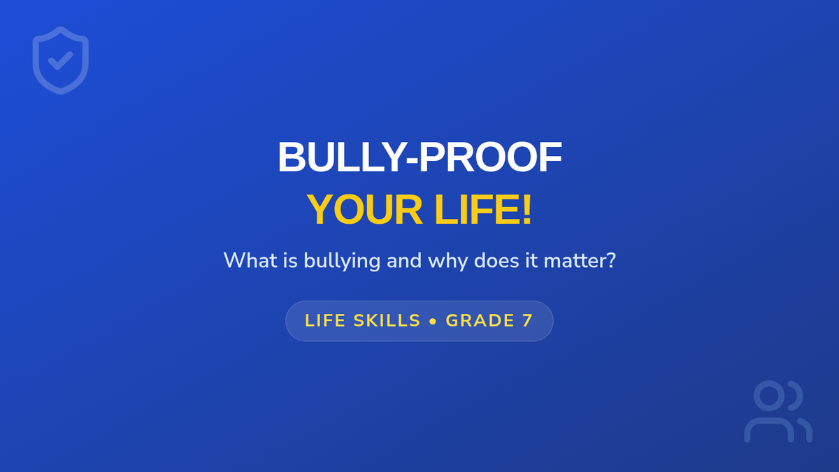 A comprehensive 30-minute lesson for 7th graders focused on identifying bullying types, understanding its impact, and developing practical 'upstander' strategies. Students engage through slides, scenarios, and interactive activities.