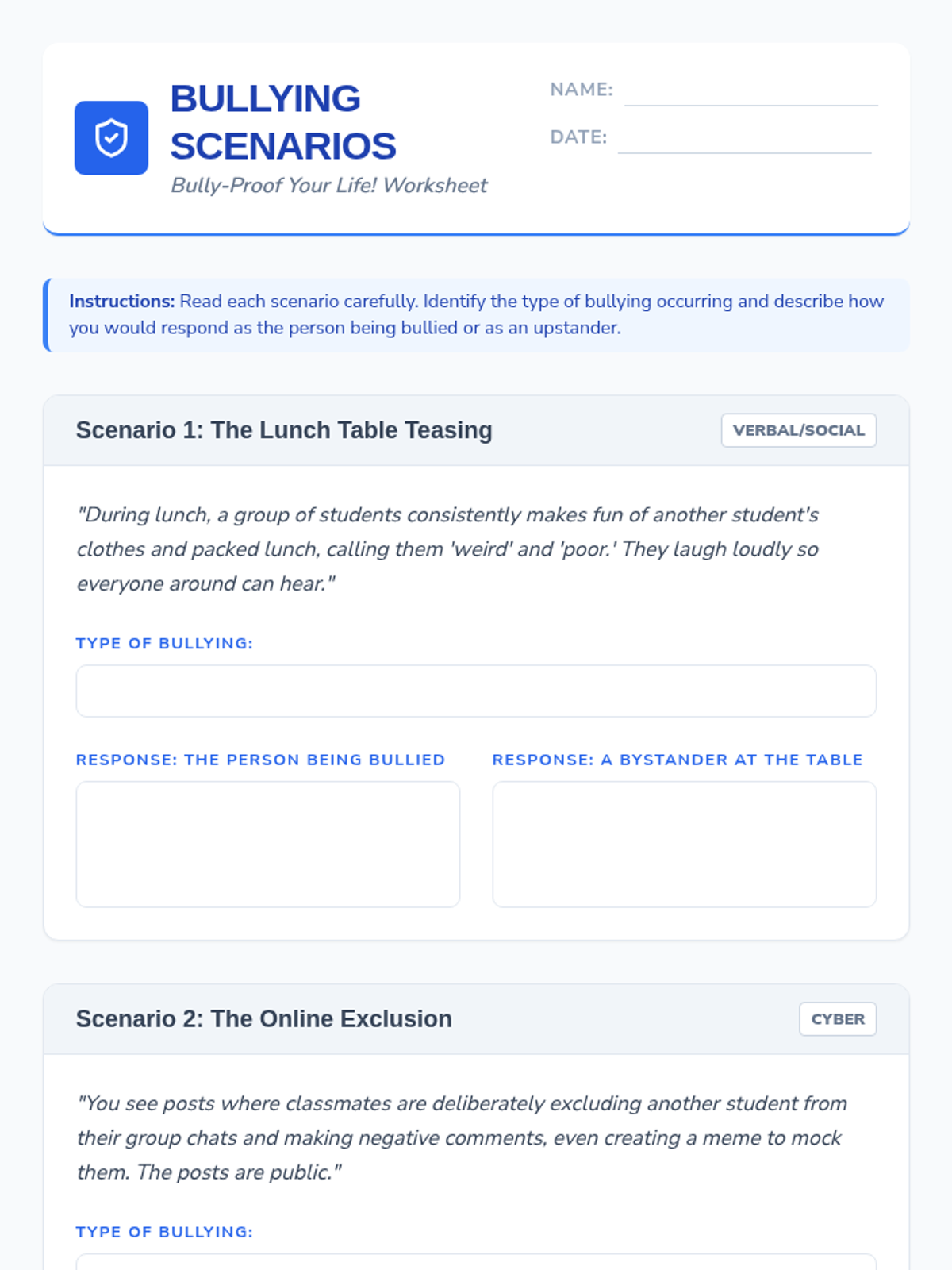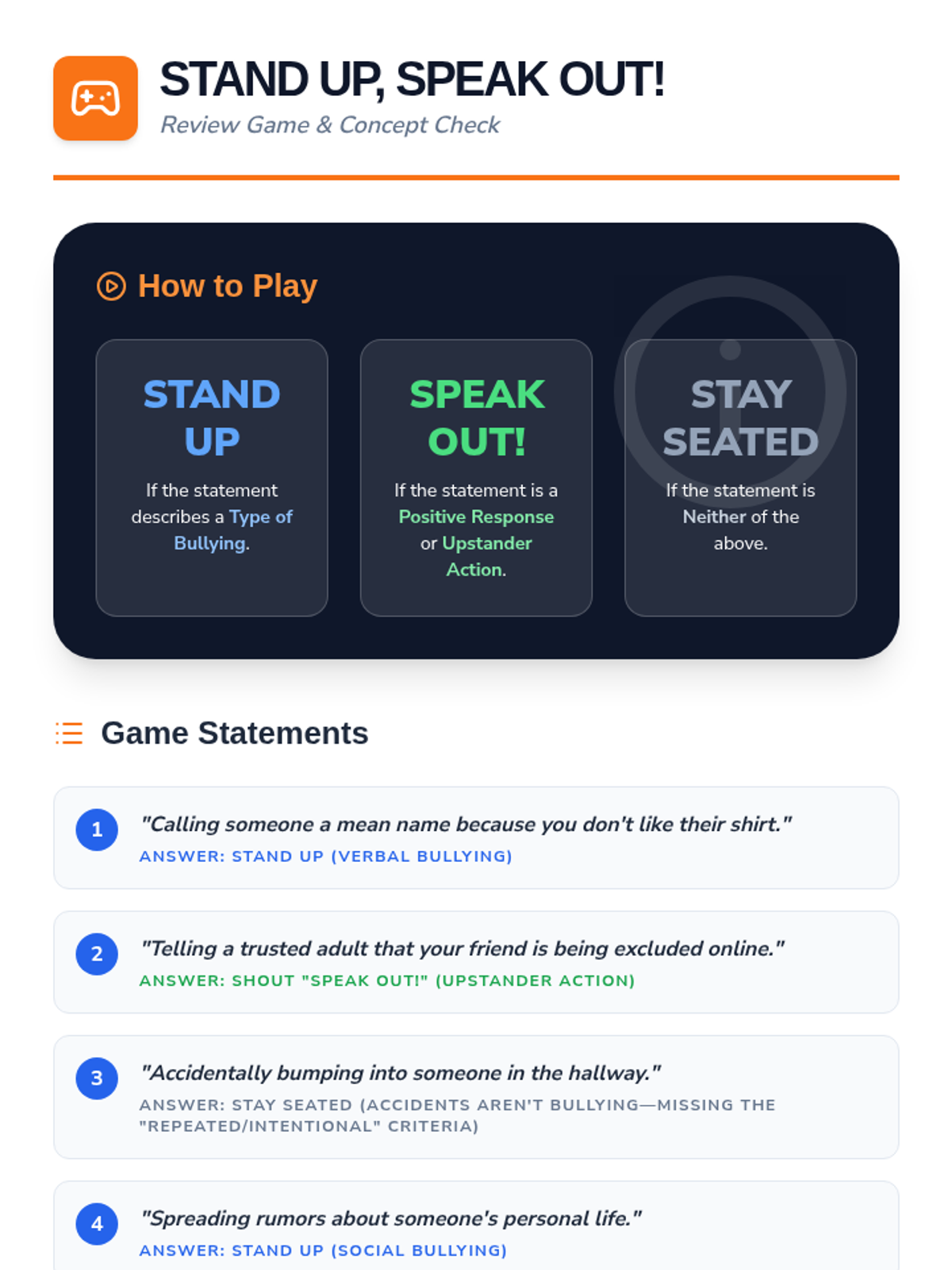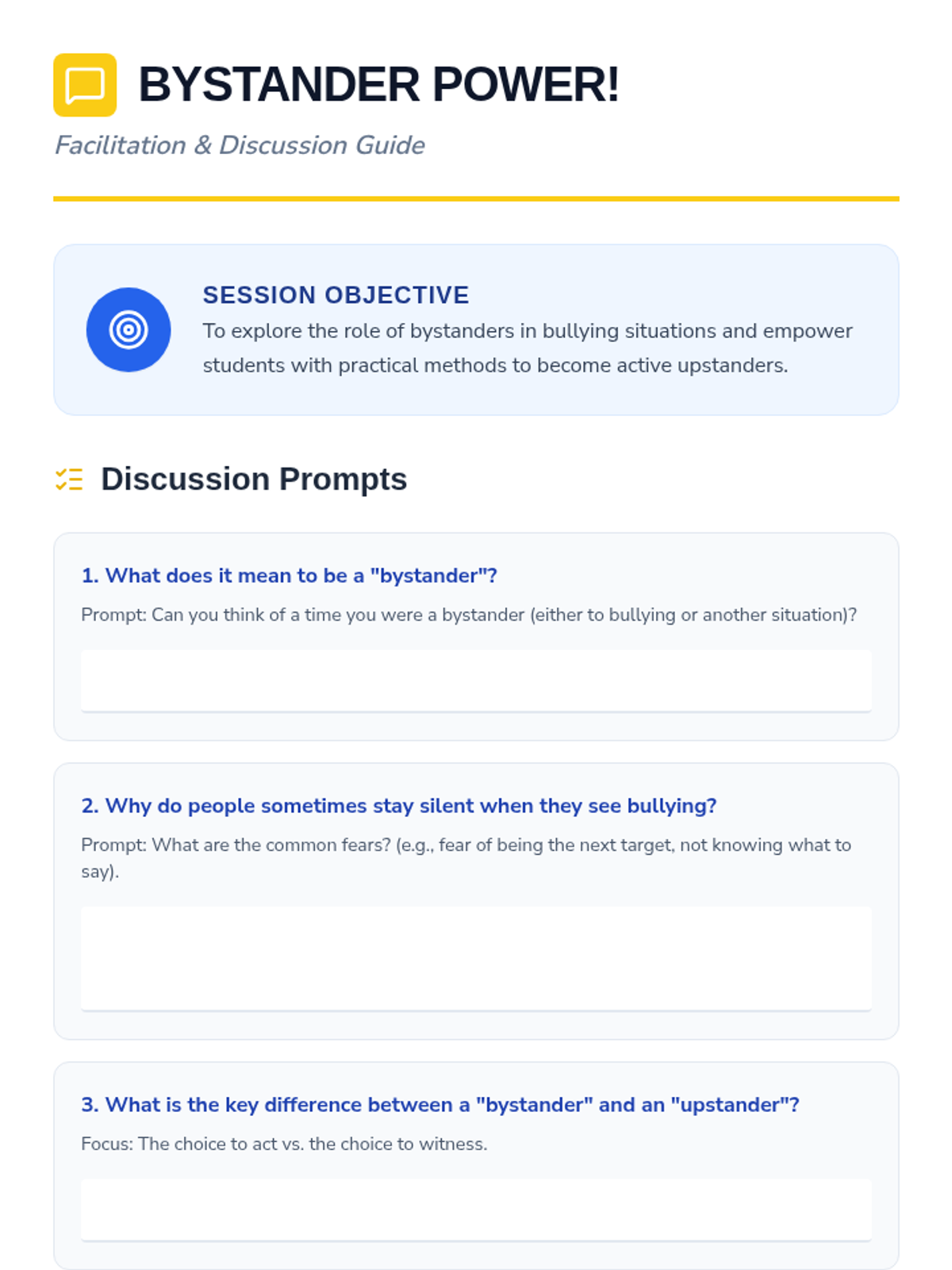 A comprehensive 30-minute lesson for 7th graders focused on identifying bullying types, understanding its impact, and developing practical 'upstander' strategies. Students engage through slides, scenarios, and interactive activities.