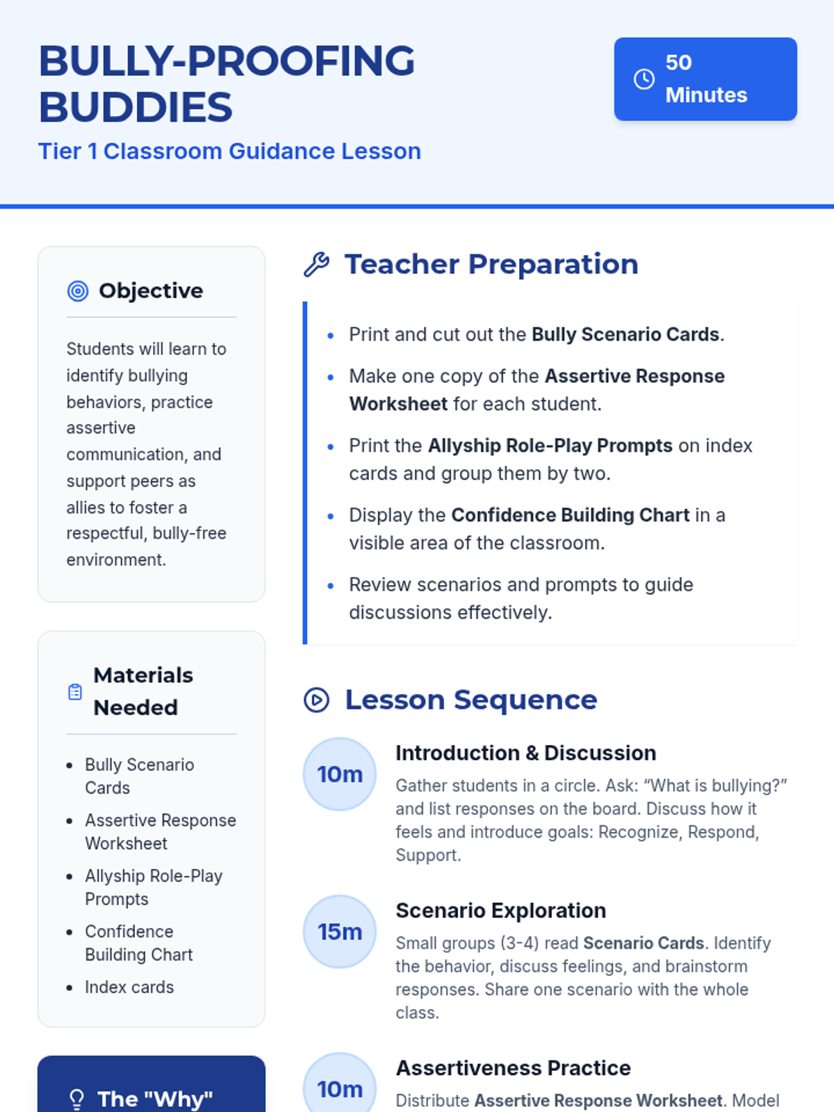A Tier 1 lesson for 3rd graders focused on identifying bullying, practicing assertive communication, and developing allyship skills to create a respectful classroom environment.