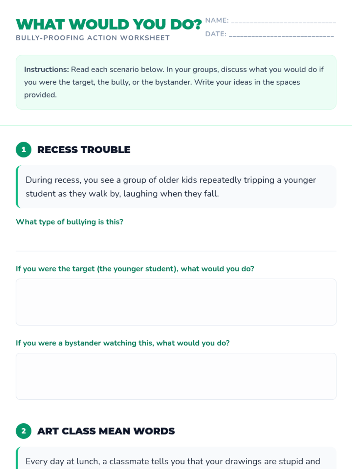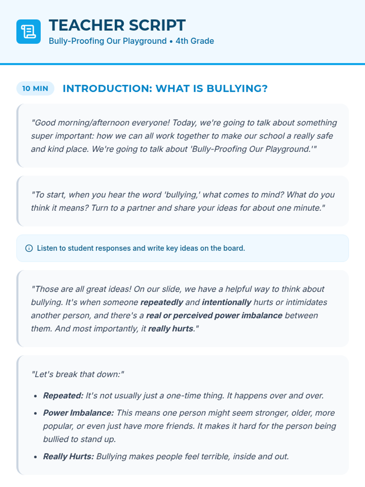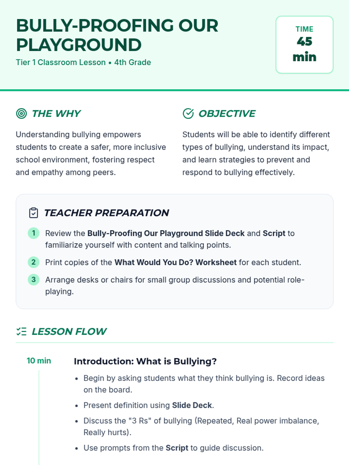 A 45-minute lesson for 4th-grade students designed to identify types of bullying, understand its impact, and empower students with strategies to respond as targets or upstanders.
