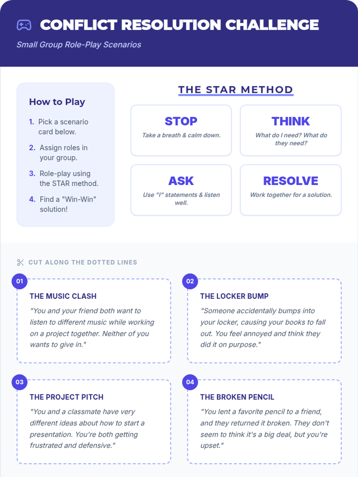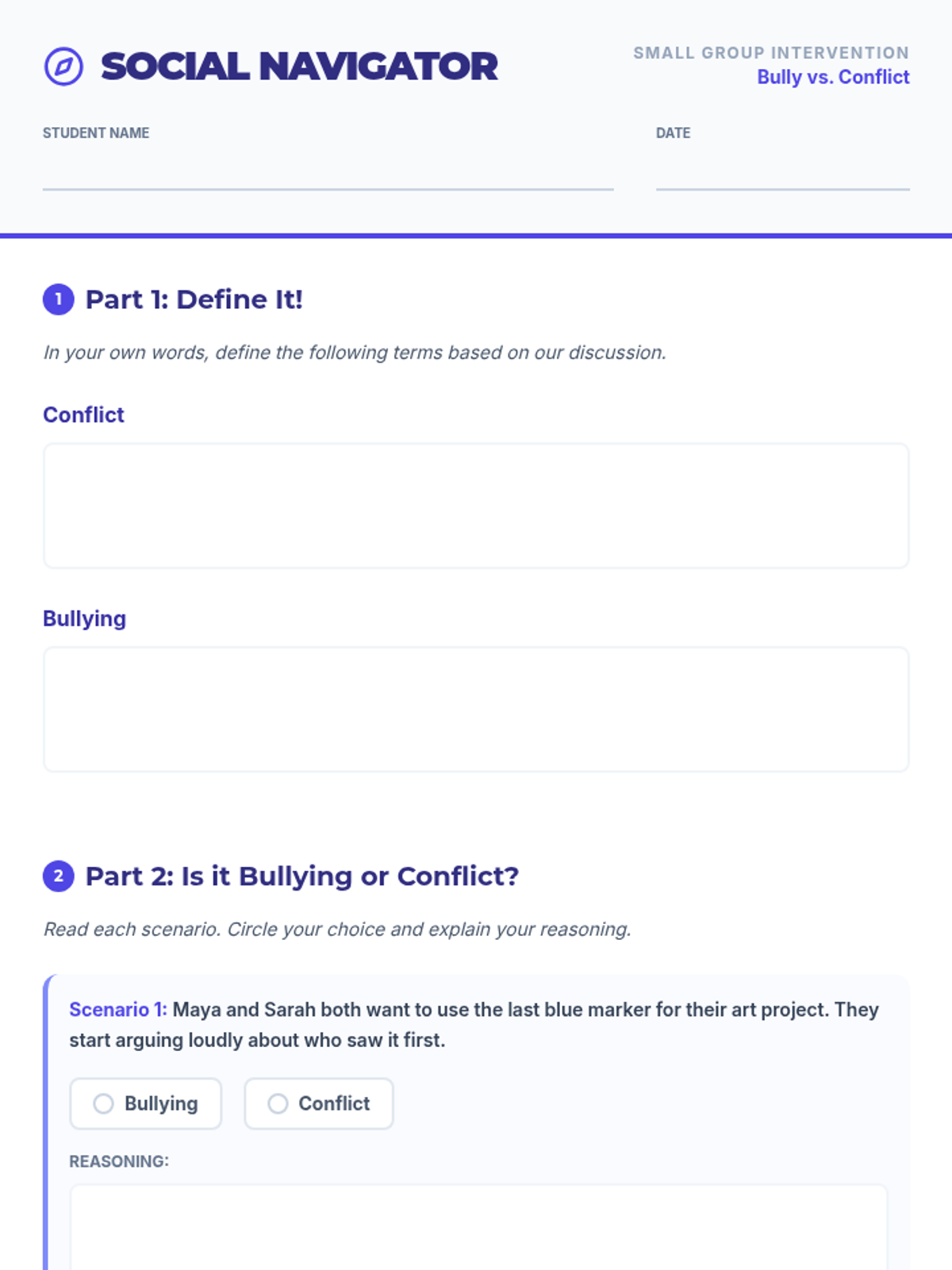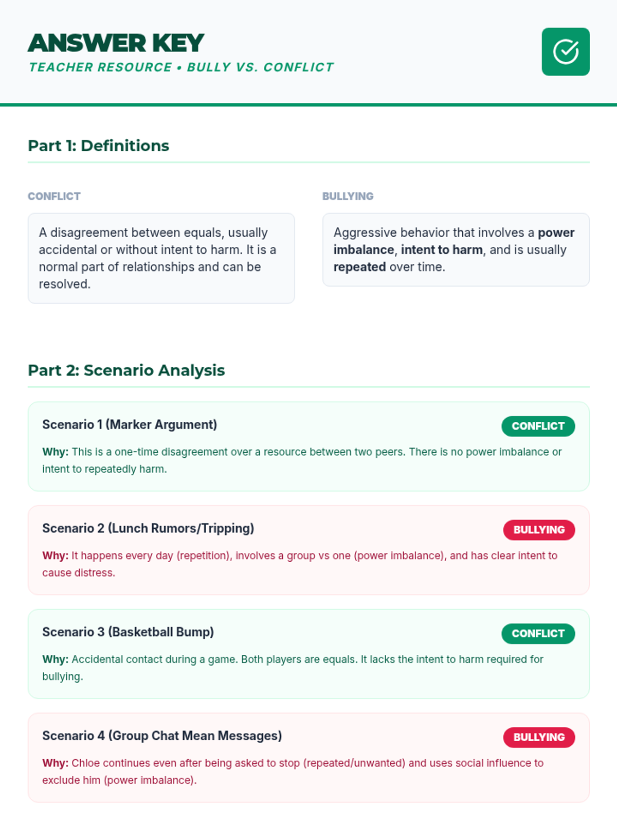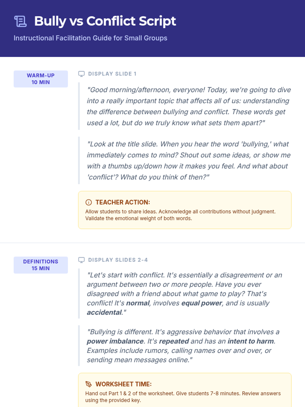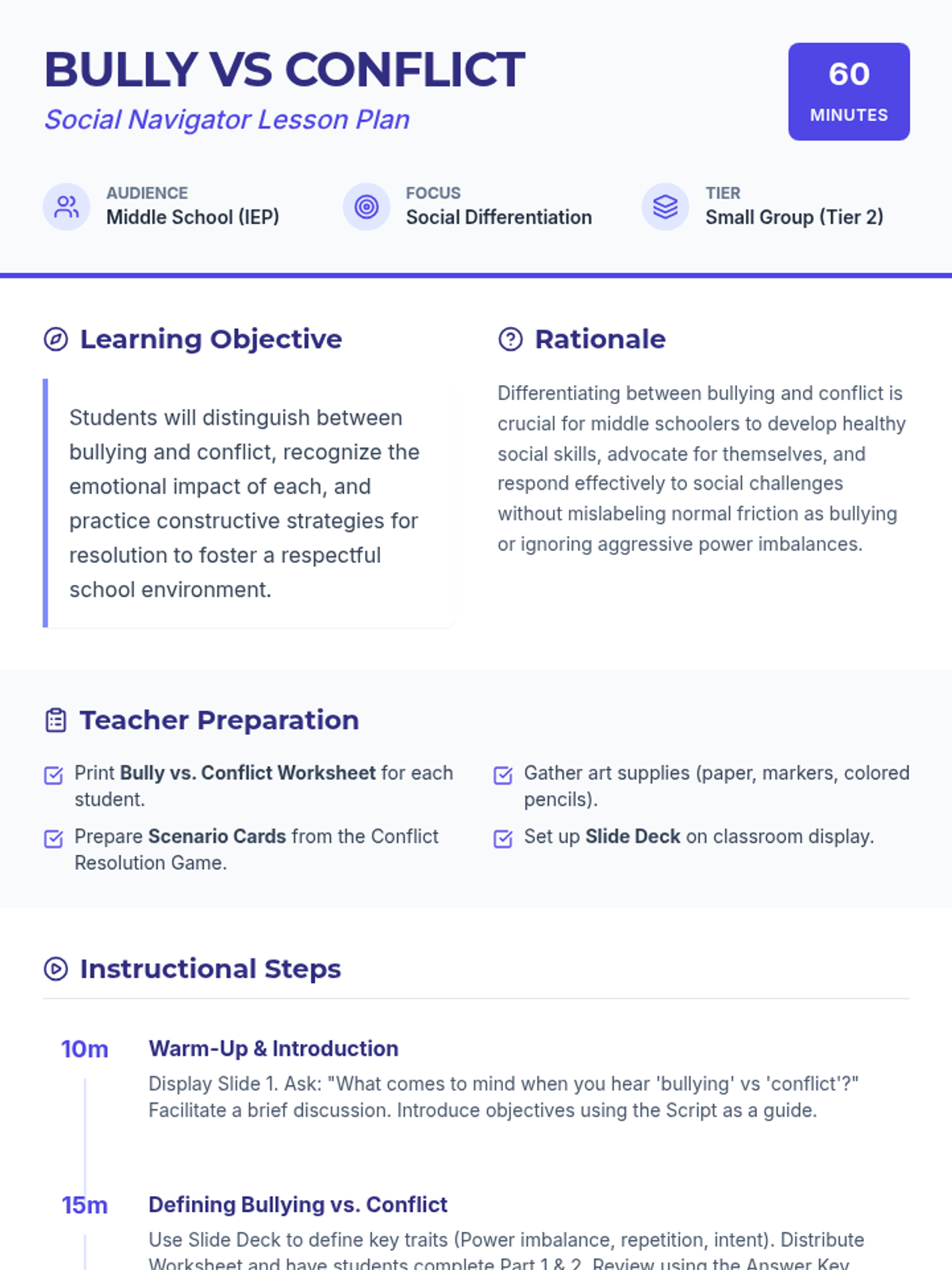 A Tier 2 social-emotional learning lesson for middle school students to distinguish between bullying and conflict, understand their impacts, and practice resolution strategies.