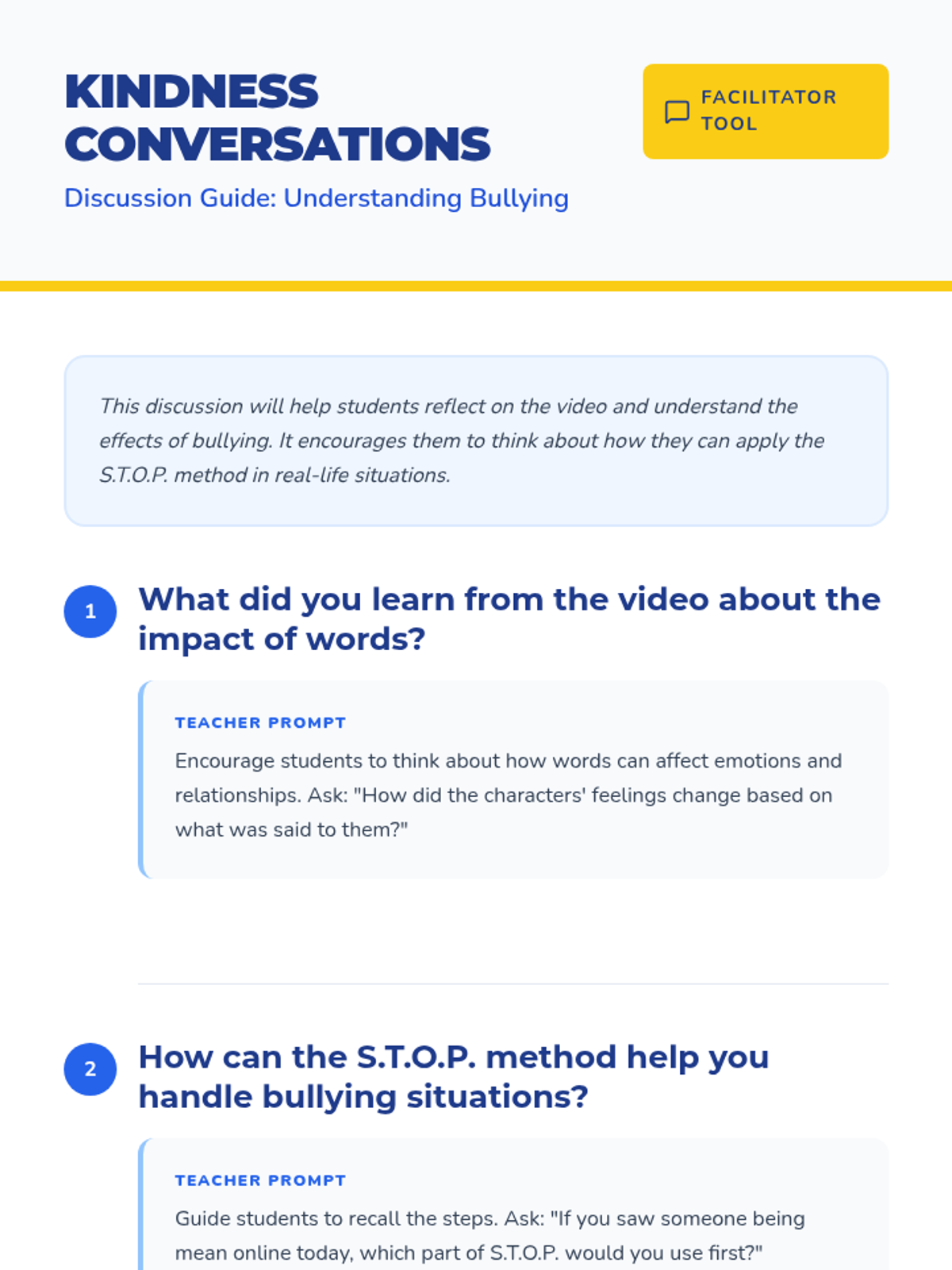 This lesson introduces 4th-grade students to the effects of bullying and the impact of negative interactions. Students will learn the S.T.O.P. method to handle bullying and promote kindness in their classroom community.