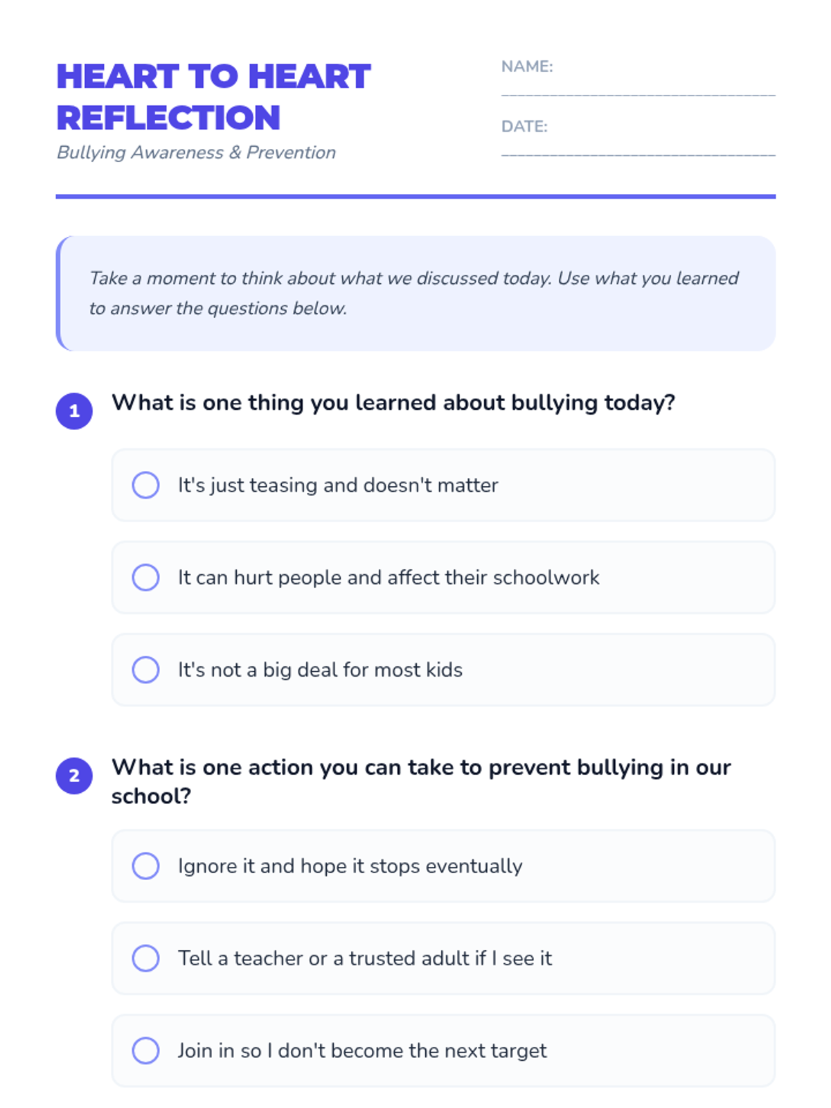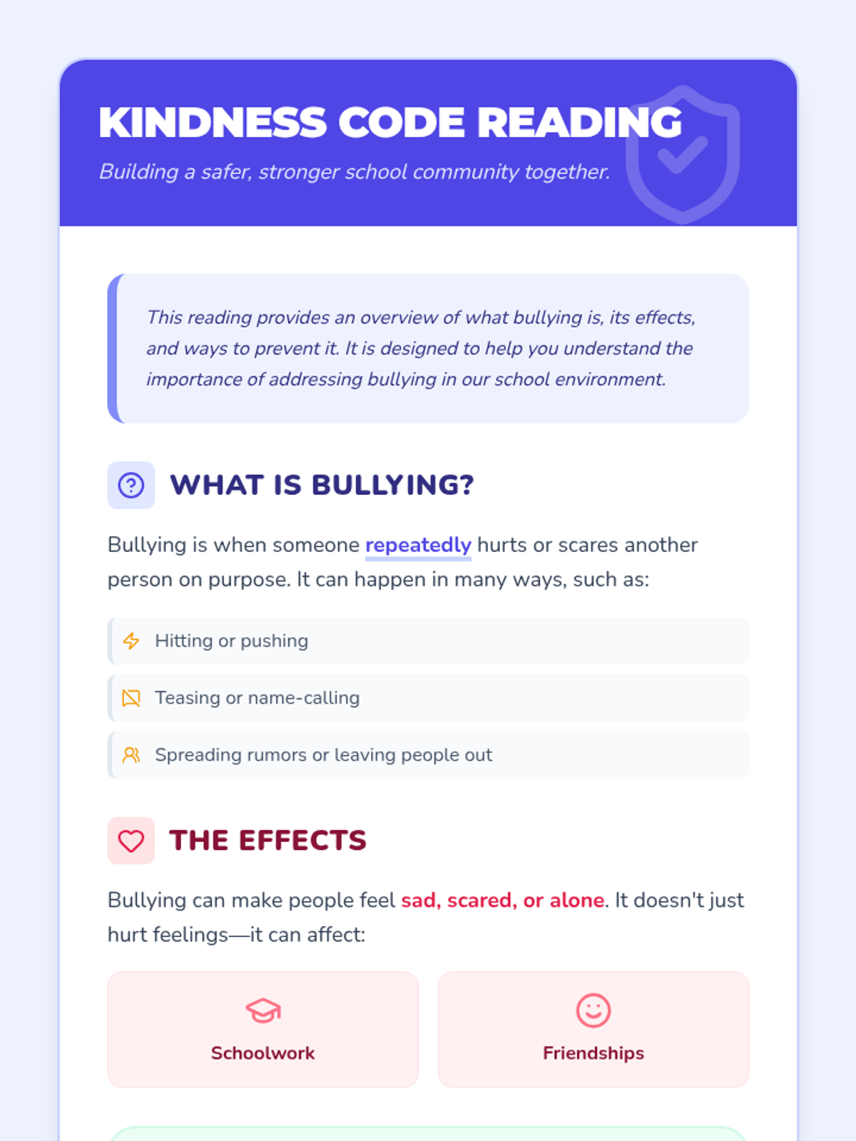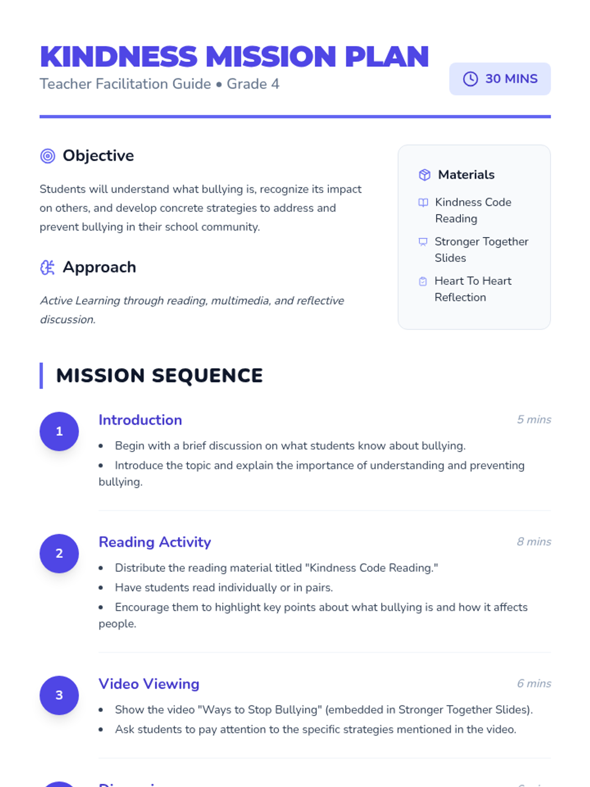 This lesson aims to educate 4th-grade students about bullying, its effects, and ways to prevent it. Through a combination of reading, video, and discussion, students will learn to identify bullying behaviors and develop strategies to address them. This lesson is important as it empowers students to create a safe and supportive school environment, fostering empathy and respect among peers.