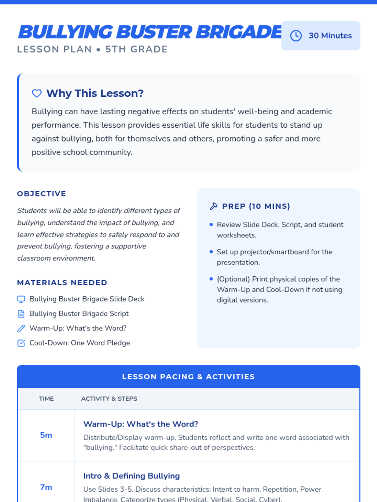 This lesson empowers 5th-grade students to recognize, respond to, and prevent bullying effectively and safely using the '3 Rs' framework. Students learn to be upstanders and contribute to a positive school culture.