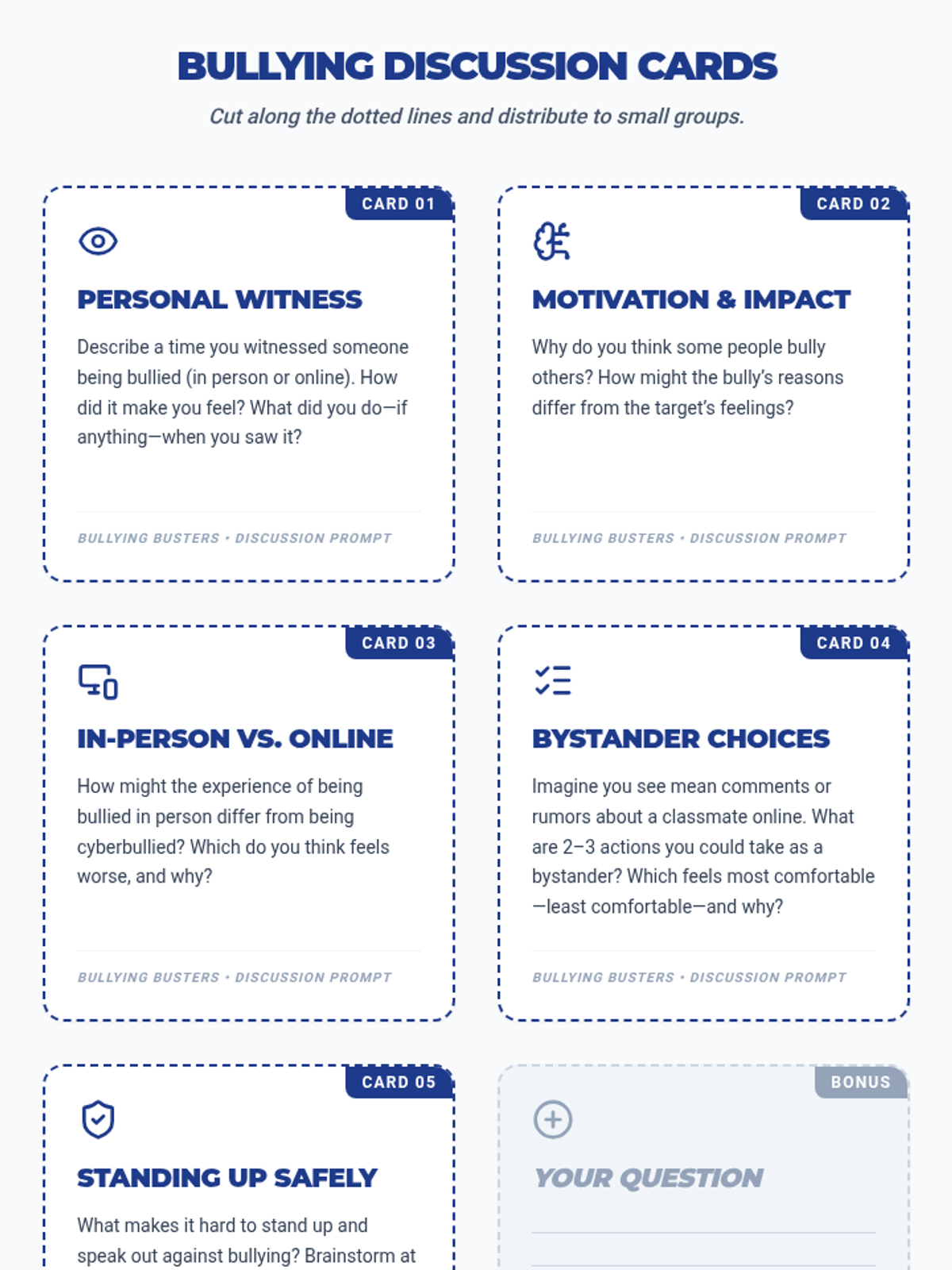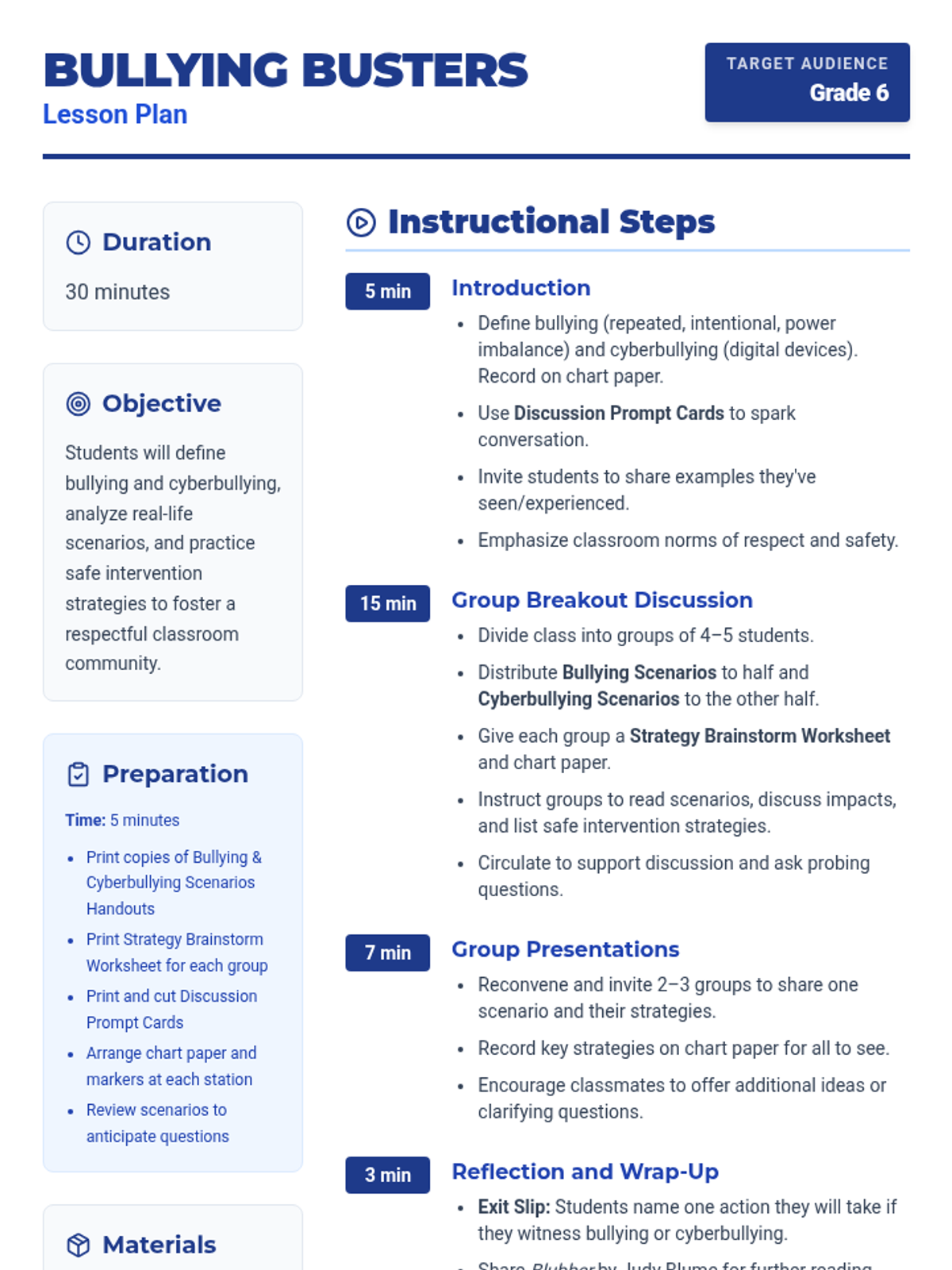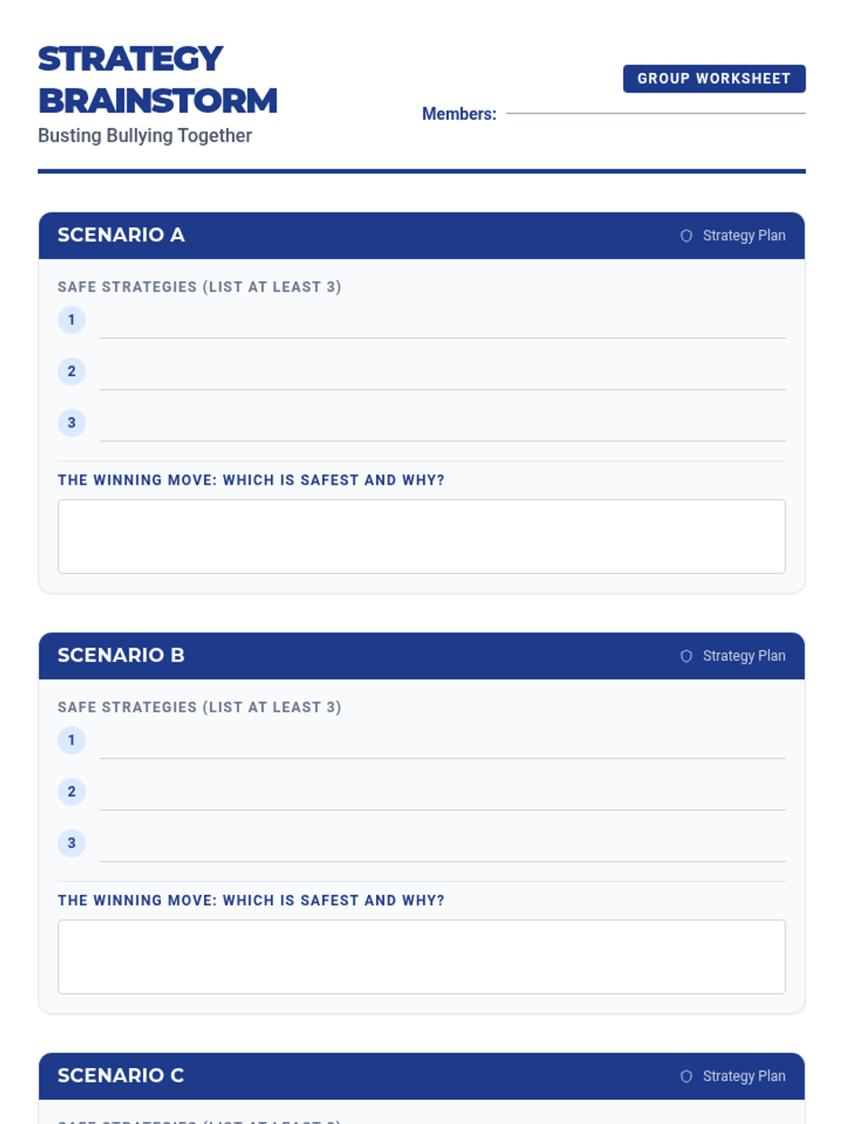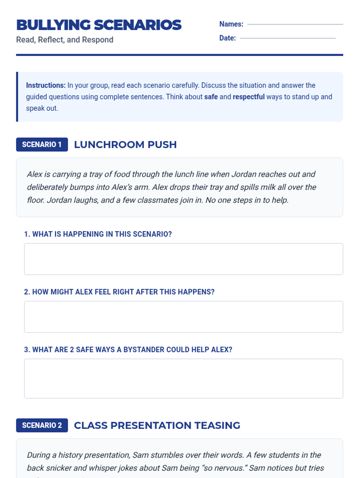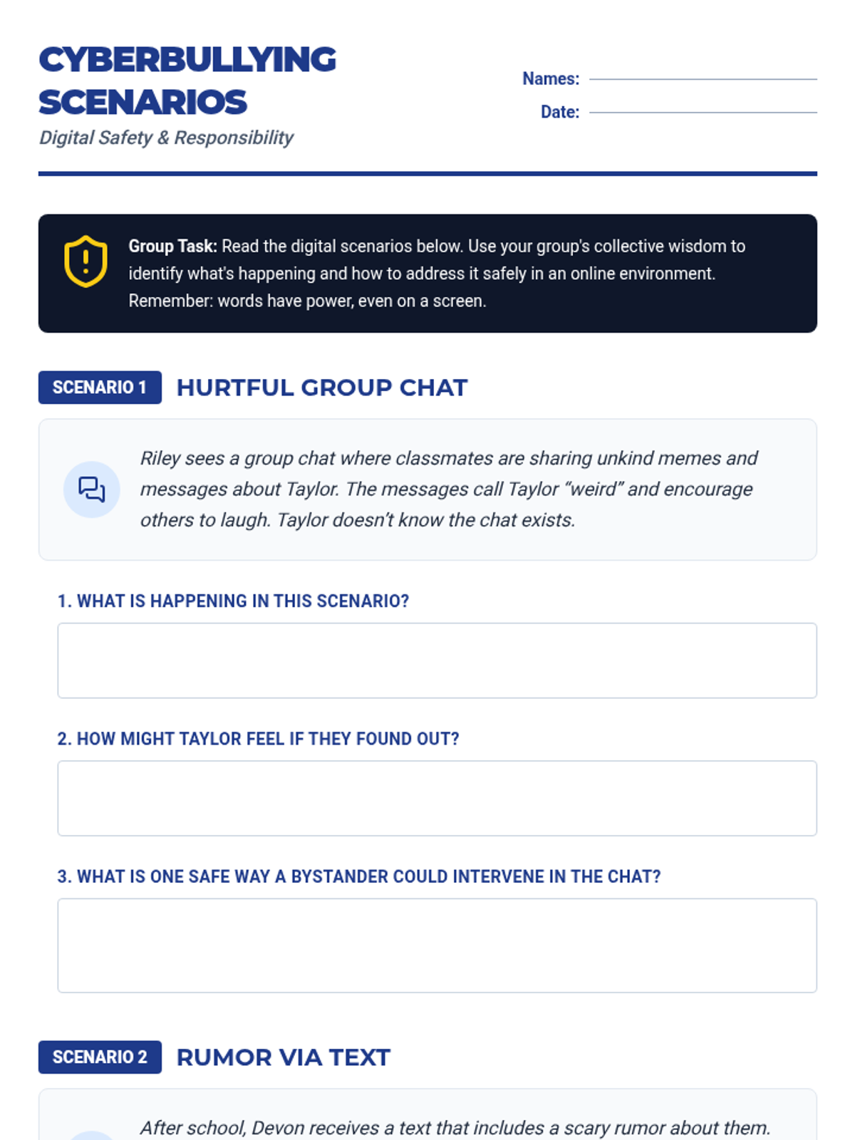 Students define bullying and cyberbullying, recognize their impacts through real-life scenarios, and brainstorm initial intervention strategies.