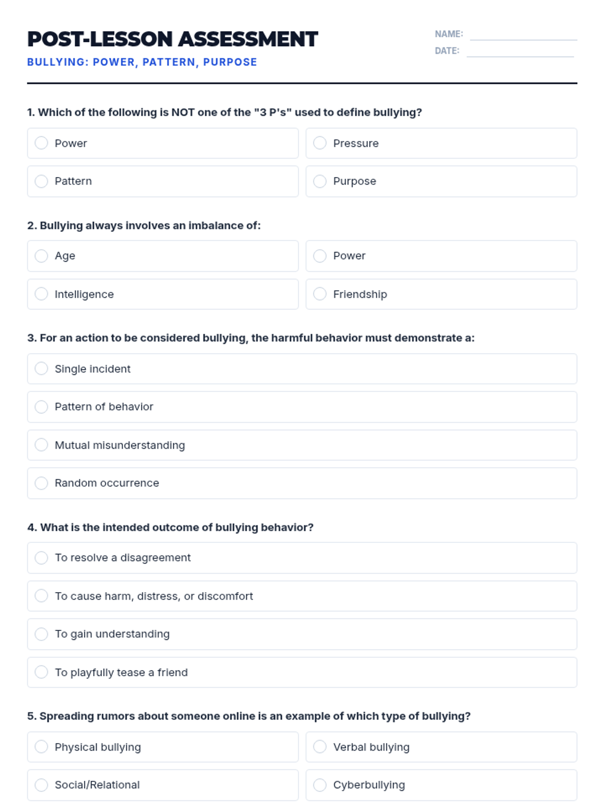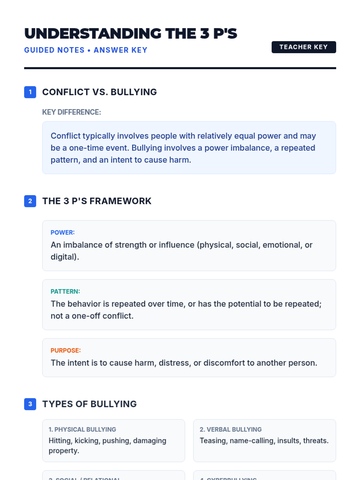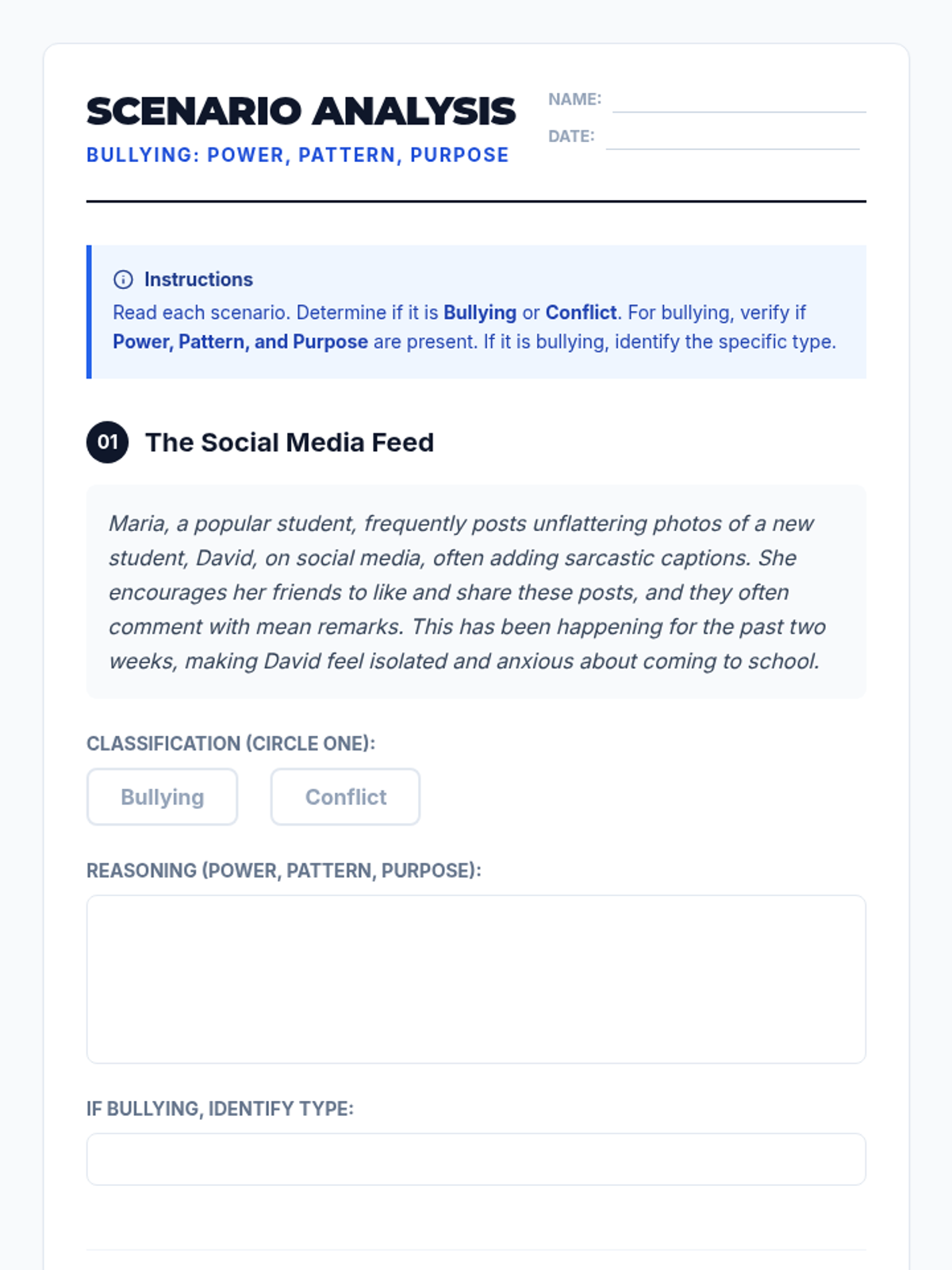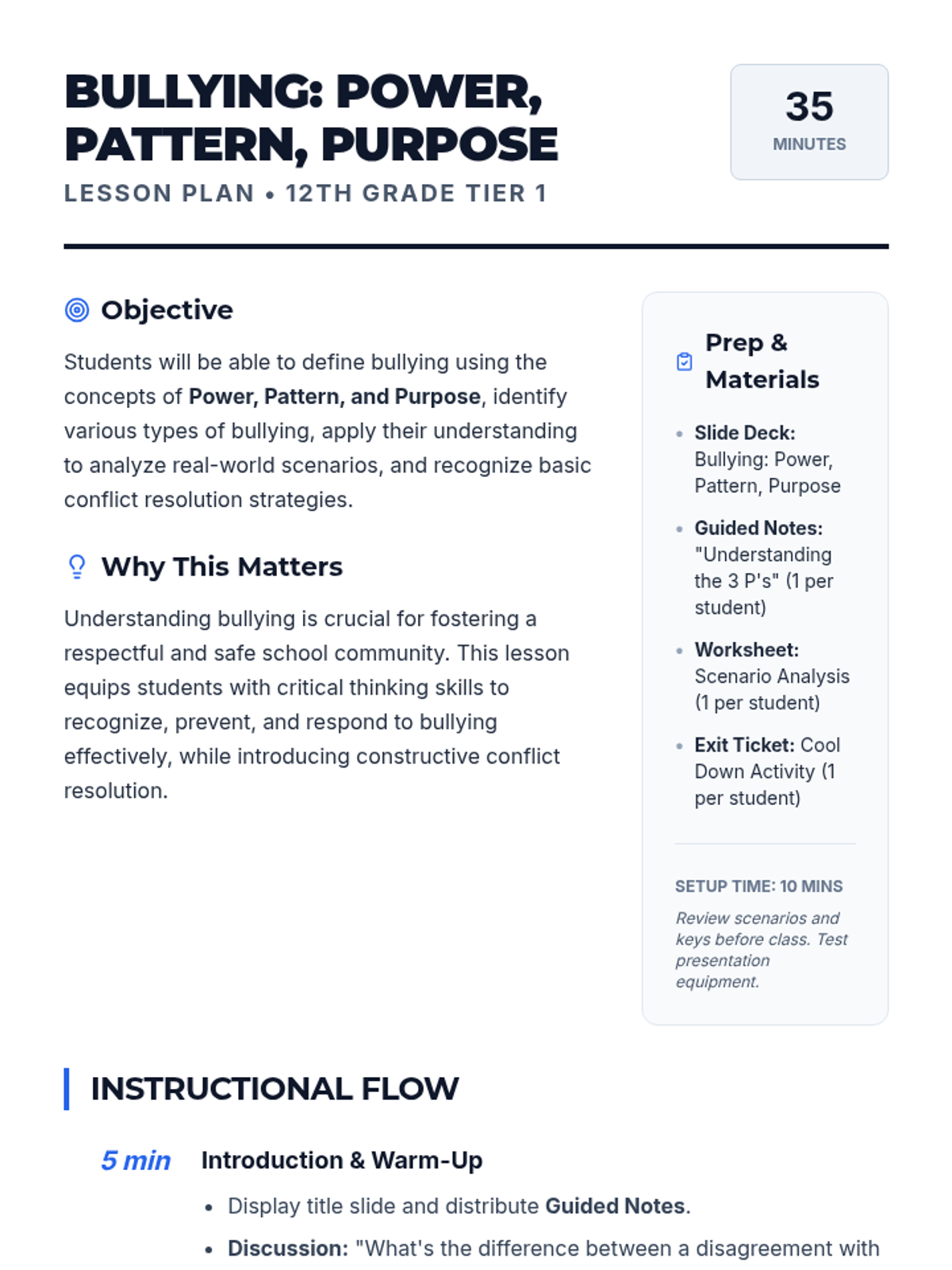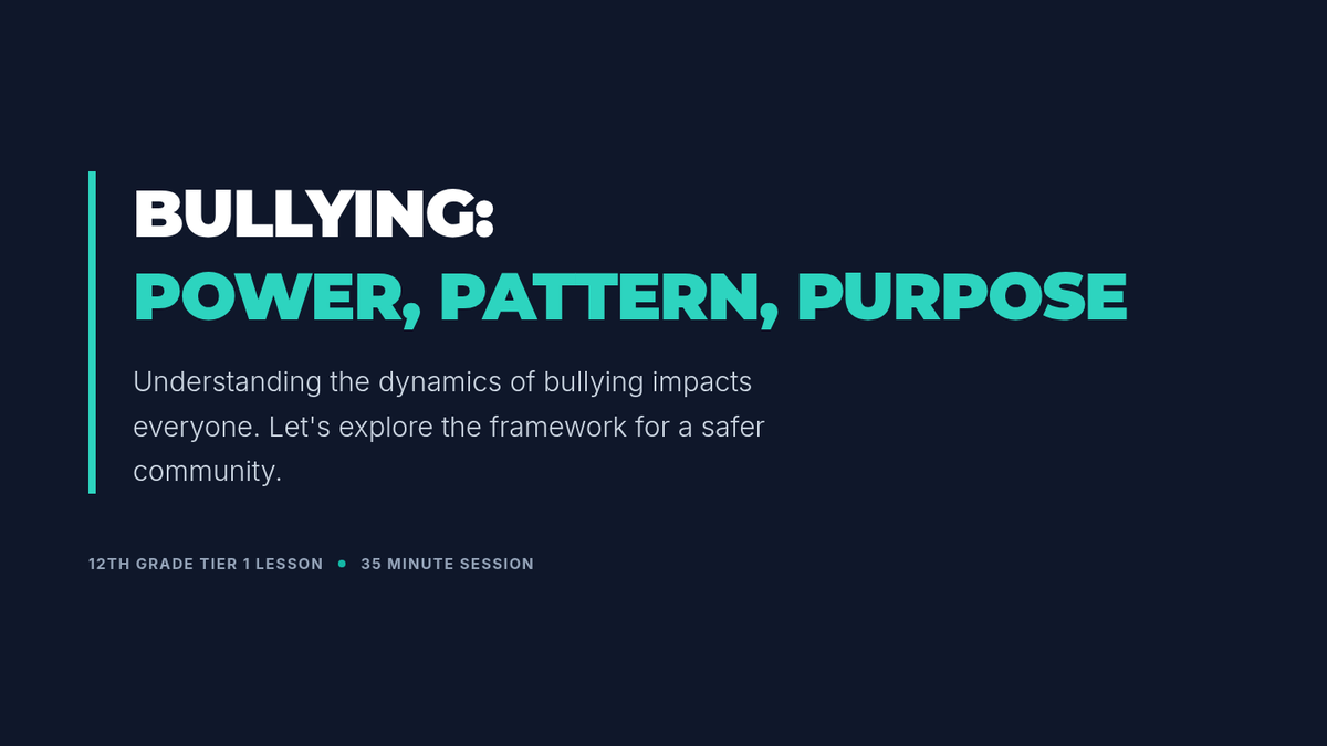 A comprehensive 35-minute lesson for 12th graders that defines bullying through the framework of Power, Pattern, and Purpose, while also introducing basic conflict resolution strategies.