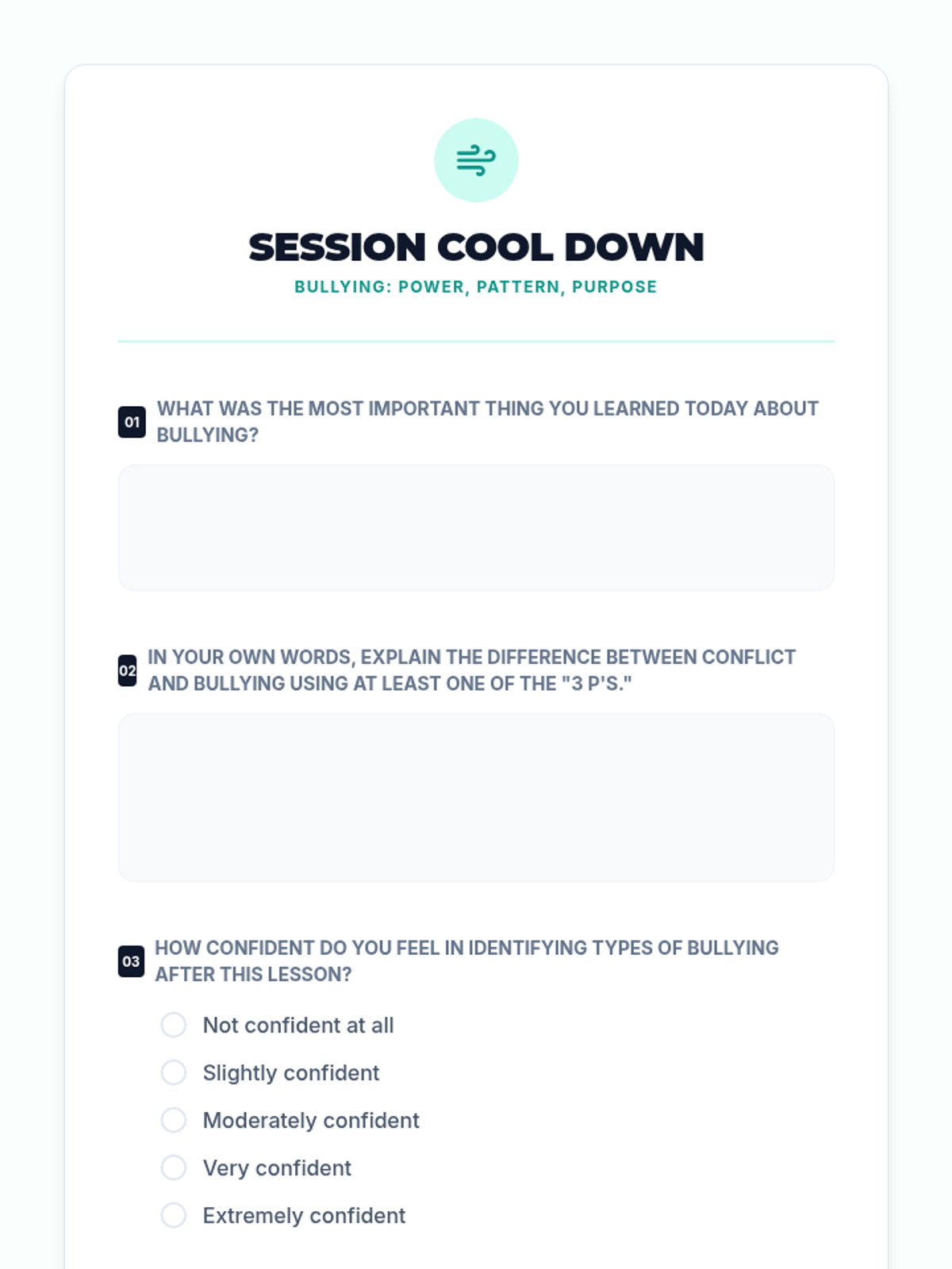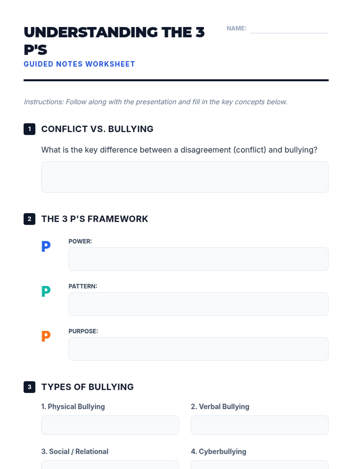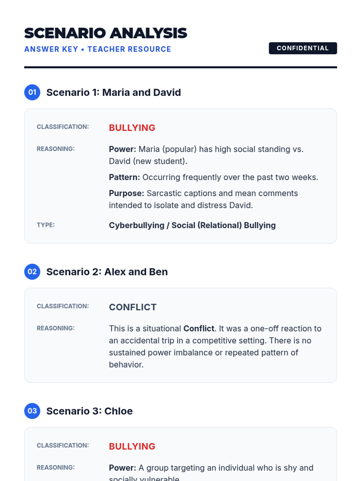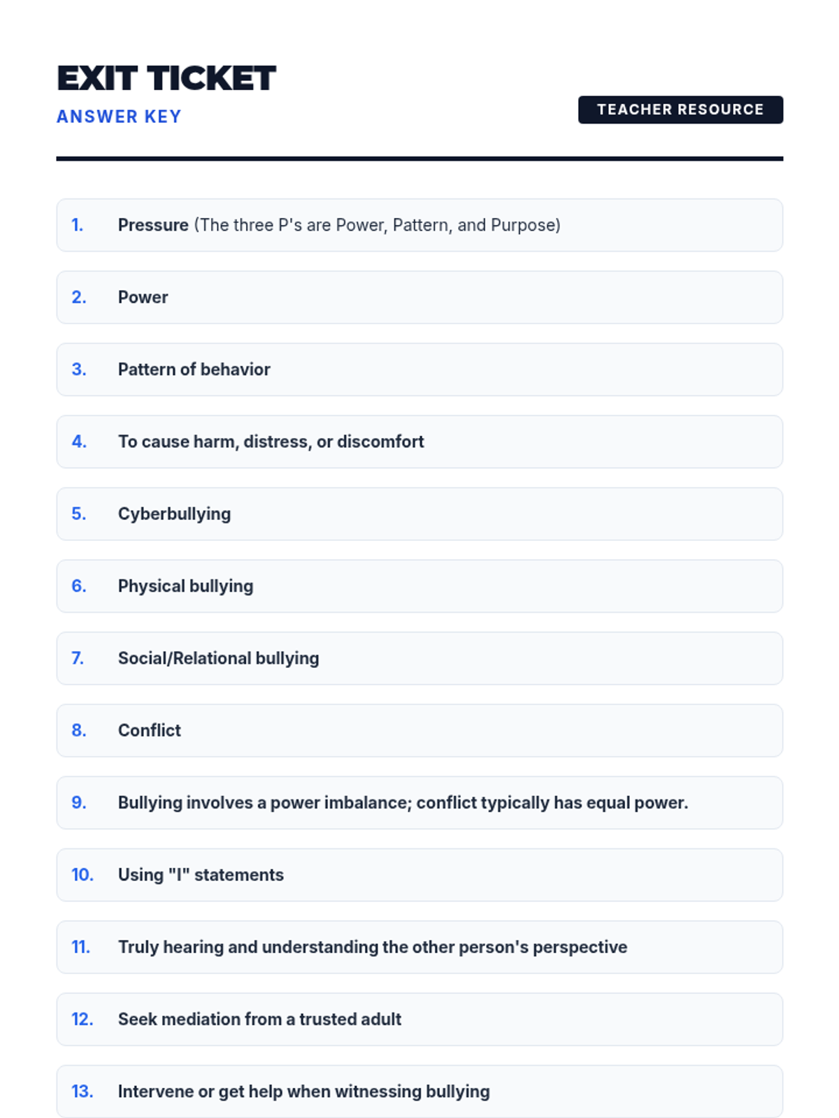 A comprehensive 35-minute lesson for 12th graders that defines bullying through the framework of Power, Pattern, and Purpose, while also introducing basic conflict resolution strategies.