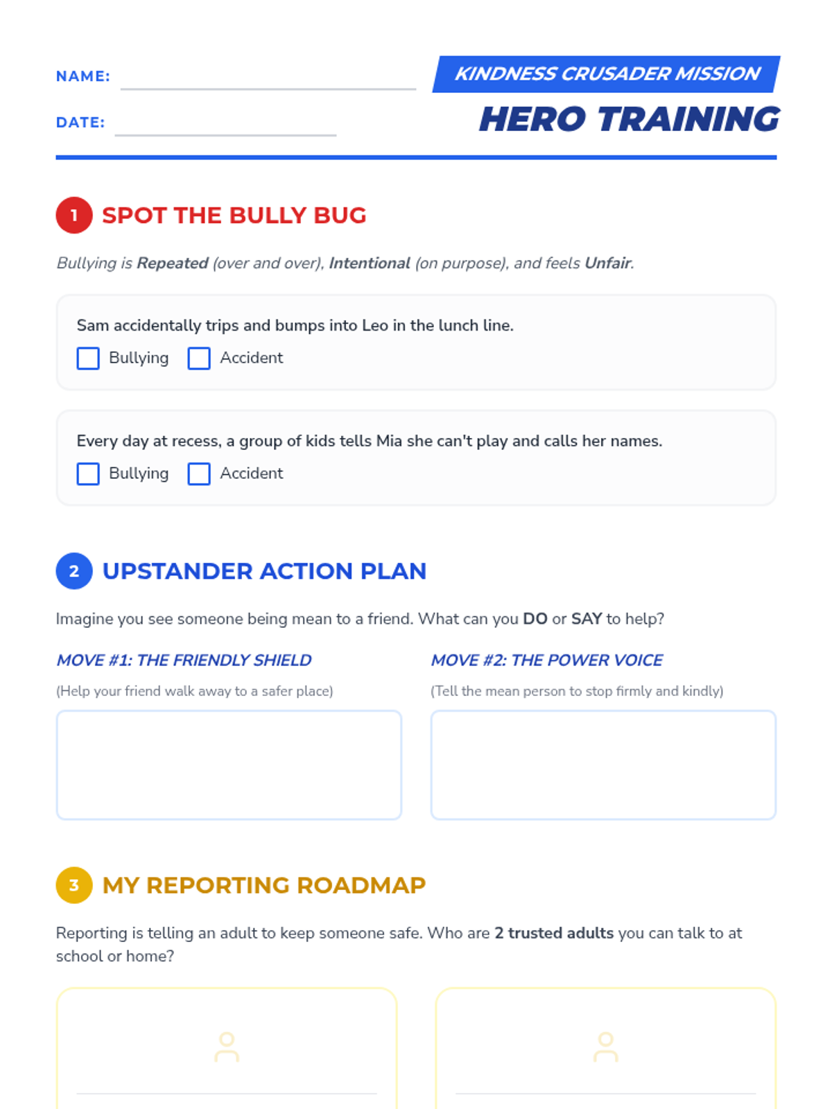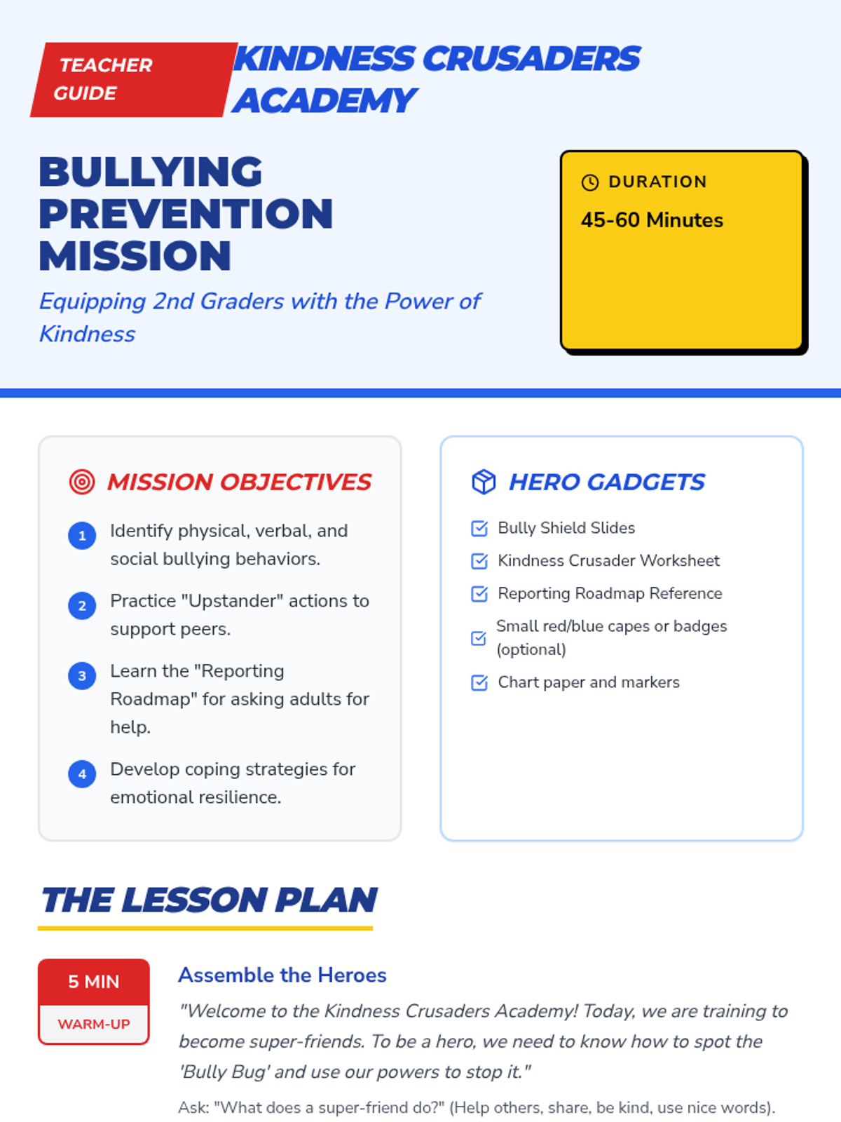 A comprehensive 2nd-grade lesson on bullying prevention, focusing on identifying bullying behaviors, upstander actions, reporting strategies, and coping skills through a 'Kindness Crusaders' superhero theme.