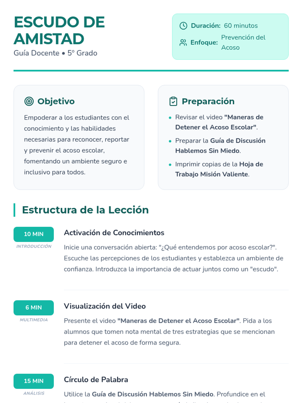 Esta lección empodera a los estudiantes para reconocer y prevenir el acoso escolar mediante el análisis de situaciones reales y el desarrollo de estrategias de apoyo mutuo.