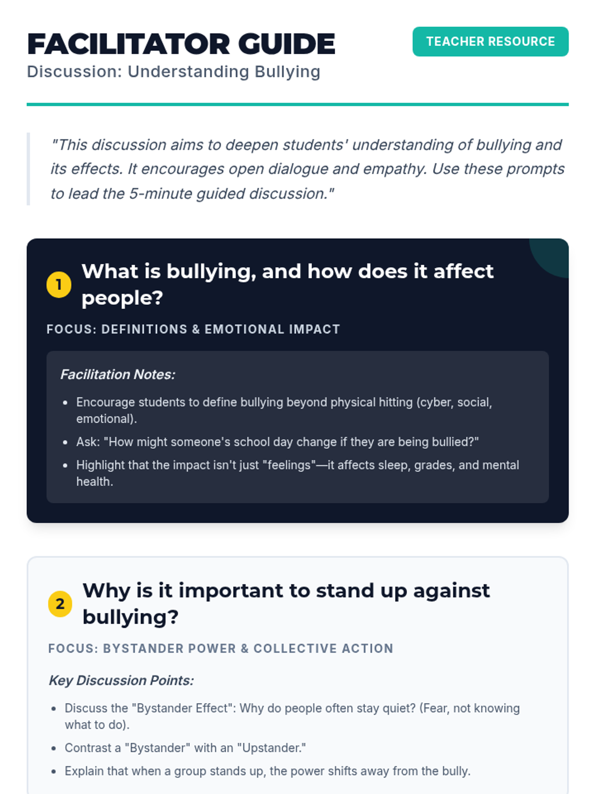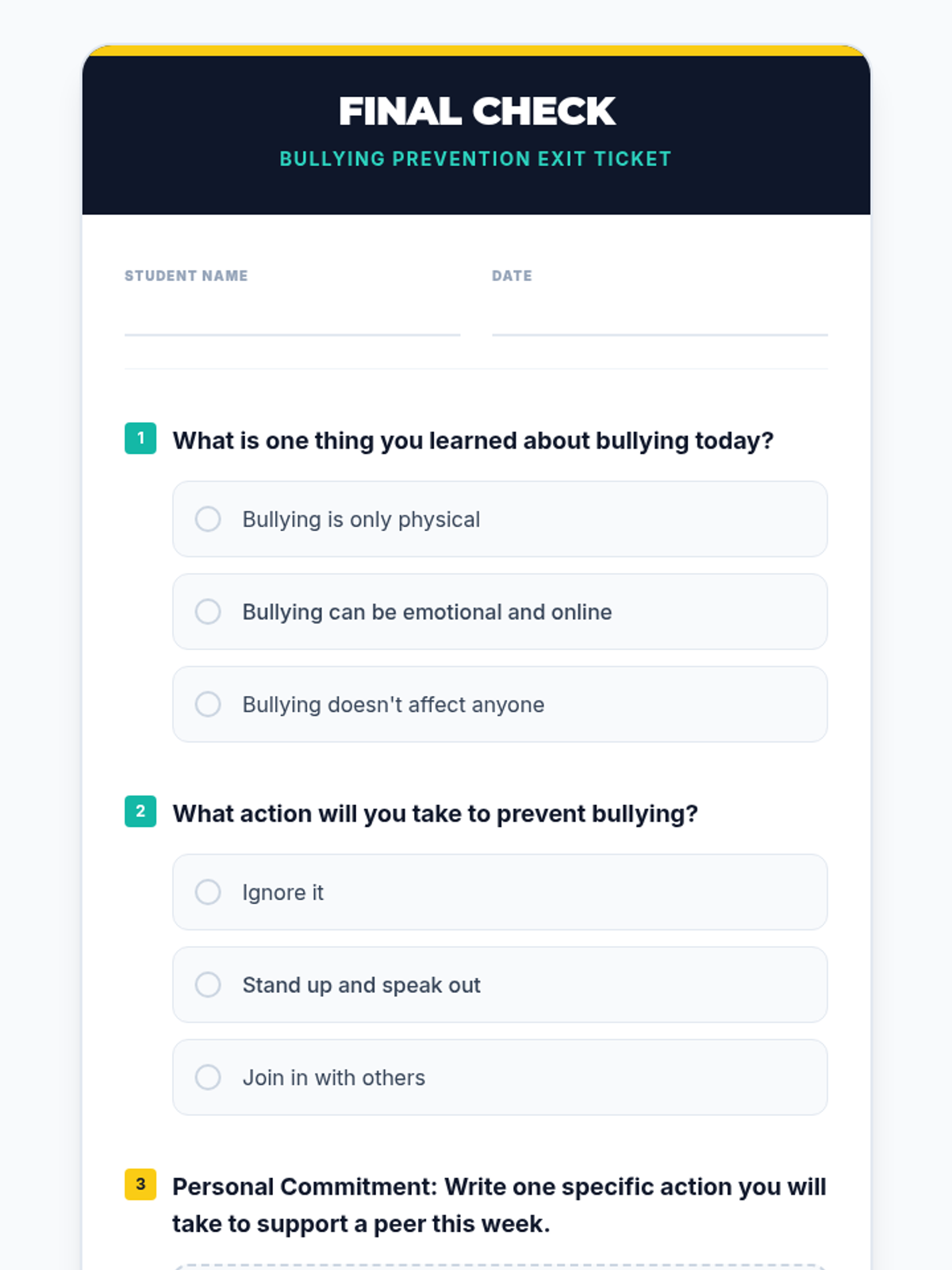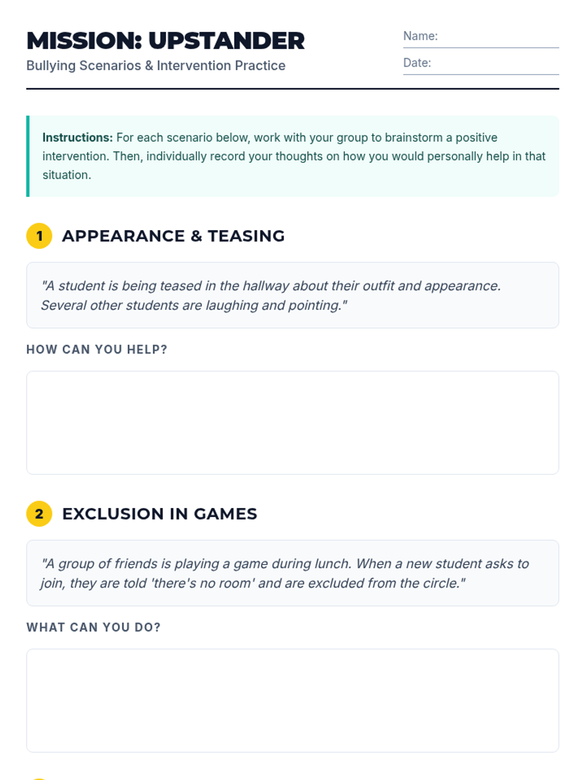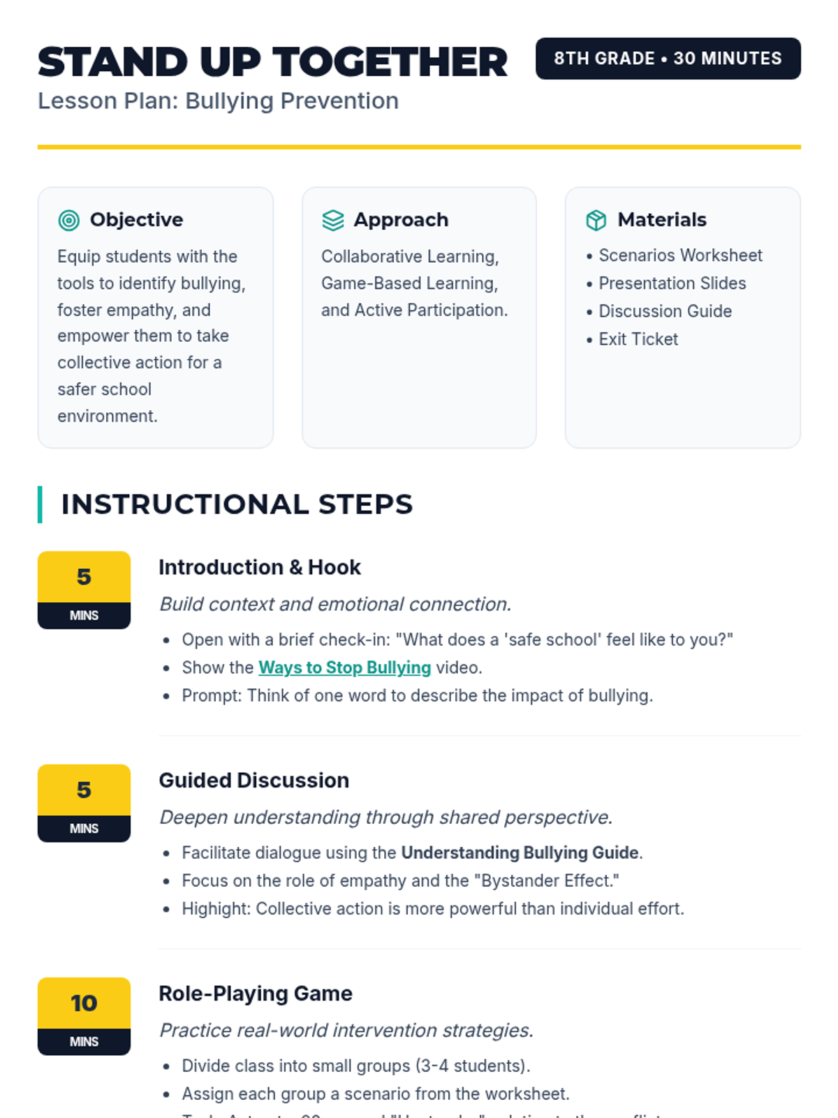 An 8th-grade lesson focused on bullying prevention using collaborative and game-based learning. Students analyze scenarios, engage in discussions, and reflect on their role in creating a safe school environment.