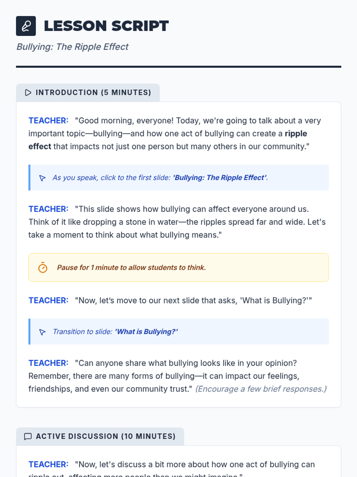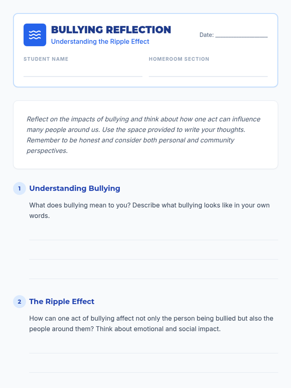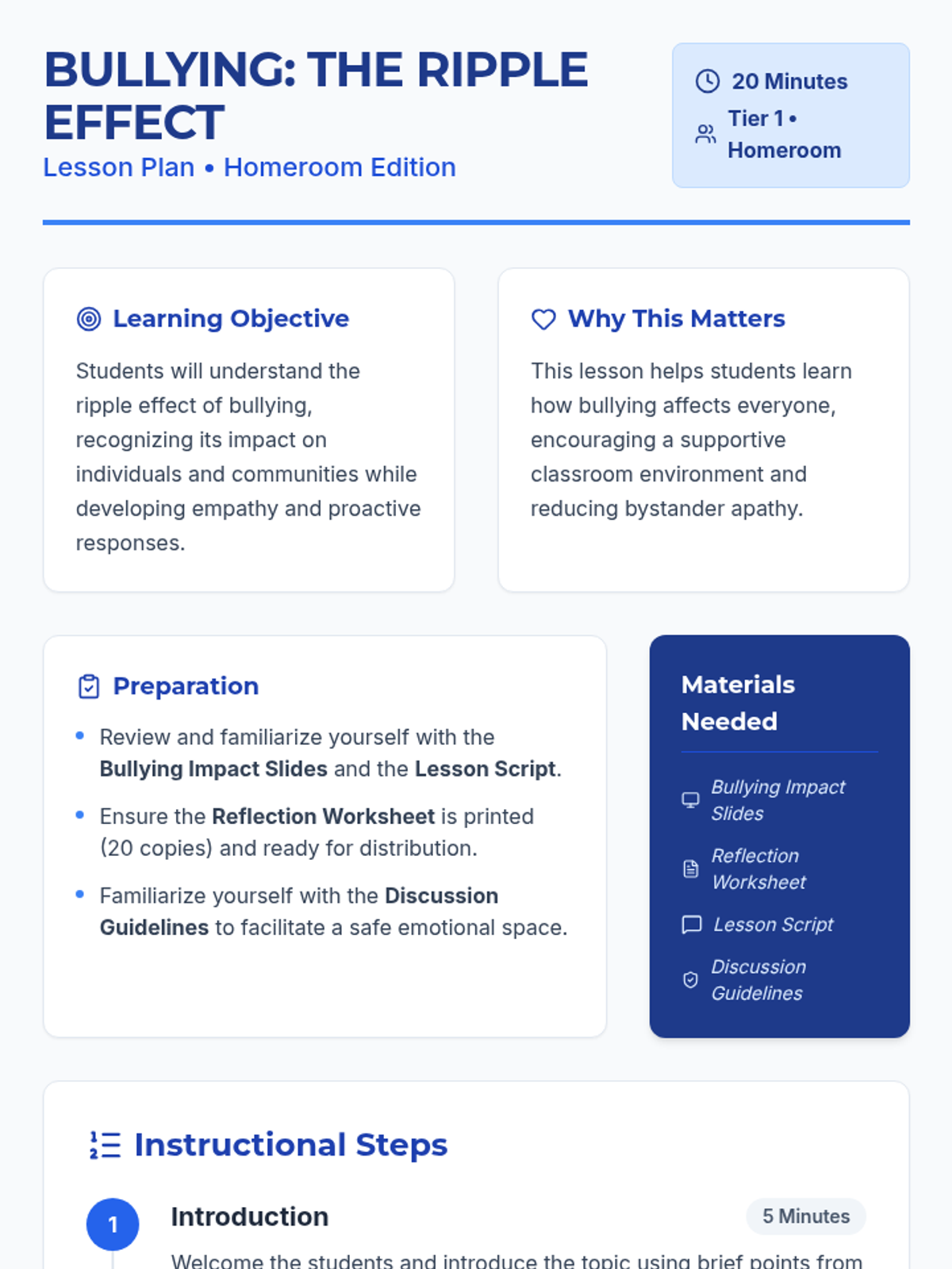 A 20-minute homeroom lesson designed to help students recognize the emotional and social 'ripple effect' of bullying, fostering empathy and a proactive stance toward creating a supportive community.