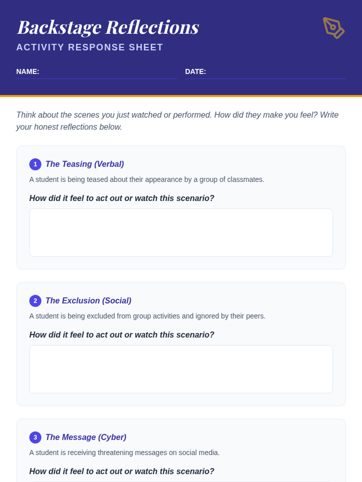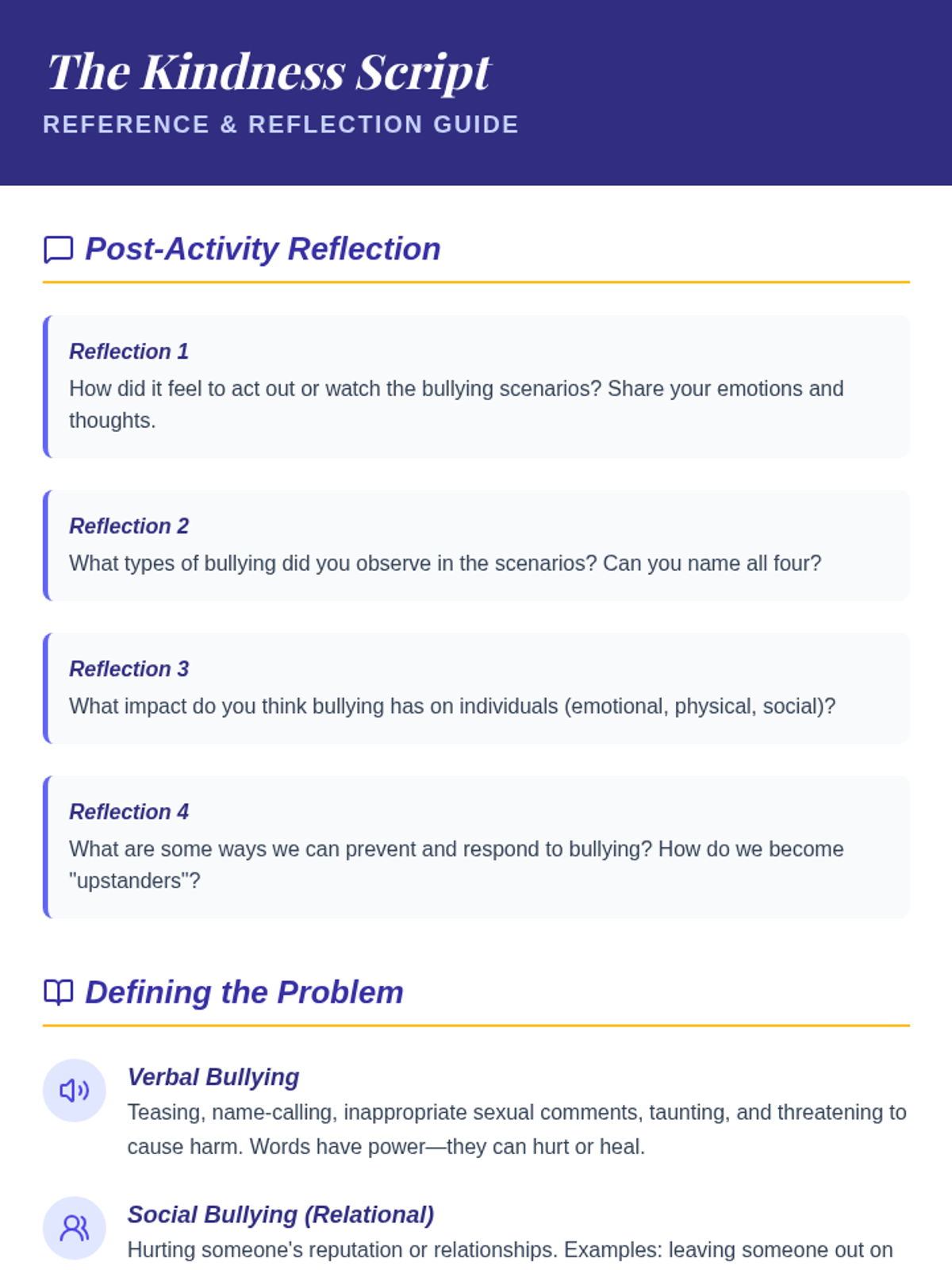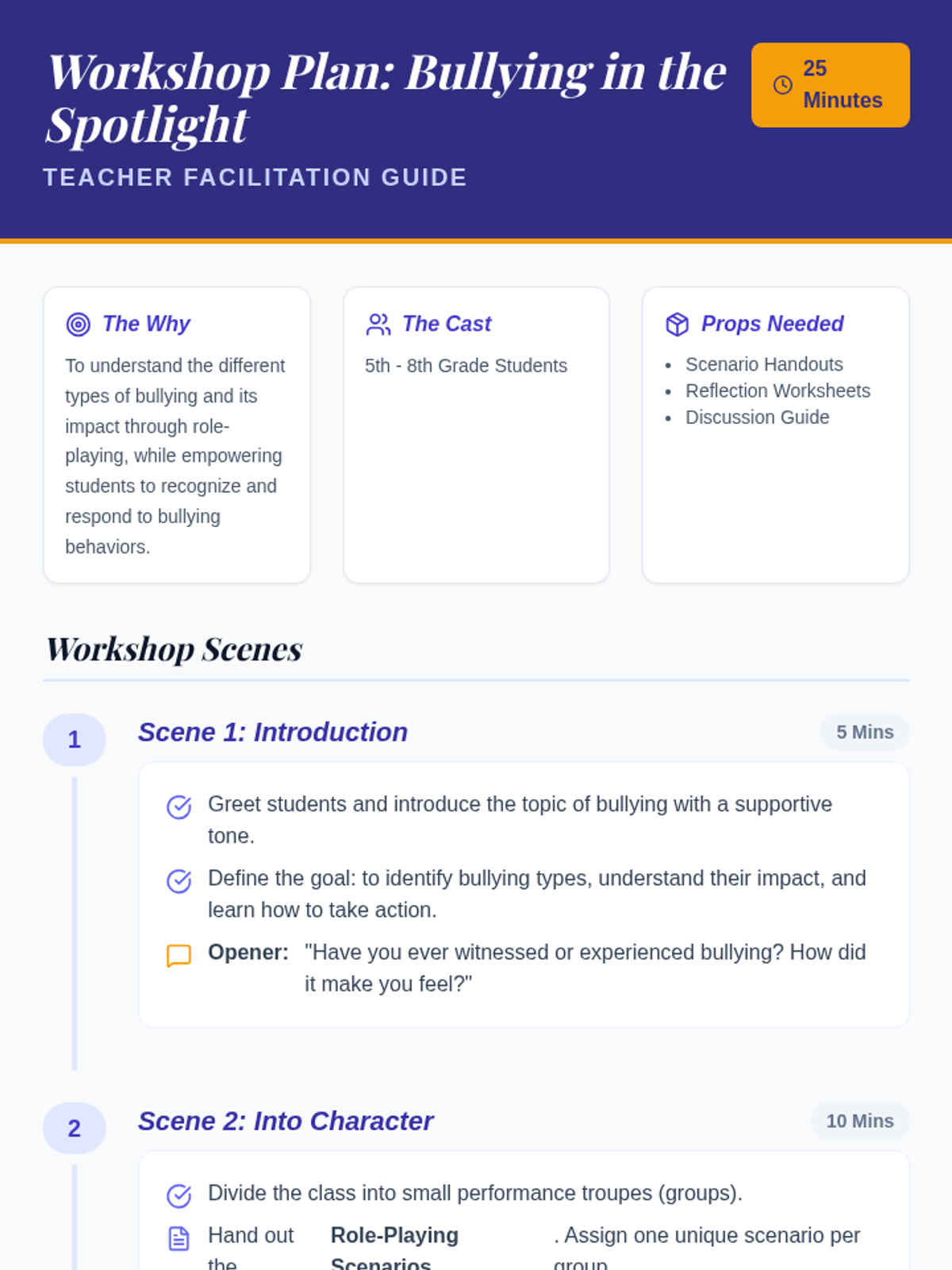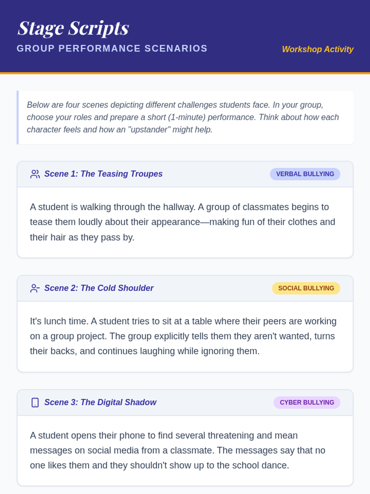 A 25-minute interactive workshop where students use role-playing to identify types of bullying and develop empathy and response strategies.