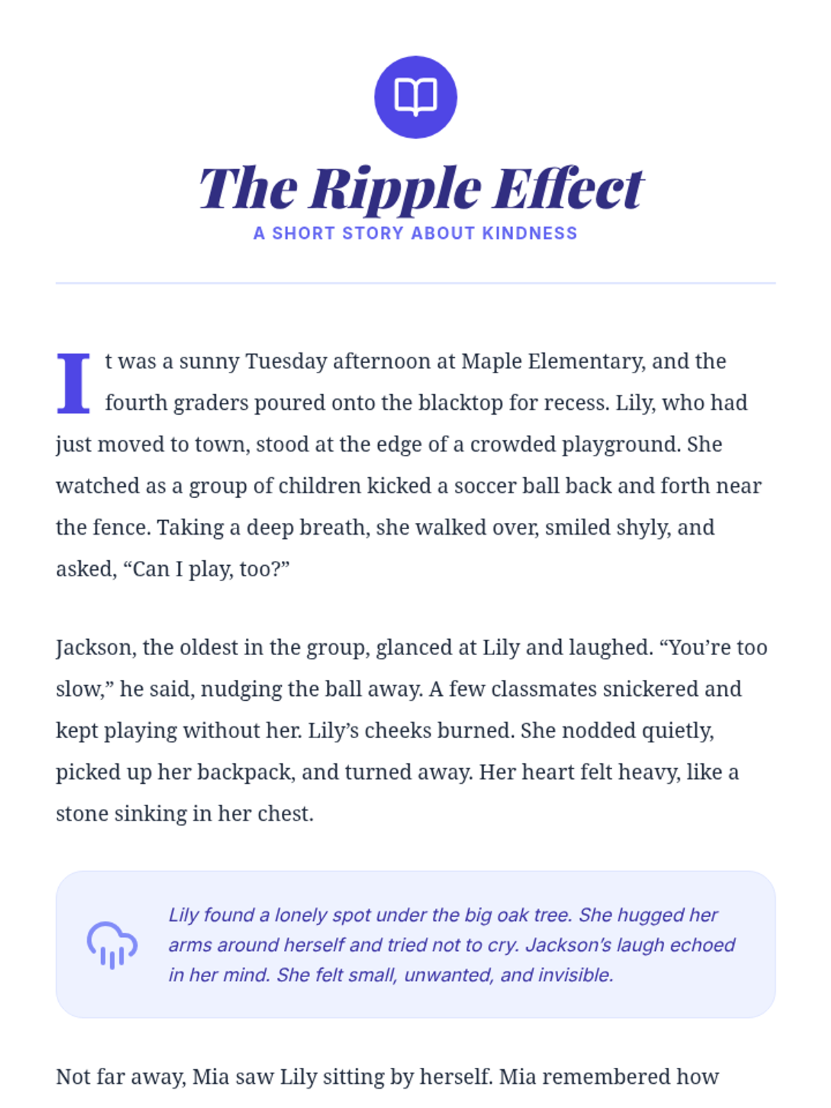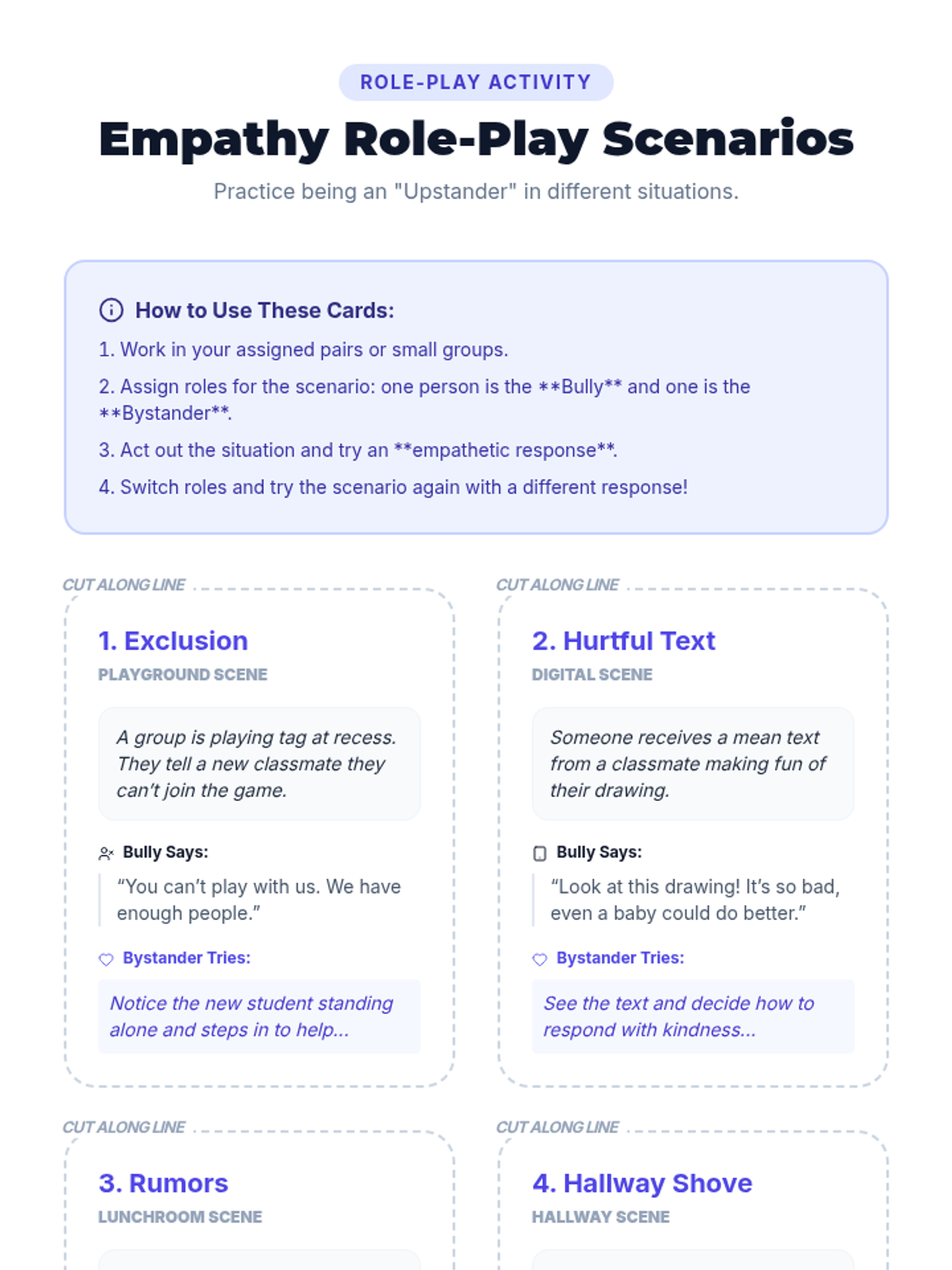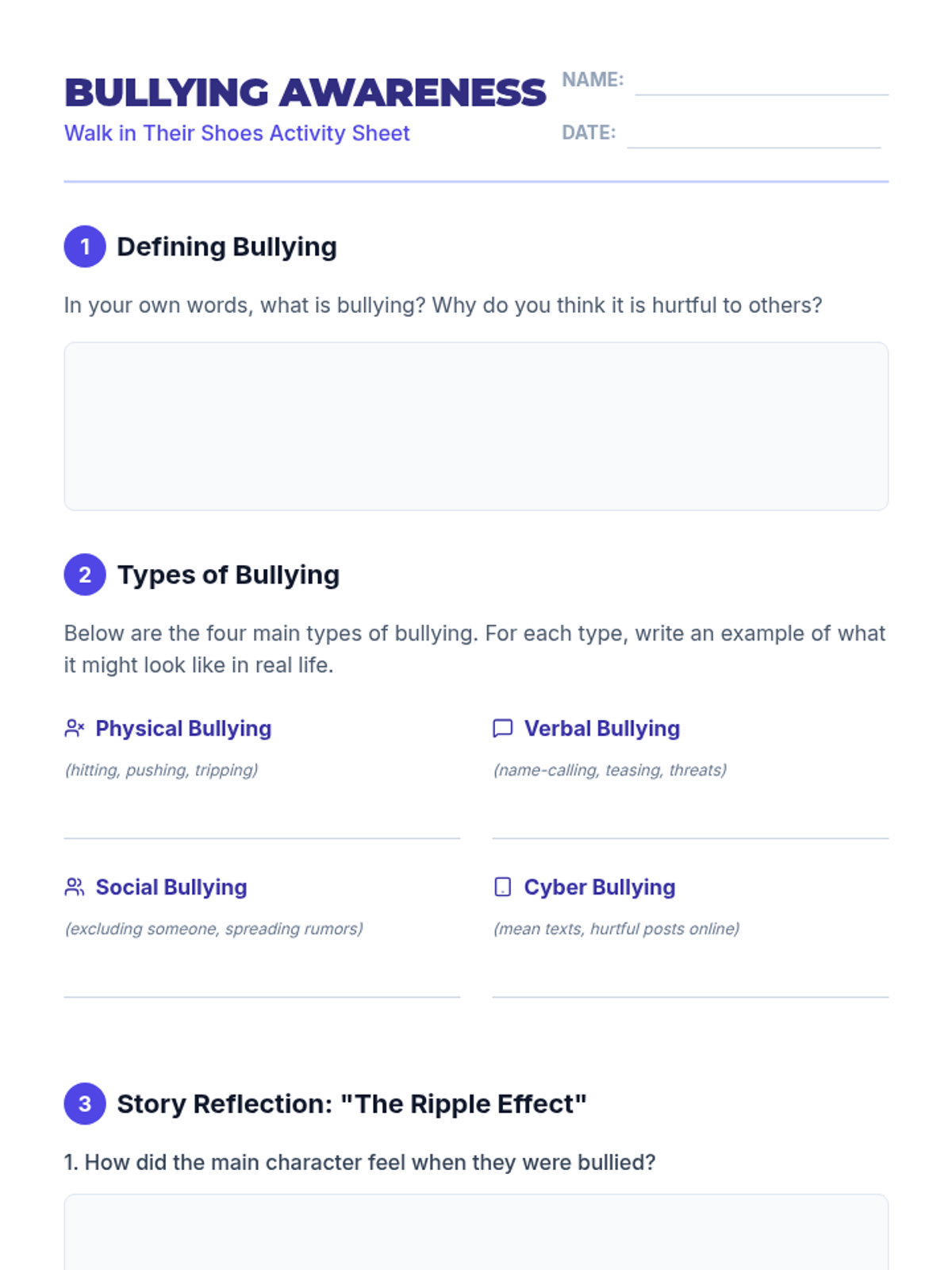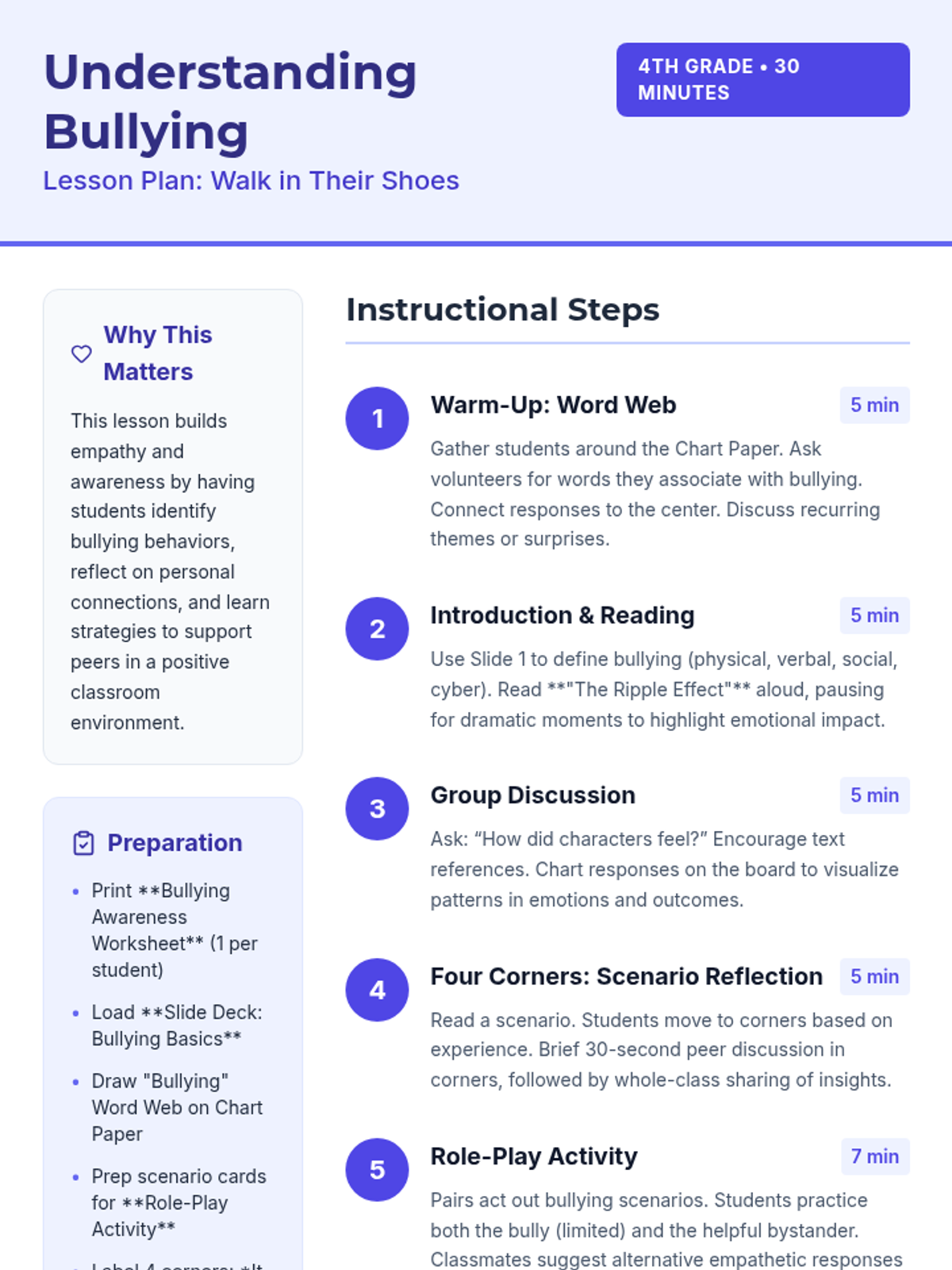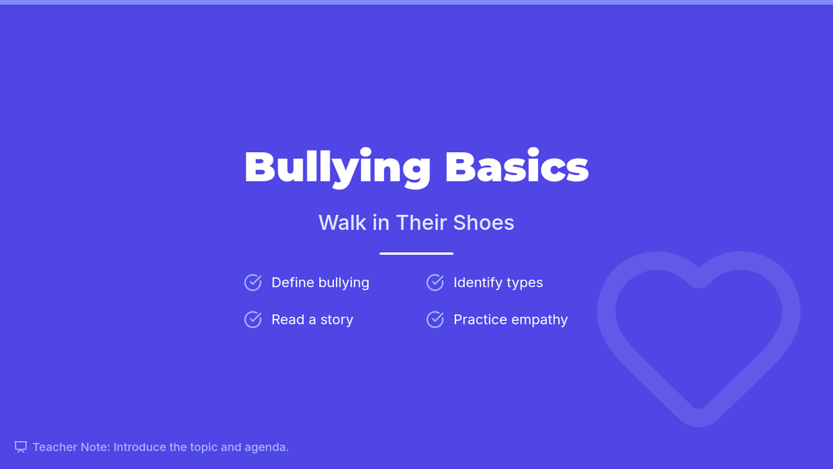 In this engaging 4th grade lesson, students explore what bullying is, its impact on others, and how empathy can stop it. Through reading, activities, and reflection, participants will learn to recognize bullying behaviors and practice kindness in everyday situations.
