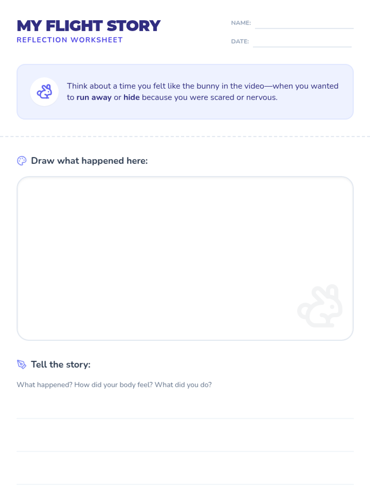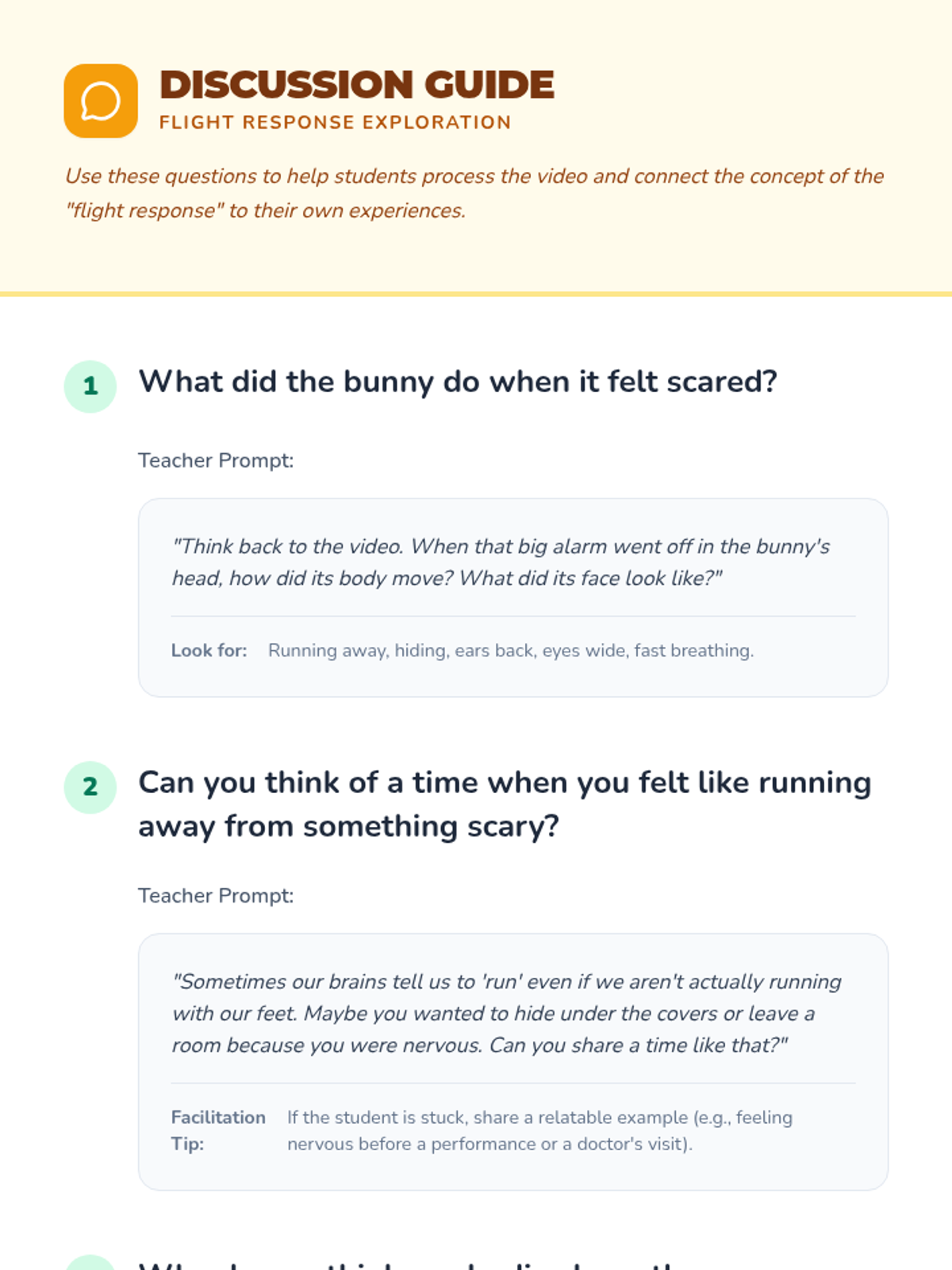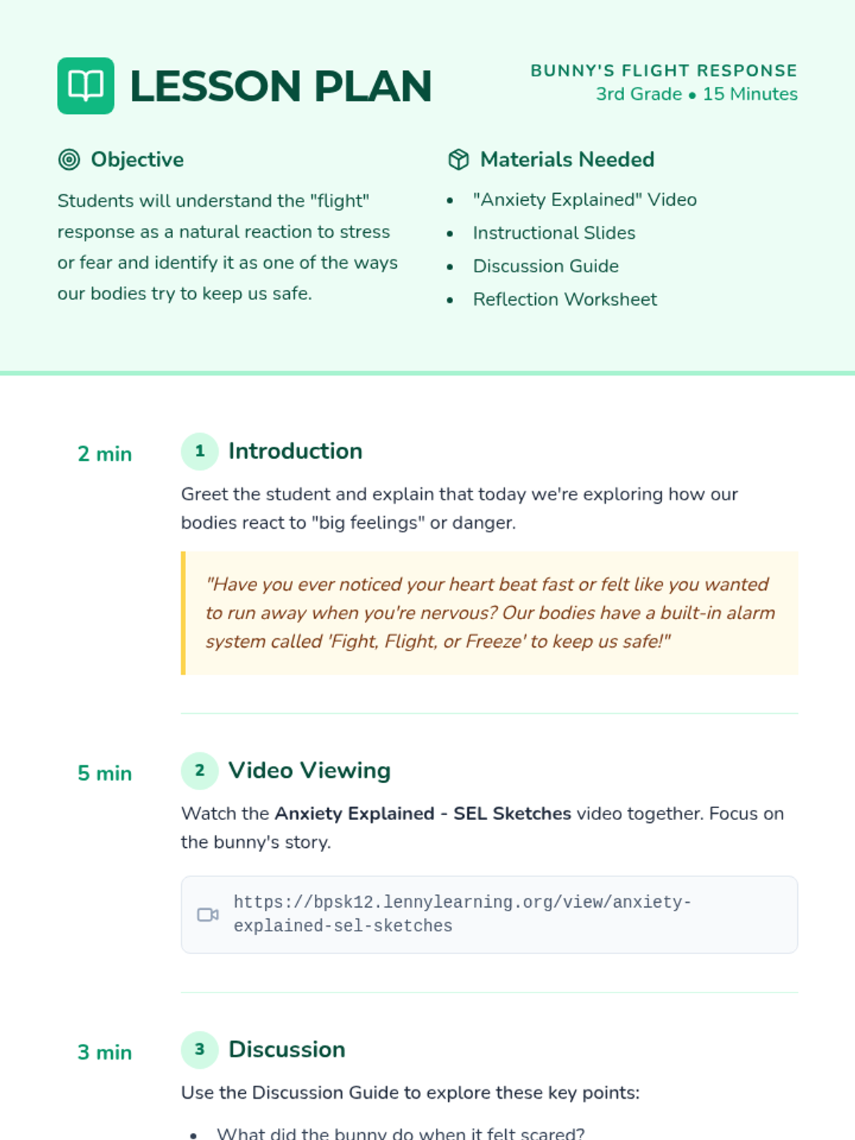 This lesson introduces the flight response using a bunny metaphor to help 3rd graders understand anxiety and self-regulation. Students will watch a video, engage in a grounding activity, and reflect on their own experiences.