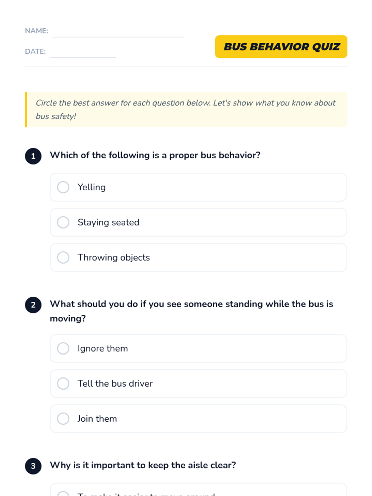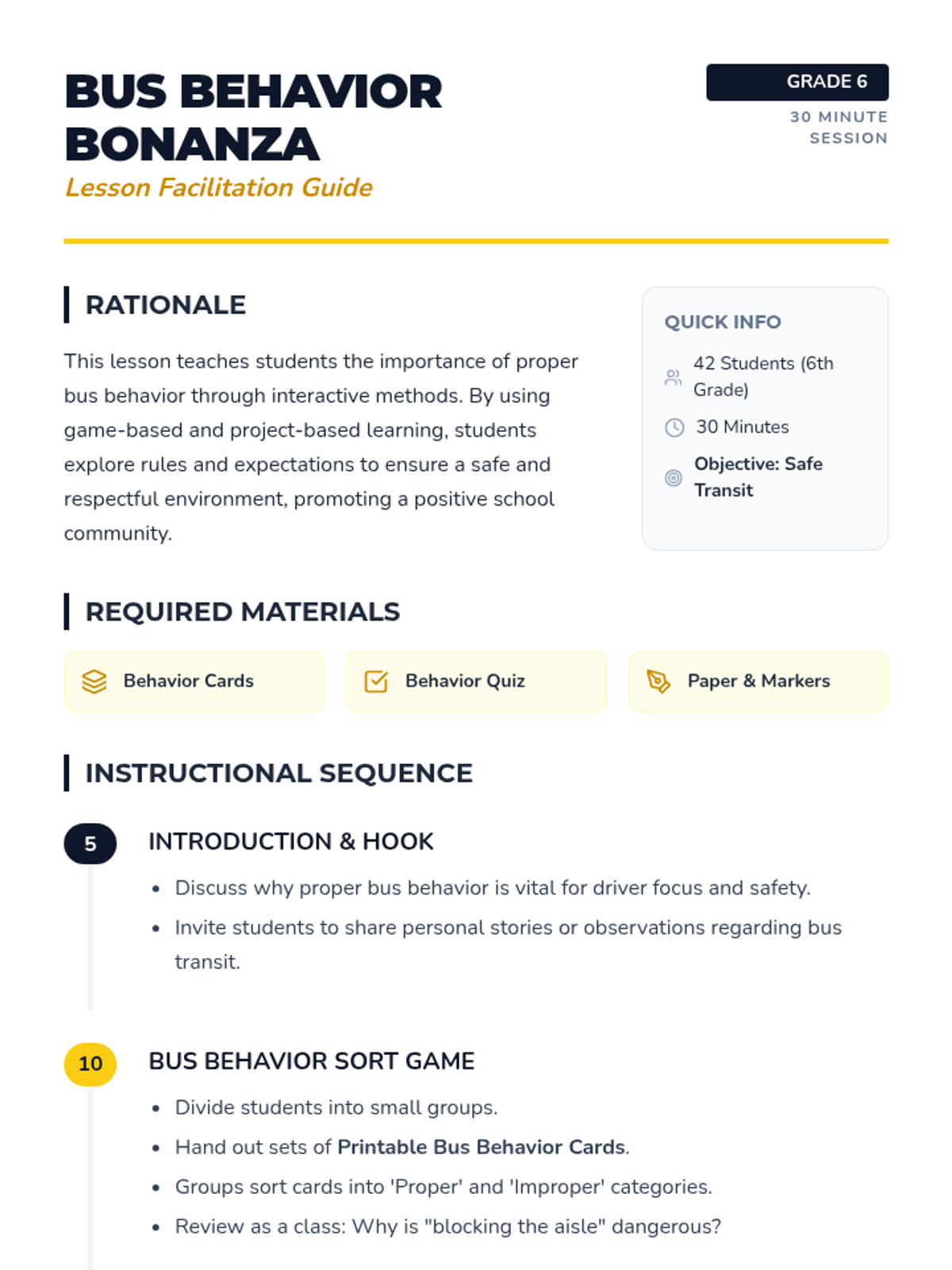 An interactive 30-minute lesson for 6th graders on school bus safety and etiquette using game-based and project-based learning. Students sort behaviors, create rule-based projects, and demonstrate their understanding of safe transit.