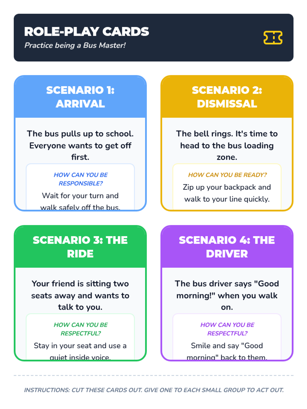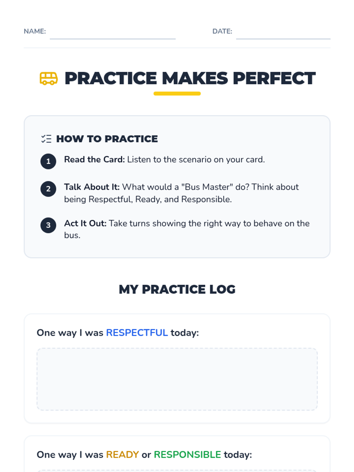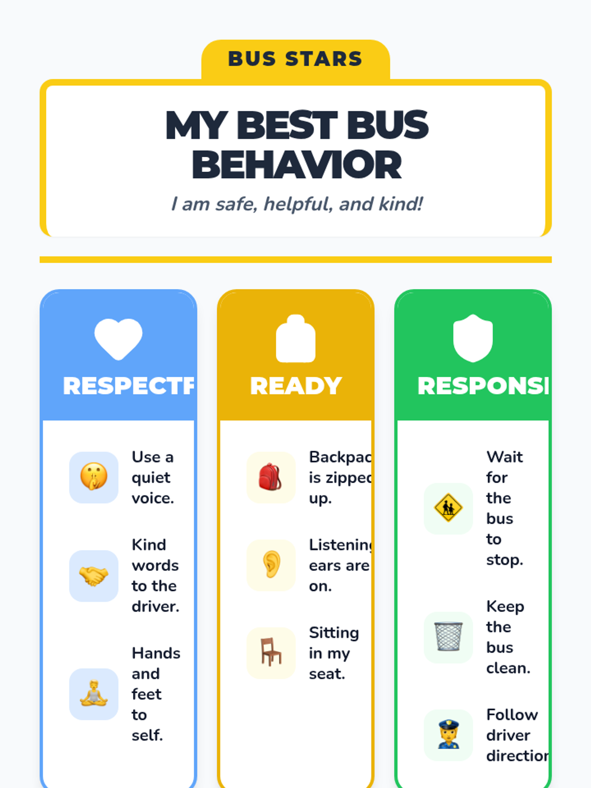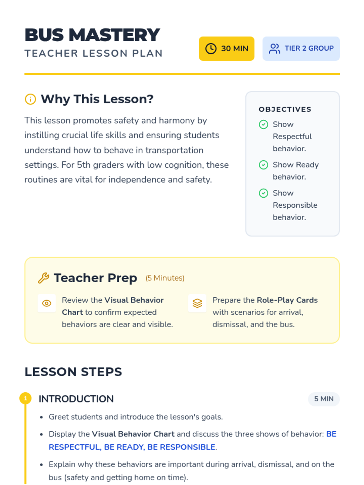 A 30-minute Tier 2 group lesson for 5th-grade students with low cognition to learn and practice respectful, ready, and responsible behaviors during school transportation transitions.
