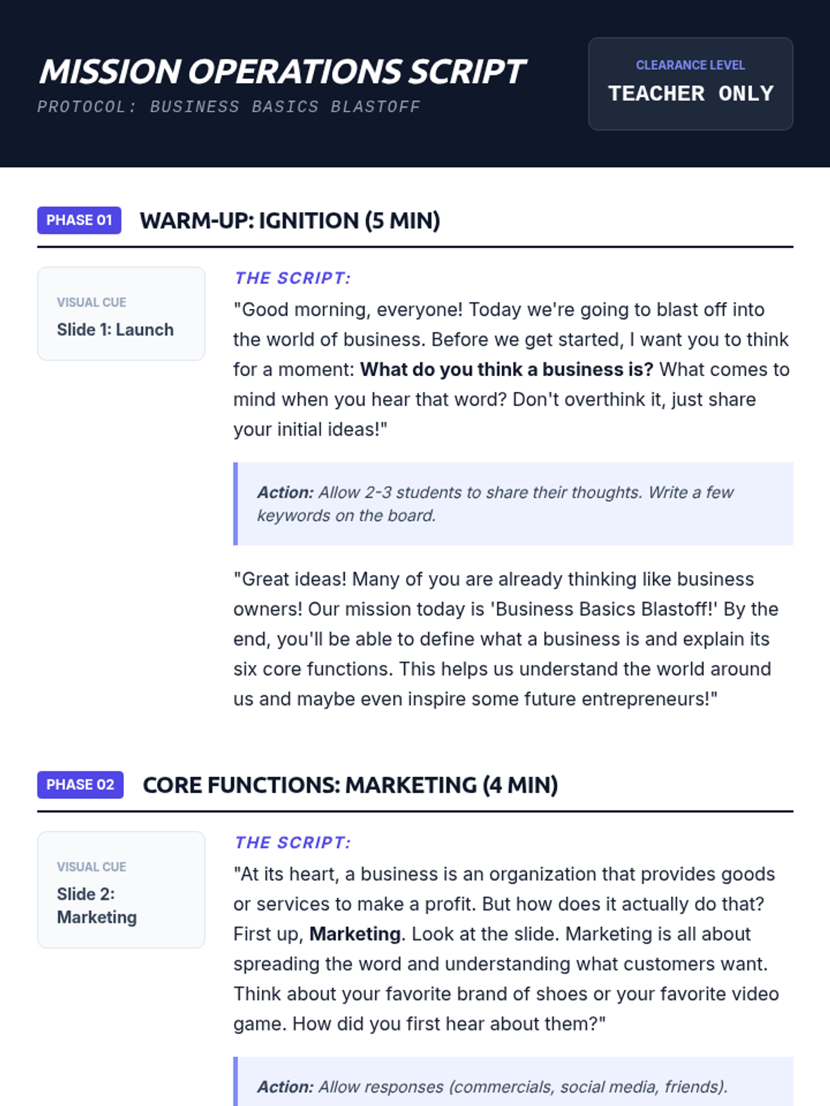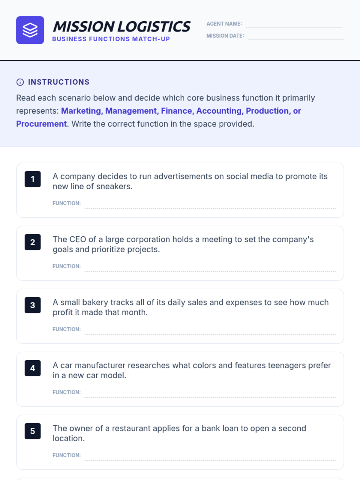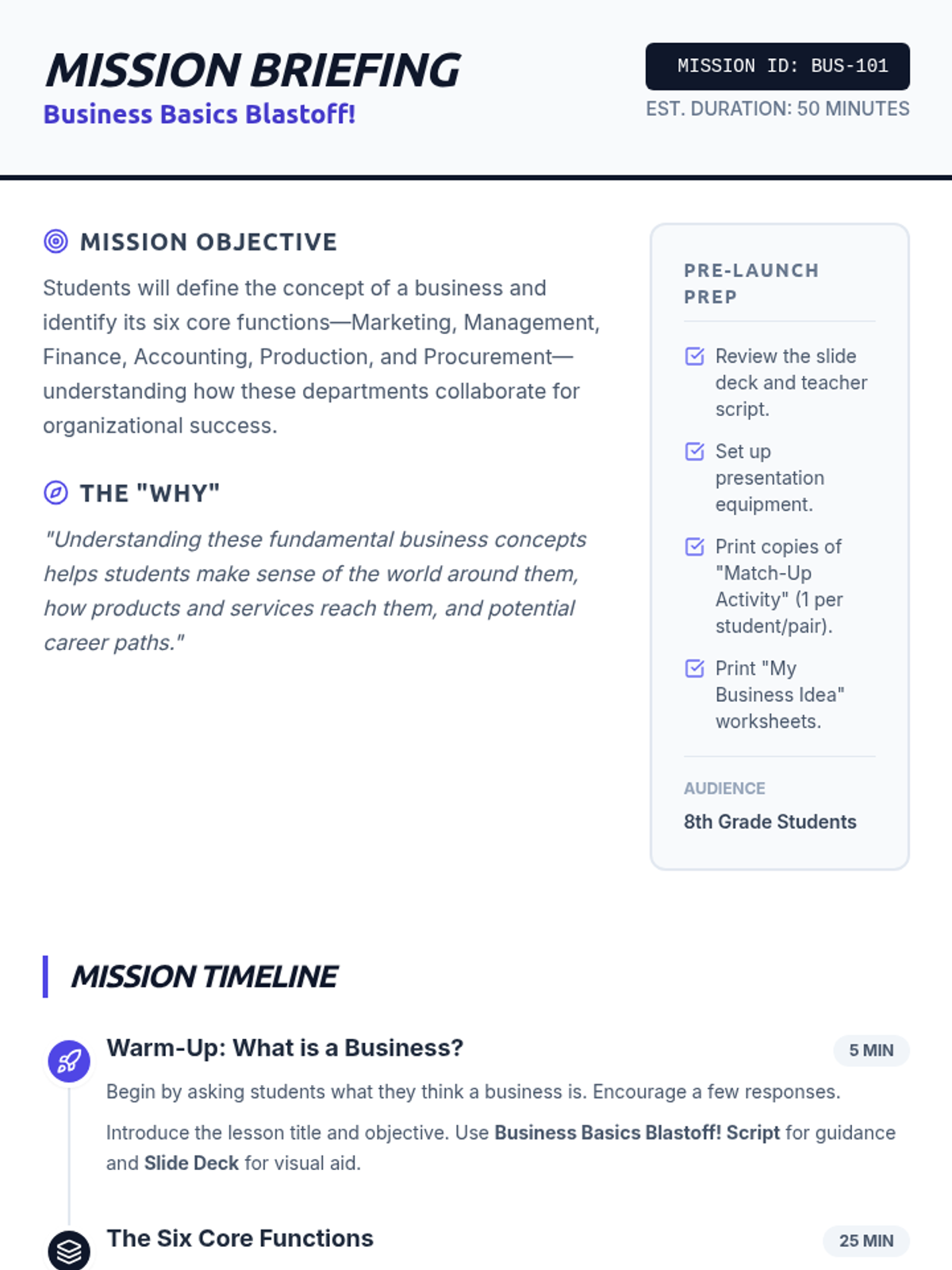 An introductory business lesson for 8th graders covering the definition of a business and its six core functions: Marketing, Management, Finance, Accounting, Production, and Procurement. Students engage through a themed presentation, a matching activity, and a creative brainstorming session.